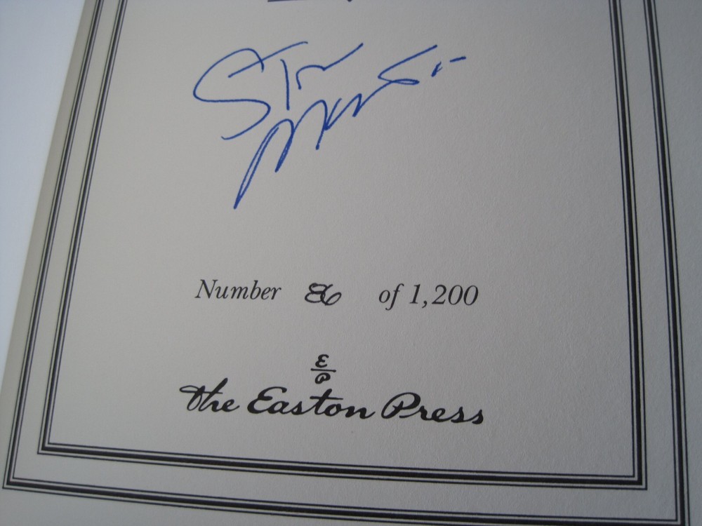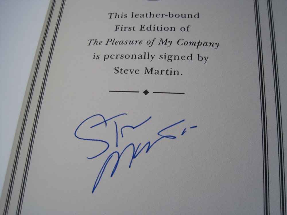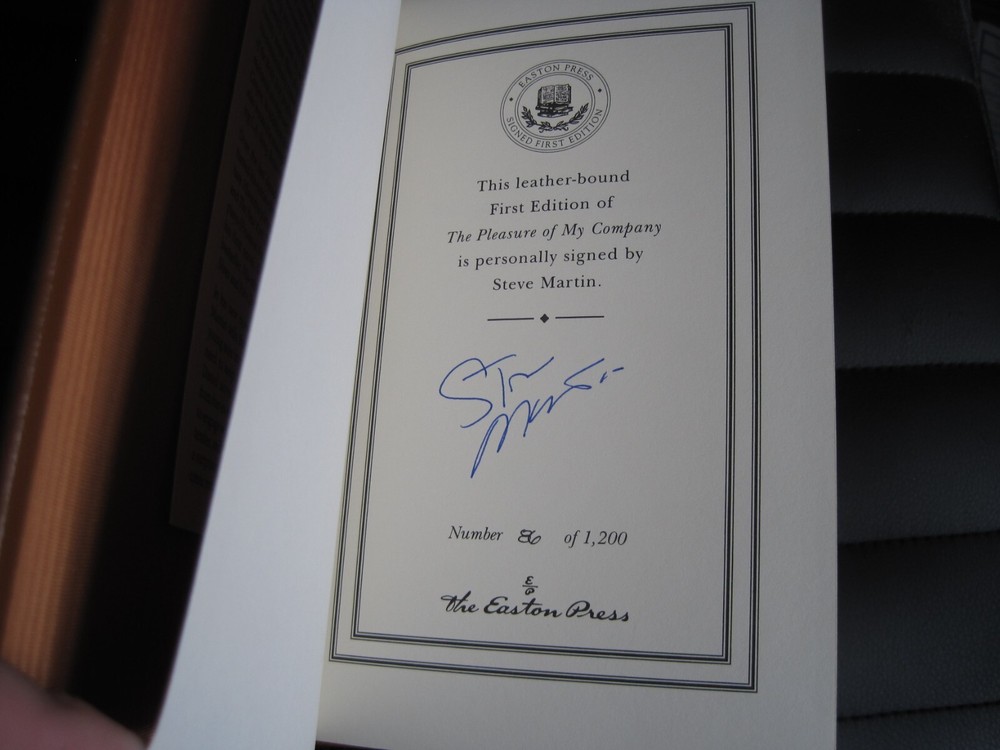 This is a leather bound signed first edition of Steve Martin's best-selling memoir - "The Pleasure Of My Company", a fascinating book written by the famous Hollywood actor, comedian, and Saturday Night Live host . The book is new, unread, and in great condition. Signed by the famous Hollywood star on the limitation page, this is copy number 86 of only 1200 ever printed. The book includes the signed and dated certificate of authenticity and the publisher's note card. Easton Press books are the golden standard in the publishing industry, highly collectible and lasting generations. Easton Press Full Genuine Leather Dubbed Spine Accented Wit 22 kt. Real Gold Satin Ribbon Page Marker Distinctive Cover Design Gilded Page Edges To Protect Against Humidity High Quality Acid - Free paper Smyth-Sewn Pages Silk-Moire Endleaves I combine multiple items for savings on shipping charges. I ship worldwide. Please ask about international shipping charges and/or different shipping options. Please check out my other auctions for several rare signed books for sale. Thank you!