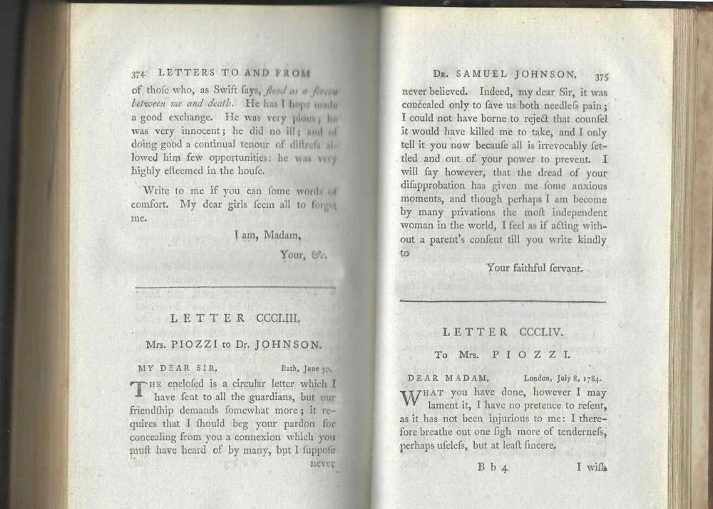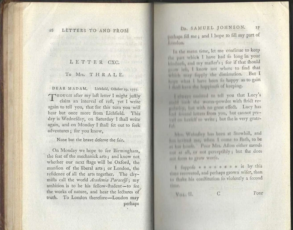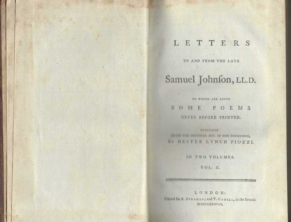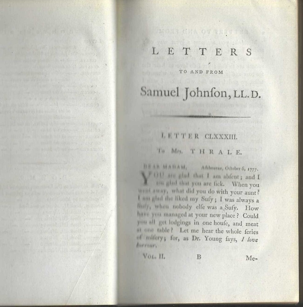 UP FOR AUCTION: RARE BOOK: LETTERS TO AND FROM THE LATE SAMUEL JOHNSON LL.D. to Which Are Added Some Poems Never Before Printed. Volume II only (of 2 Volumes) by Samuel Johnson, compiled by Hester Piozzi Thrale, Published by Strahan and Cadell, the Strand, London, UK, 1788, 1788 Edition, First Edition, Full Leather Book, 11 preface pages + 424 pages = 435 total pages, This is an antique, 1788, book of letters of Samuel Johnson. It was compiled by Samuel Johnson's dear friend, Mrs. Hester Piozzi Thrale (wife of Henry Thrale). It consists of letters from 1777 to 1784, numbered 183 to 367. And it contains 10 poems. The book is very beautiful, legible and solid: an interesting, antique, 1788 book. See ebay pics above for actual book. Very Good Condition [ Cover-corners are slightly bumped, spine is slightly scraped, back cover-edges are slightly scraped (see pics), front endpapers and first 5 pages are foxed (up to/including Title Page; see pics), rear endpaper and last 5 pages are foxed (back to/including Page 422; see pics); otherwise, book is very clean, unmarked by former owners, well-bound in full leather and gilt, tight with strong hinges, solid and sharply printed ] 11 preface pages + 424 pages = 435 total pages, approx. 8.5" x 5.5" x 1.25", full leather covers and spine, gilded and decorated spine titles, gilded cover-edges, top-edge gilt, Leather Book Welcome international ebay shoppers. I will reduce combined shipping on multiple purchases. Domestic shipping will include tracking. Please visit my other auctions, and email any questions. Thanks for looking! I try to describe my items thoroughly, but buyers may still need more information than I provide. Shipping costs can be expensive to my small auction business. Please ask any questions to be sure before you buy. Thanks.