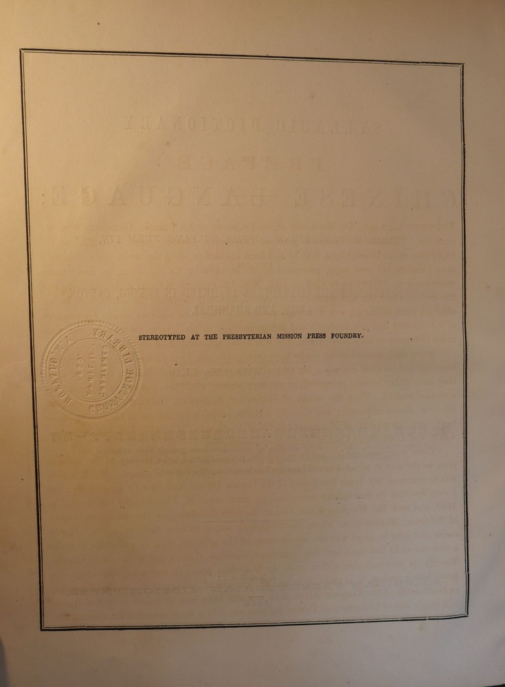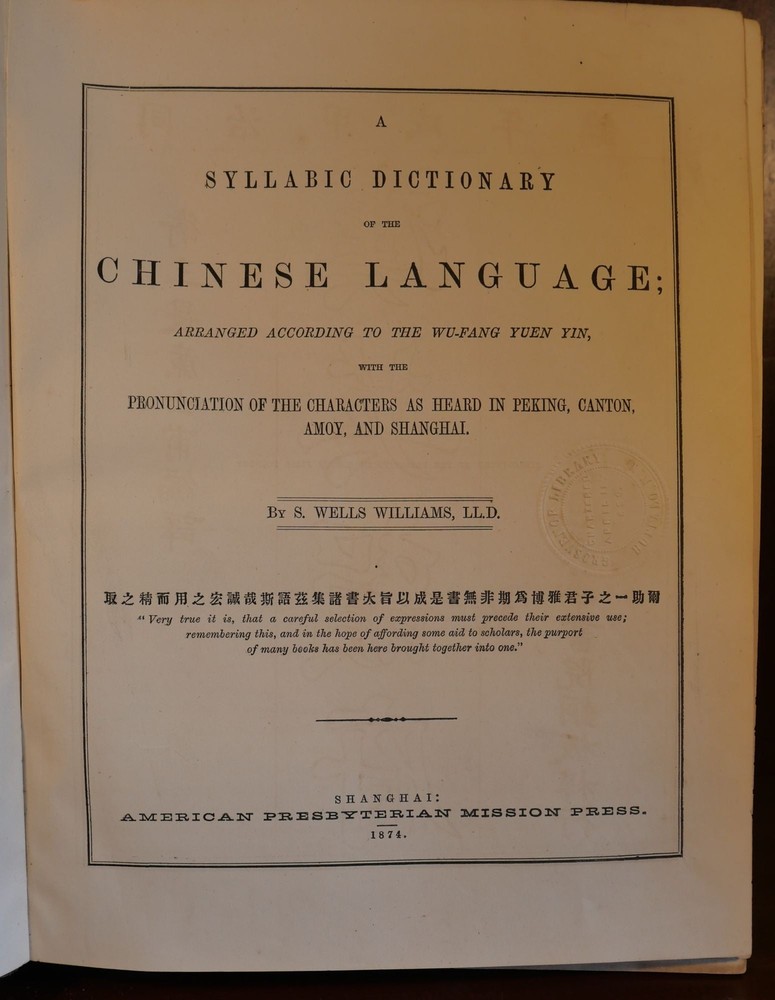 A Syllabic Dictionary of the Chinese Language; Arranged According to the Wu-Fang Yuen Yin, with the Pronunciation of the Characters as Heard in Peking, Canton, Amoy, and Shanghai Author: Samuel S. Wells Williams Title: A Syllabic Dictionary of the Chinese Language; Arranged According to the Wu-Fang Yuen Yin, with the Pronunciation of the Characters as Heard in Peking, Canton, Amoy, and Shanghai Publication: Shanghai: American Presbyterian Mission Press, 1874 Edition: First Edition Description: First edition, ex-library copy with usaual indicators present. Measuring approximately 10.75" x 8.5" with 1,252 numbered pages. Moderate chipping to the leather spine and to the board edges. Moderate staining to the edges of the textblock. Interior pages are clean. Please view the many other rare titles available for purchase at our store. We are always interested in purchasing individual or collections of fine books. Inventory # (O10-18). Seller ID: 6648 Subject: History , Reference/Textbooks Ernestoic Books Terms All orders ship within two business days. Standard mail is USPS Media Mail. Expedited and international shipping are also available. We offer combined shipping on multiple orders. All items are guaranteed to be as described or they may be returned within 30 days of receipt for a full refund. This listing was created by Bibliopolis.