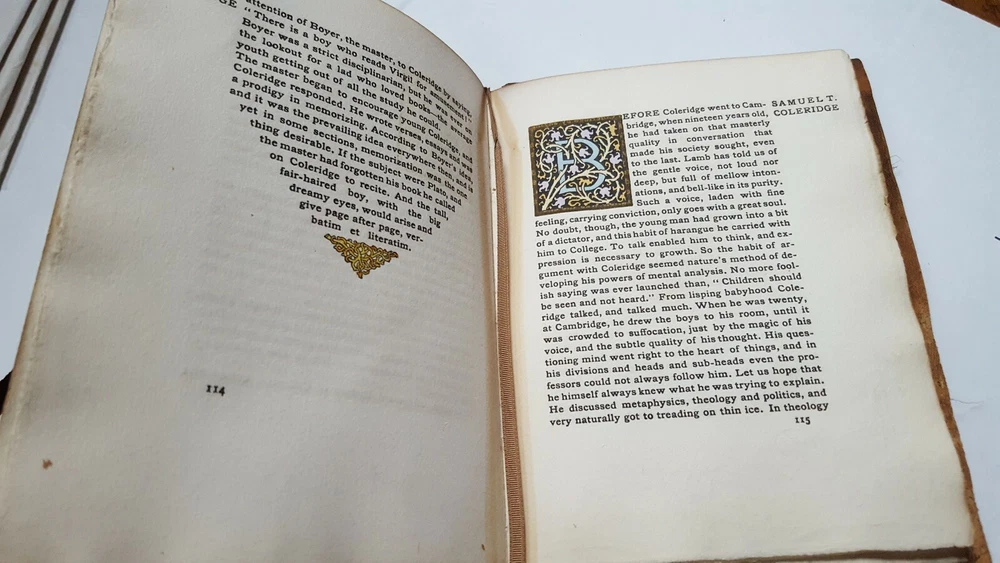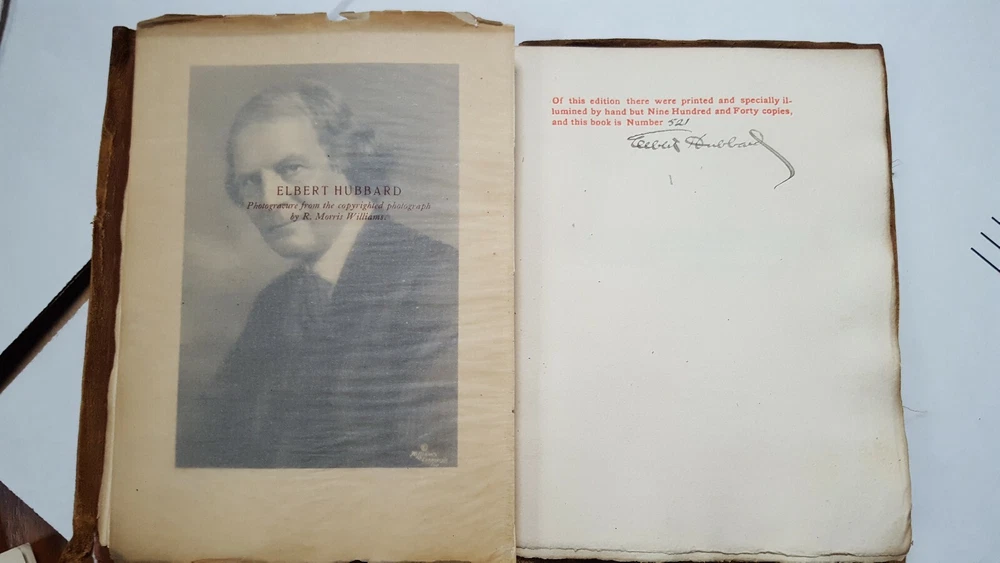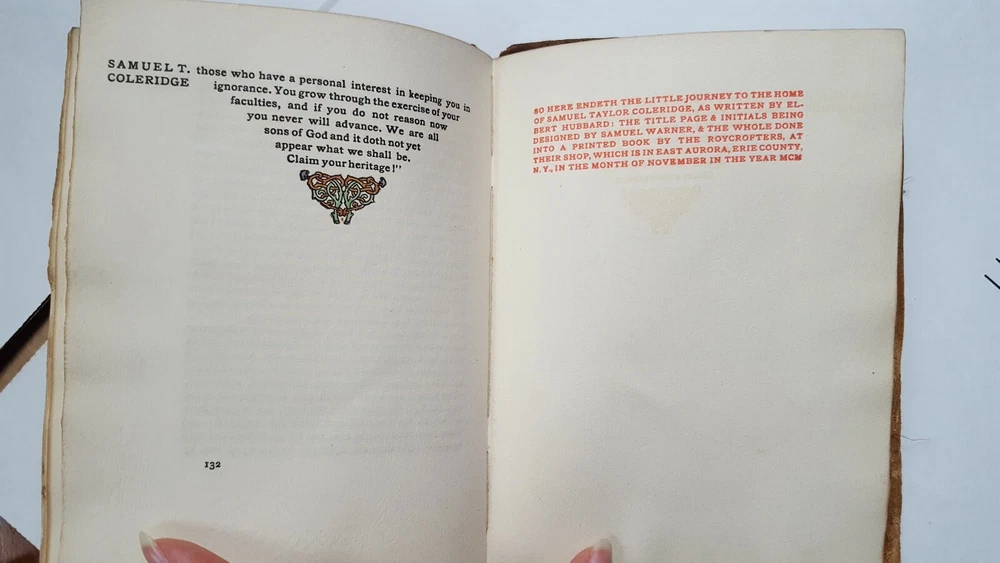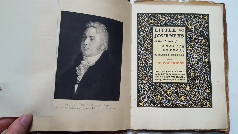 Little Journeys to homes of English Authors: Samuel Taylor Coleridge Contains portraits of the subject and author Authored and signed by Elbert Hubbard - 521st copy out of 940 copies of this edition. Printed by the Roycrofters in 1900. It feels like a handmade book, some of the pages are imprinted with "Roycrofters". Copyright 1899 Suede bound Please examine the photos to ascertain the book's condition. Combined shipping available