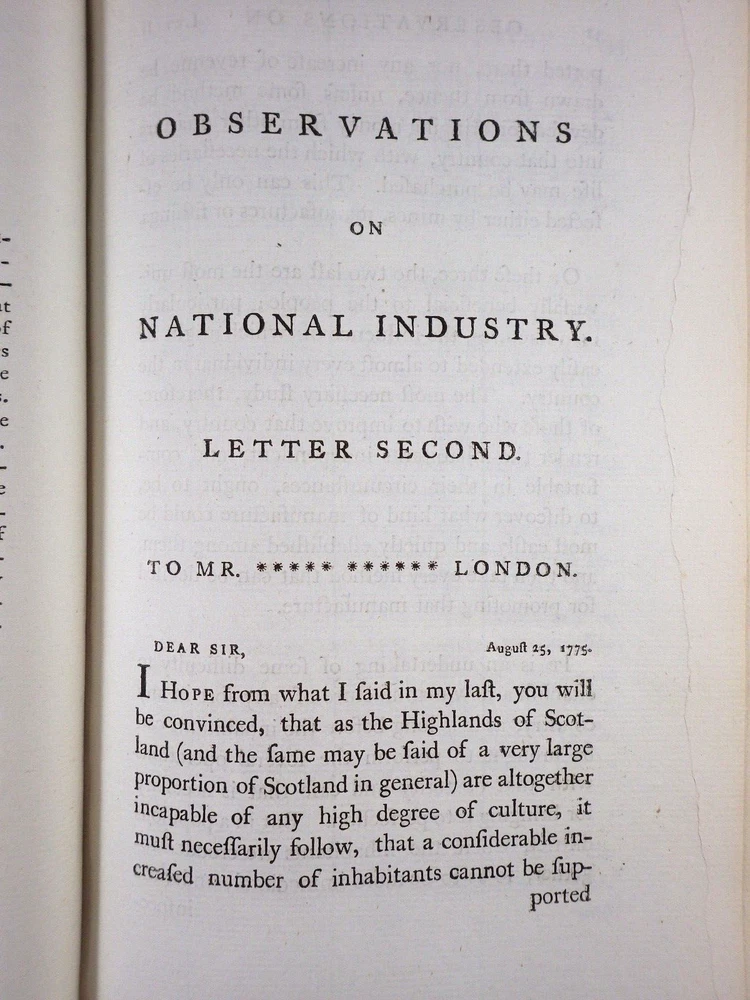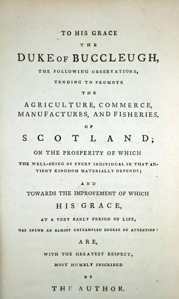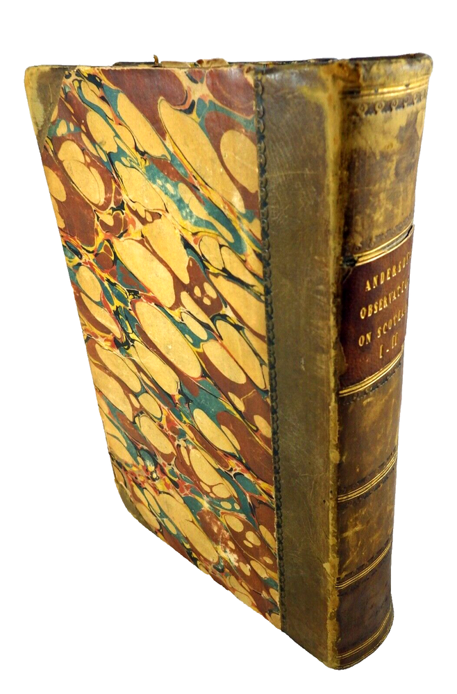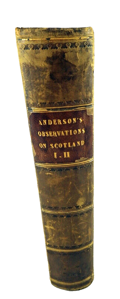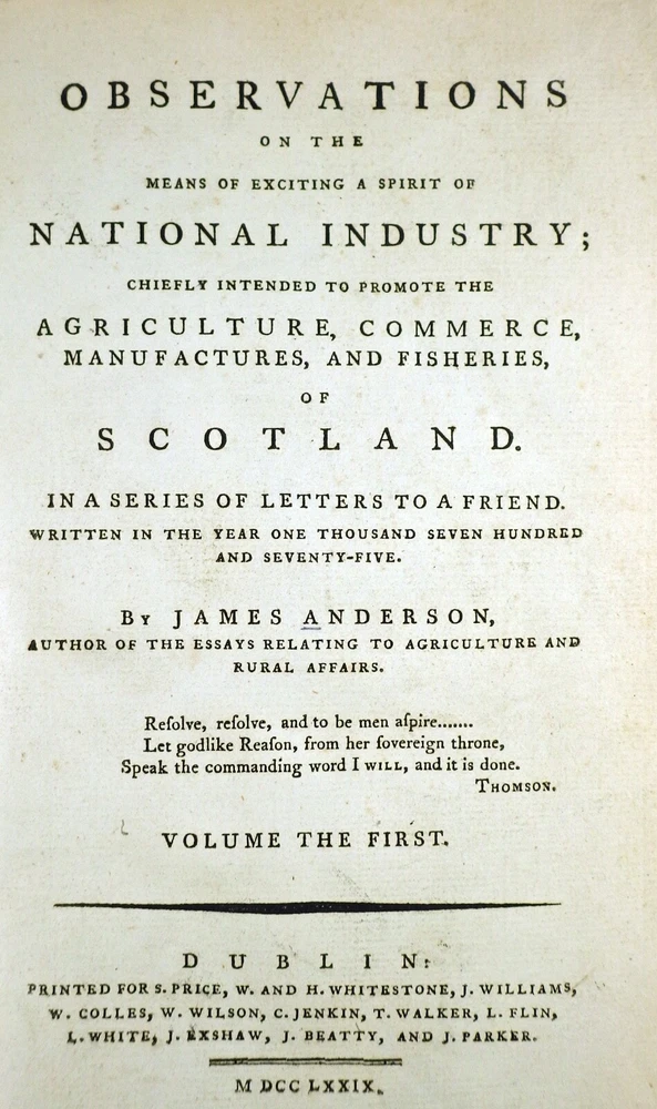Description Observations on the means of exciting a spirit of national industry; chiefly intended to promote the agriculture, commerce, manufactures, and fisheries, of Scotland. James Anderson. Volume 1, Dublin, 1779. Printed for S. Price, W. and H. Whitestone, J. Williams, etc. Volumes I and II bound into one. Quarter leather and marbled boards. lxvii, 424pp. Gilt bands on spine with gilt title on red. This is the first Irish edition of "Observations ..." which was originally published in Edinburgh in 1777. The work contains one of the earliest critiques of Smith's "Wealth of Nations". Condition Some scuffing to leather; a section on front scraped. Bookplate on front pastedown. Pages tight, crisp, and bright. Very good. About this book Observations on the means of exciting a spirit of national industry; chiefly intended to promote the agriculture, commerce, manufactures, and fisheries, of Scotland. James Anderson FRSE FSA(Scot) (1739 – 15 October 1808) was a Scottish agriculturist, journalist and economist. A member of the Edinburgh Philosophical Society, Anderson was a prominent figure in the Scottish Enlightenment. He invented the Scotch plough. Some historians believe Anderson was the root source for Marx's critique of capitalist agriculture. In 1777 Anderson published An Enquiry into the Nature of the Corn Laws in which he introduced what was to become the Malthusian/Ricardian theory of rent. In Marx's view, Anderson's original model was far superior to the variant later offered by the classical economists Thomas Malthus and David Ricardo since it placed strong emphasis on the possibility of continuing agricultural improvement. Anderson published his two most famous tracts in 1777, the Observations and the Inquiry, in which he introduced the differential theory of rent based on the extensive margin.