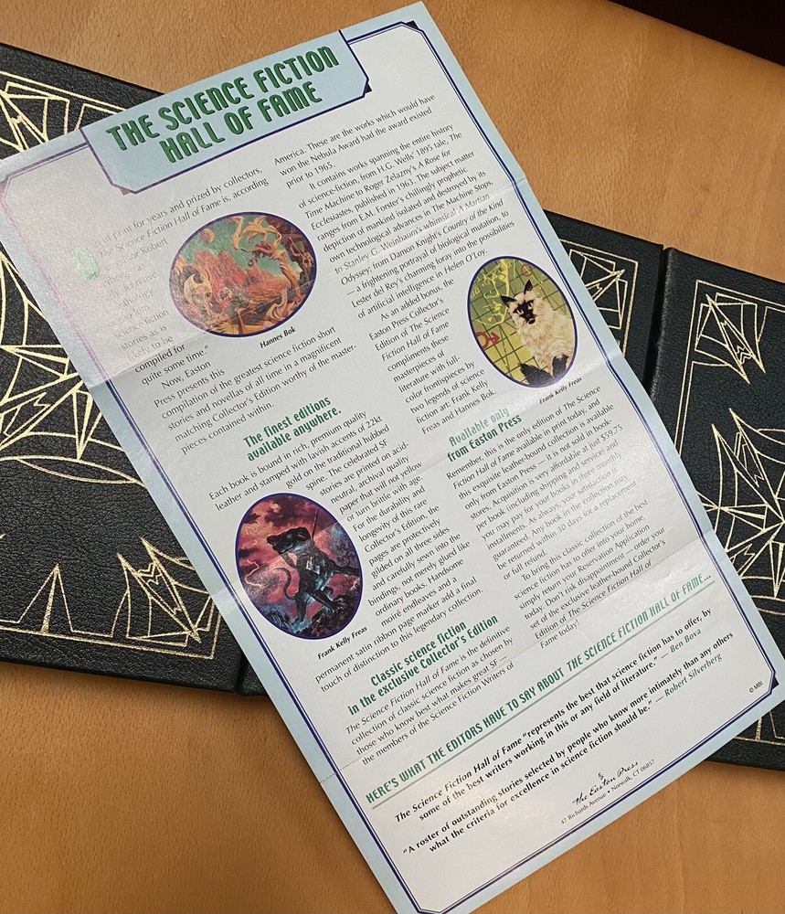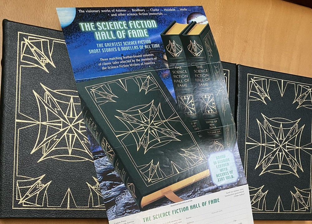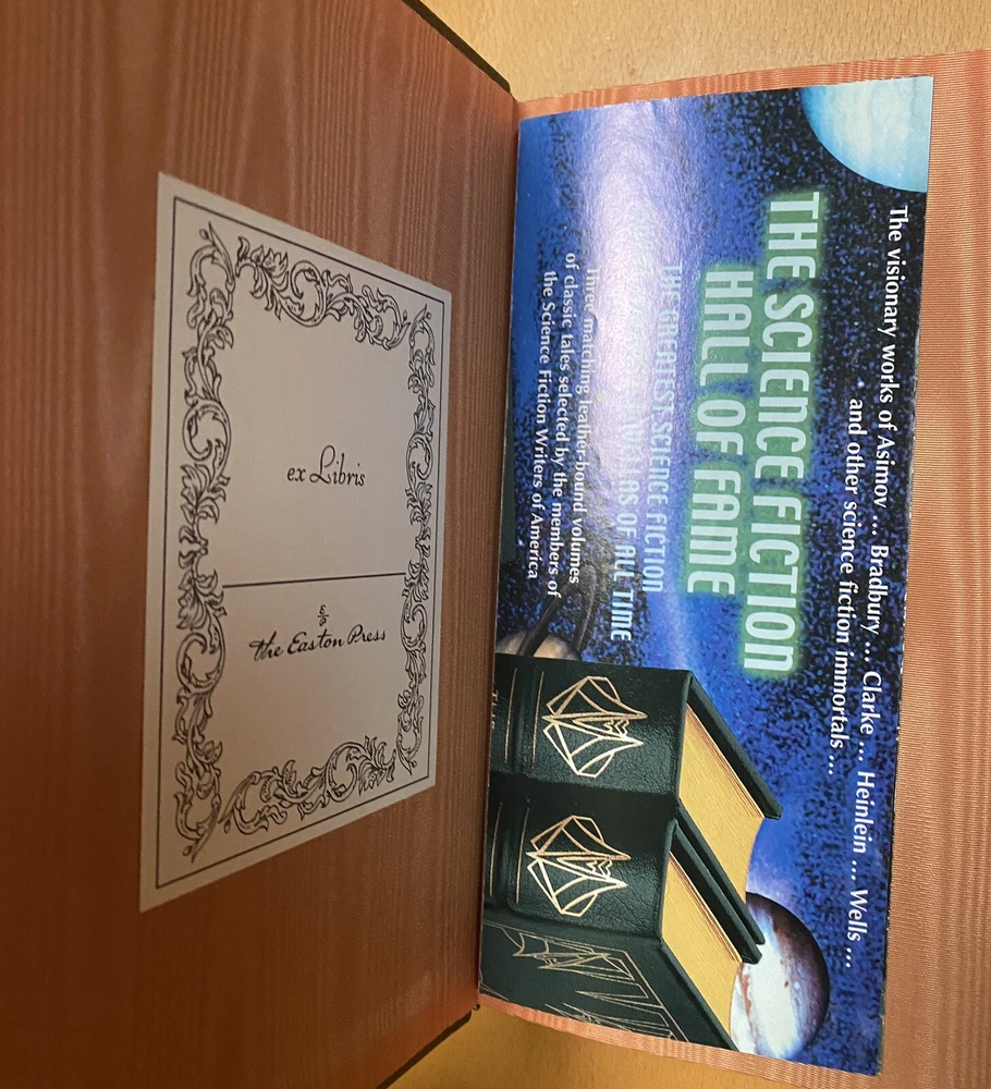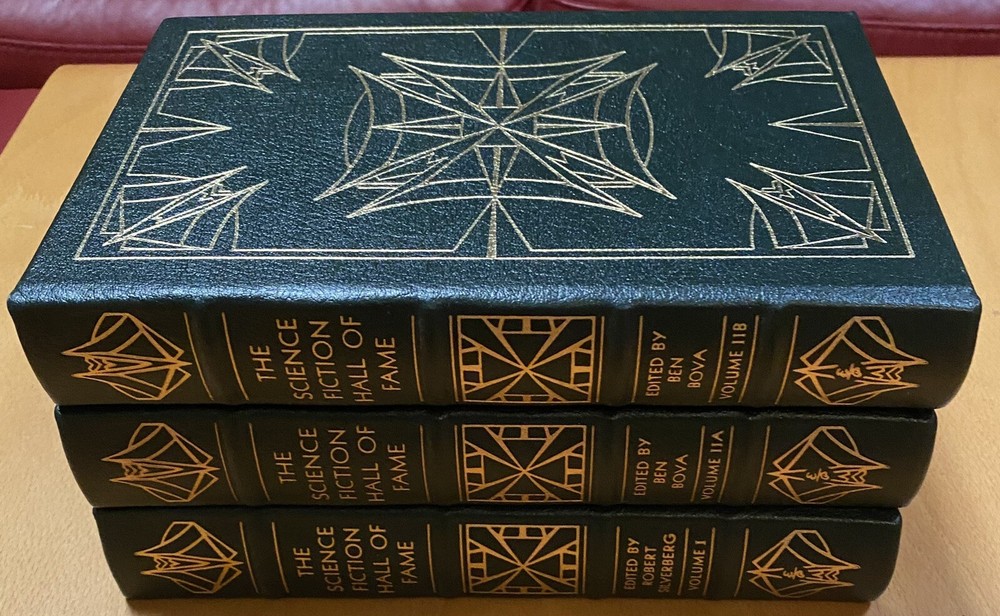 This is the 3 volume "Science Fiction Hall of Fame"", edited by Ben Bova and featuring the works of Asimov, Williamson, Heinlein, Bradbury, Clarke, Wells, and so many others. Fantastic set. Published by Easton Press and in excellent unread condition from a non smoking home. Has original flyer. Unsigned Easton Press bookplates on silk moire fabric. Unread, with some scratching on front gilt edge, one white dot on a gilt edge. All else very nice. Paypal only.
