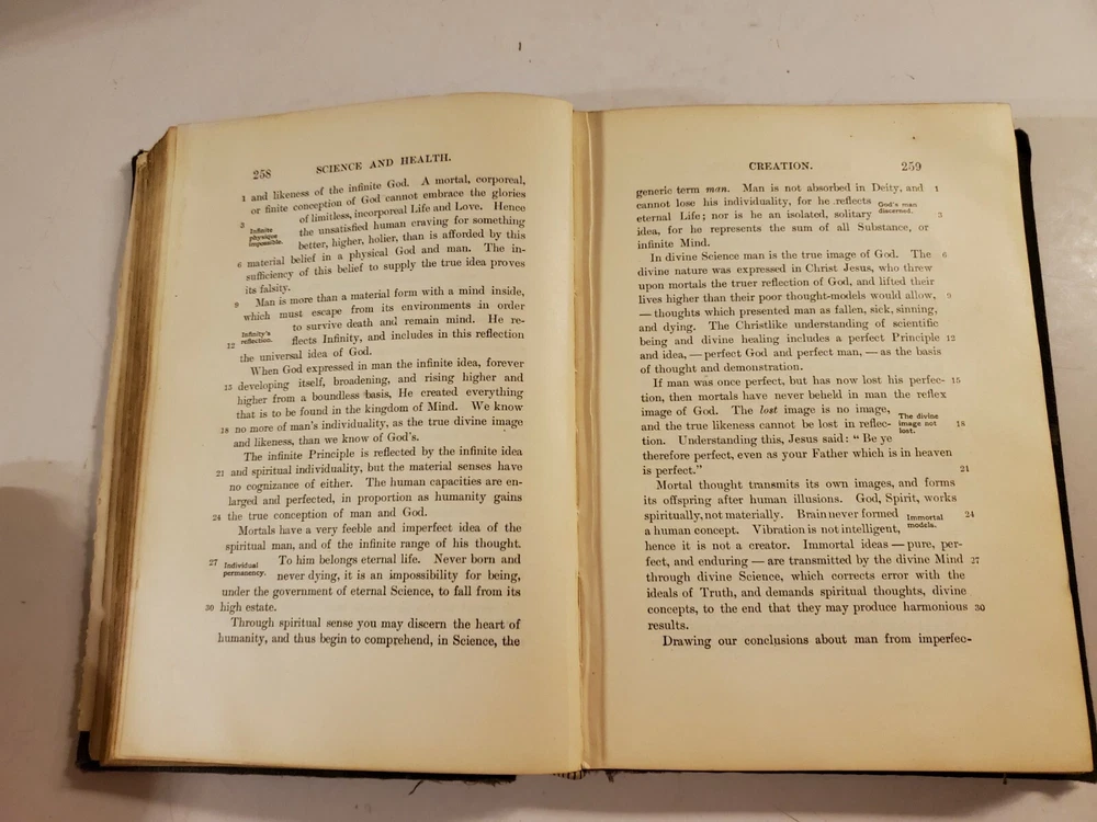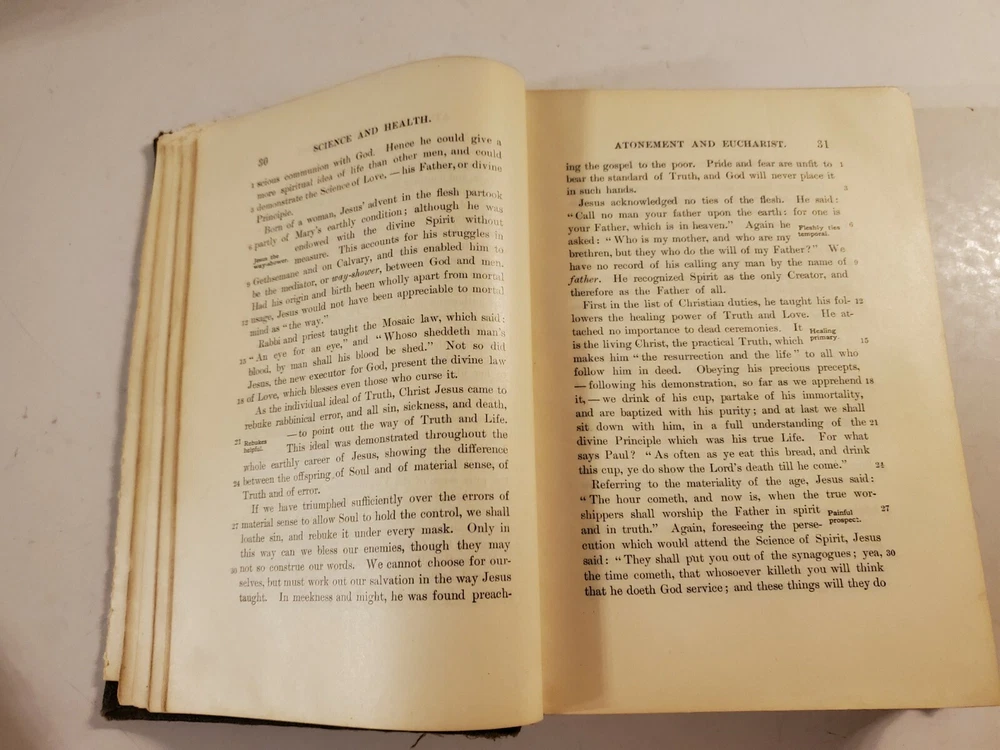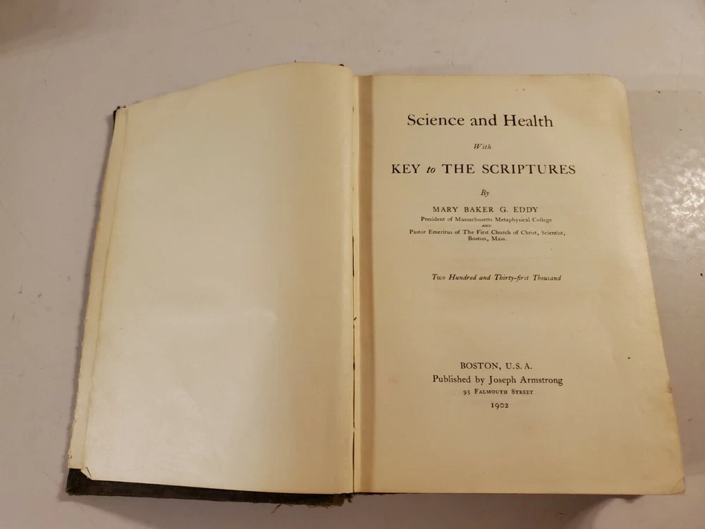 3 Science & Health with Key to the Scriptures - VERY RARE Hardcover, 1902, 231,000, noted on the title page. 5th Edition. by Mary Baker Eddy. Five end papers are detached. This book has some fraying on the cloth cover. Pages are unmarked with toning and some foxing. One of the early publications of her work. Written over the course of 40 years following a pivotal healing experience in 1867, "Science and Health" is the result of extensive Biblical study by Mary Baker Eddy. This woman, who discovered Christian Science in 1866 and felt inspired to write her book soon after, poses in her work an entirely metaphysical view of Christianity. Eddy conceives of sin, sickness, and death as not of God, and hence not real. She strives to assert that reaching for a spiritual comprehension of the world, one that is God's perfect handiwork, will allow one to discard those beliefs that are unreal. "Science and Health" has carried its message of hope and comfort, healing and strength to millions of readers for well over 100 years, helping countless people find balance and deeper meaning in their lives. 1 Shipping cost reflects USPS 2024 price increase