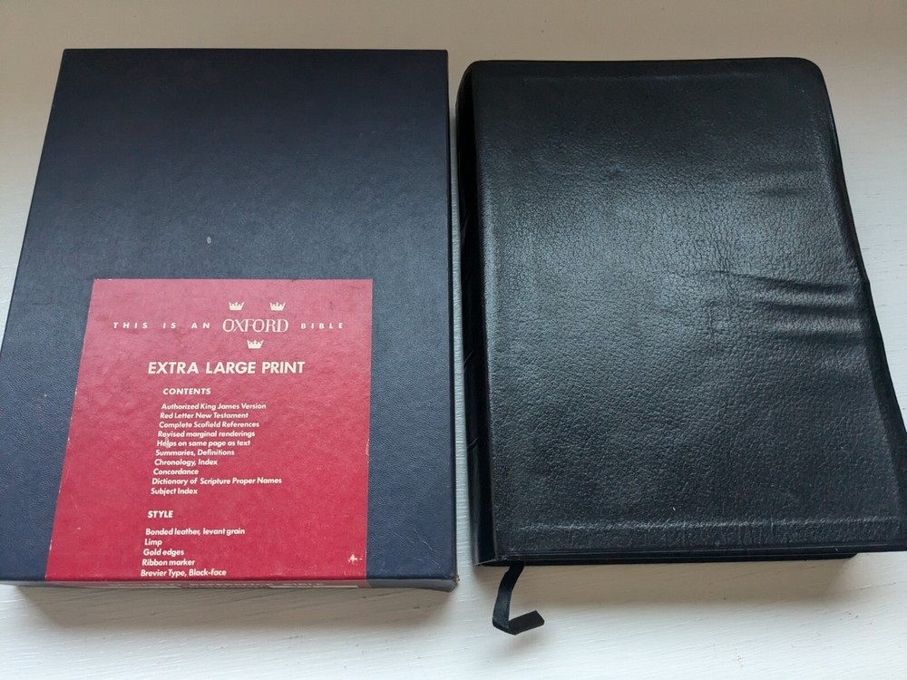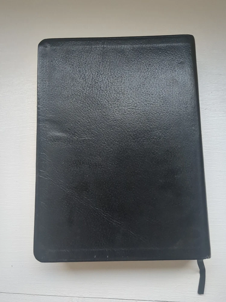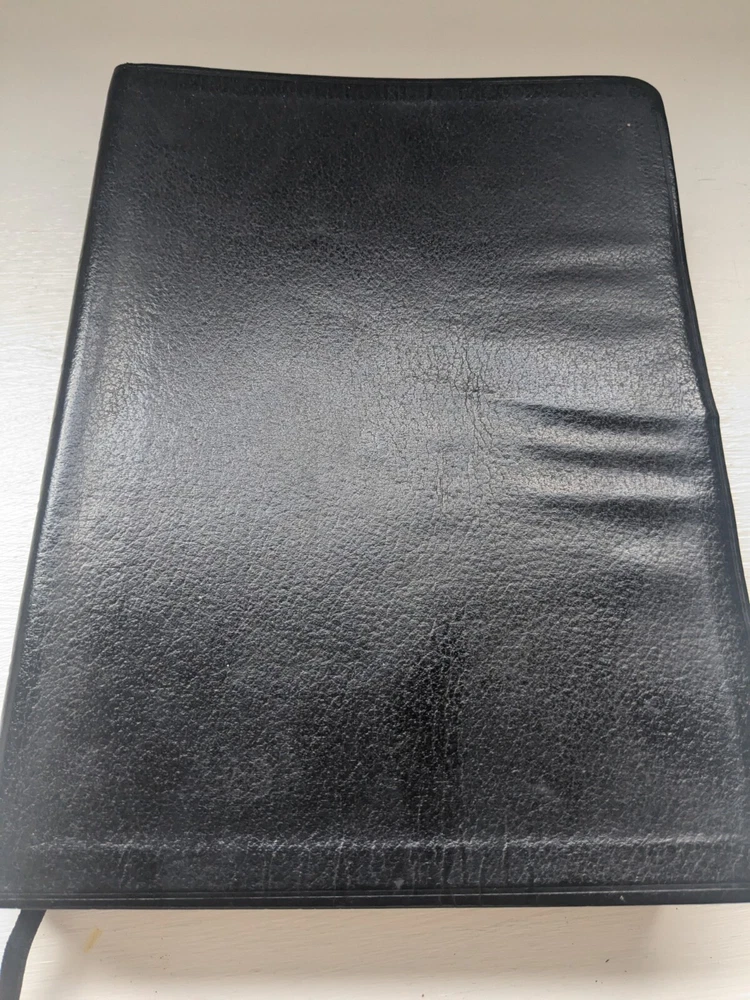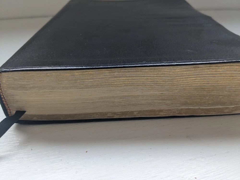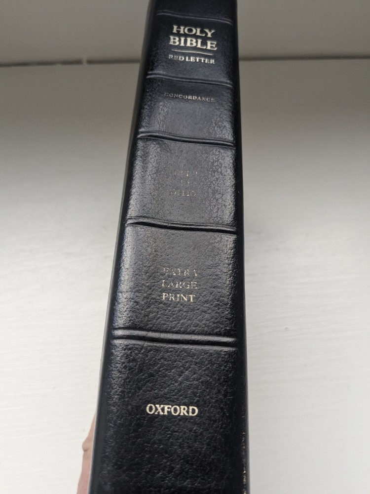 Bible measures 7 and 1/2 in x 10 in. Red letter edition. Strong binding. Flipping through the Bible I see 100 or so pages that contains yellow highlighting. Previous owner's name in front covered over with white stickers. Visit my eBay store to see other Bibles and Christian theology and songbooks. Can combine shipping with multiple purchases.