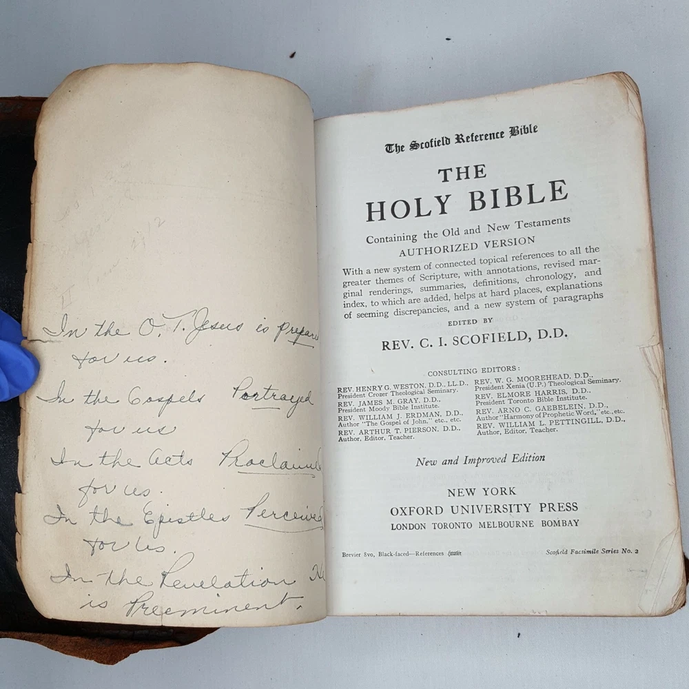 Scofield Reference Bible KJV 1945 Genuine Leather Facsimile Series 2 Softcover - This is a well used and loved bible, the cover shows a great deal of wear and deterioration from use and age. There is folding, rips, wrinkles in the pages, pen writing on portions along with underlining, please review pictures for details. Thank You