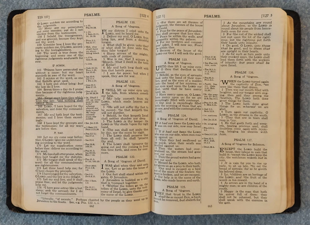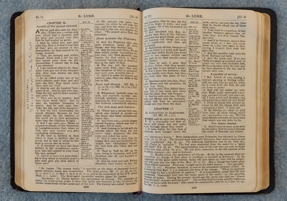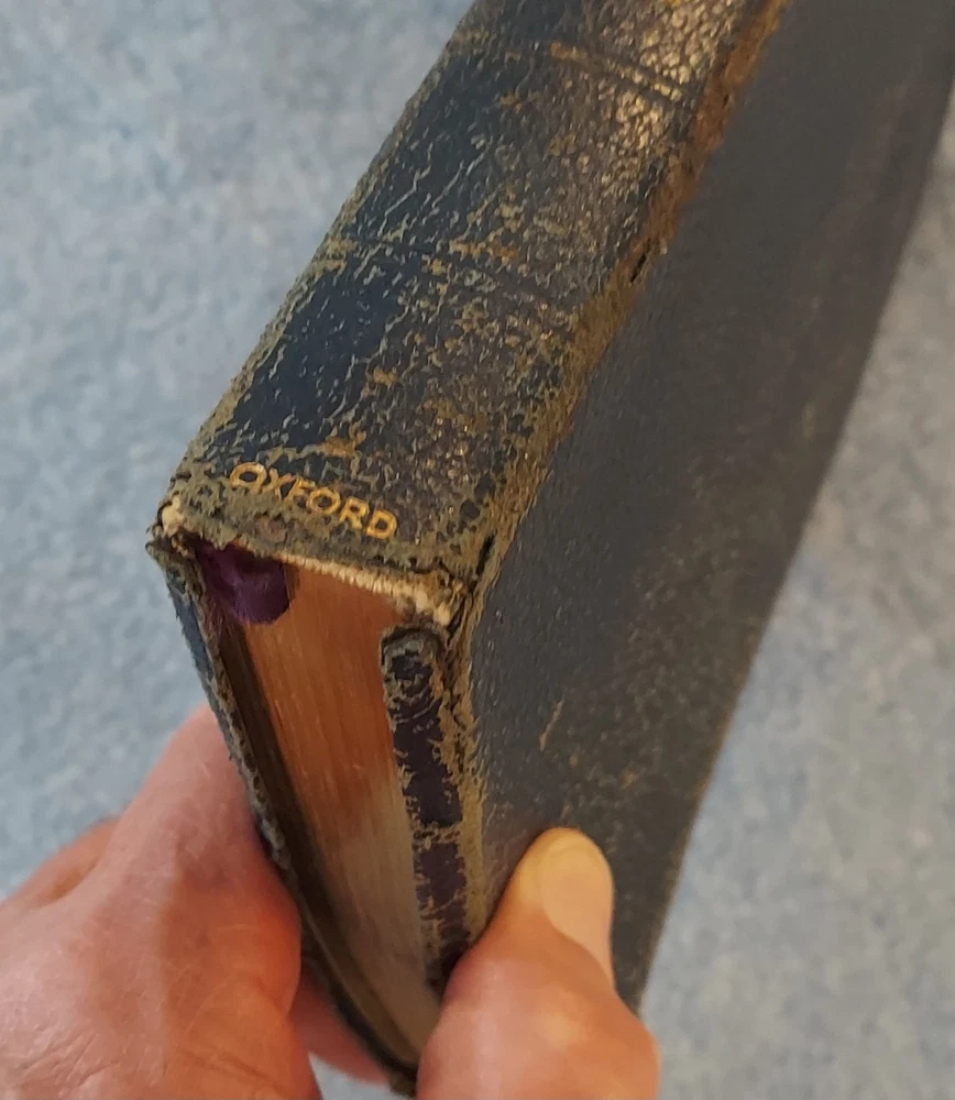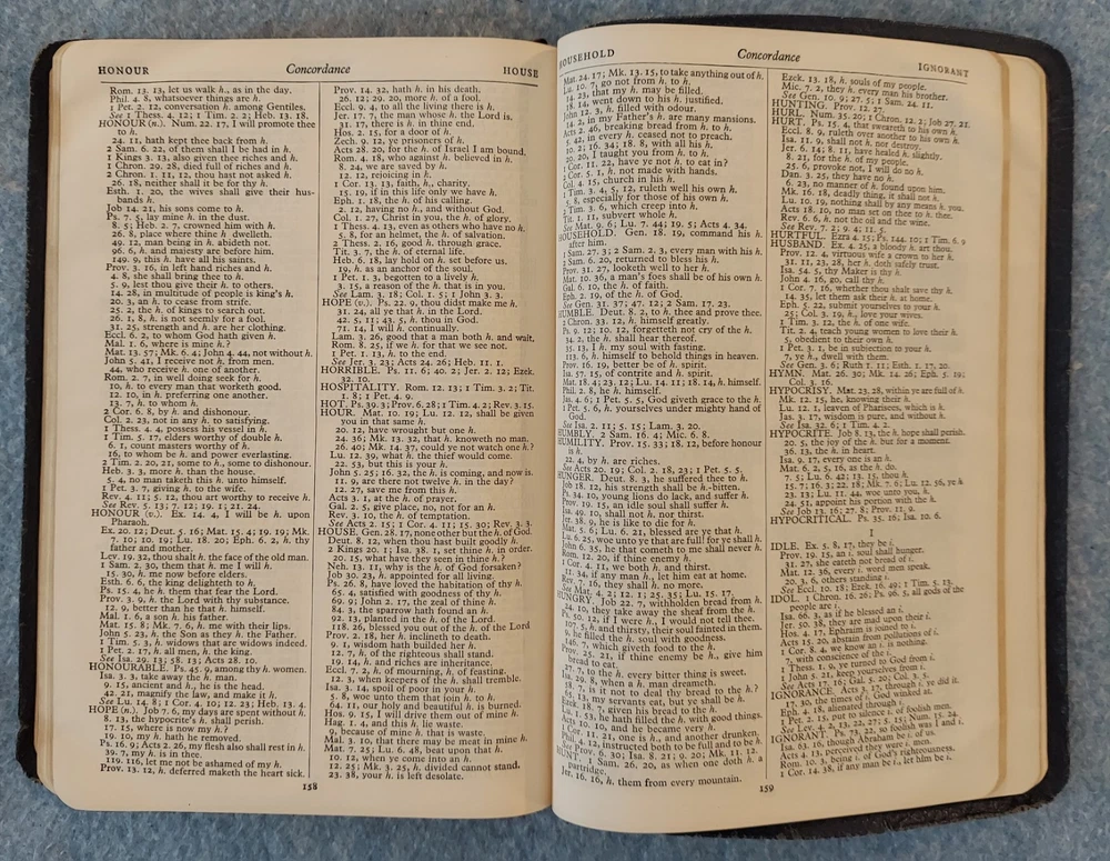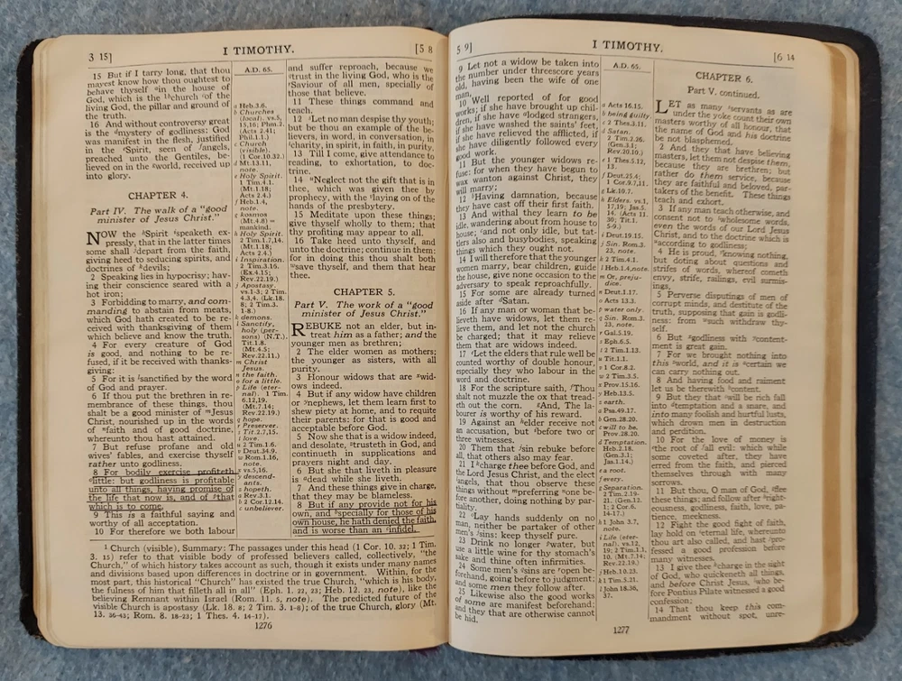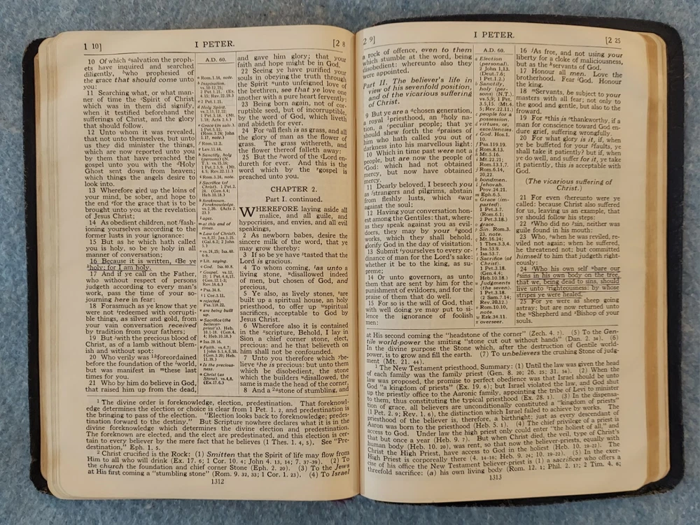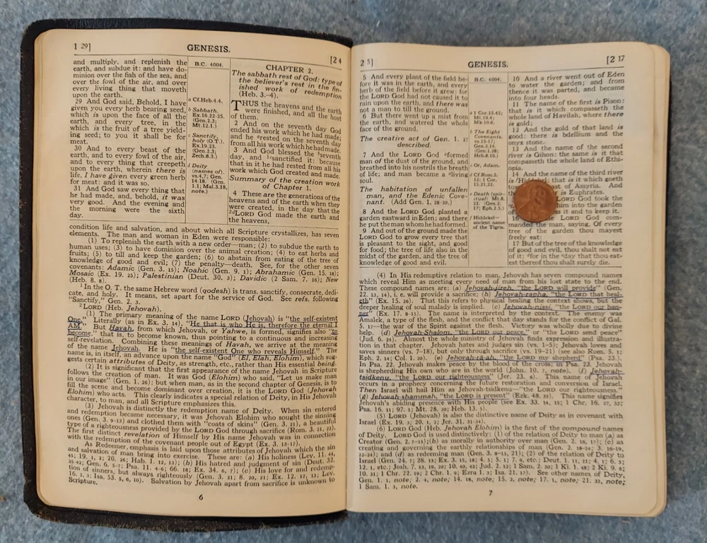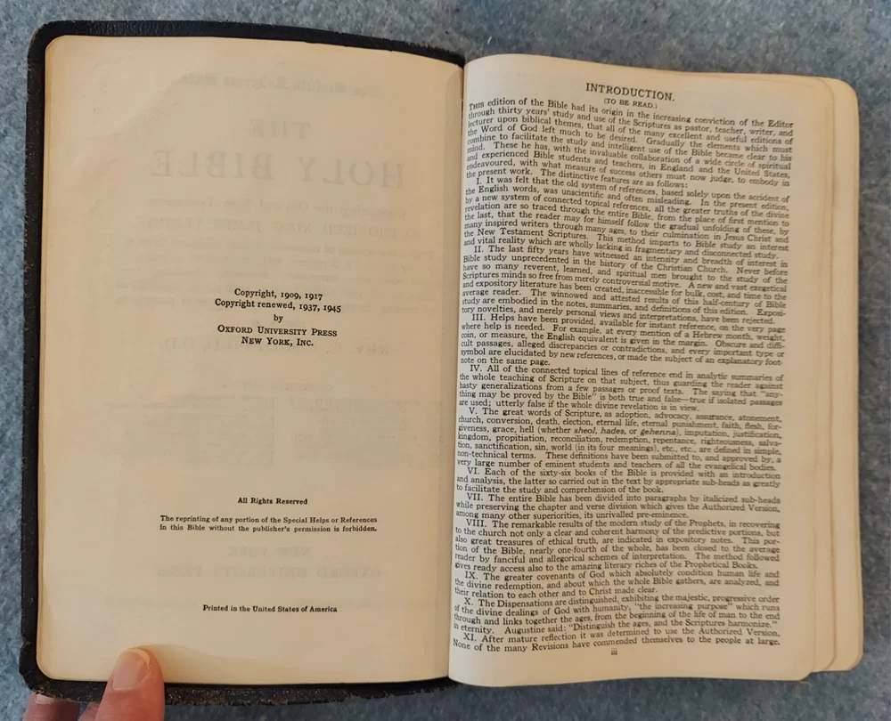 Scofield Reference Bible King James Version KJV Study Vintage Leather Oxford Univ Press The Scofield Reference Bible THE HOLY BIBLE Containing the Old and New Testaments AUTHORIZED KING JAMES VERSION With a new system of connected topical references to all the greater themes of Scripture, with annotations, revised marginal renderings, summaries, definitions, chronology, and index, to which are added, helps at hard places, explanations of seeming discrepancies, and a new system of paragraphs Edited by Rev. C. I. Scofield, D. D. OXFORD UNIVERSITY PRESS Brevier 8vo. Black-faced – References India Scofield Facsimile Series No. 2 Copyright 1909, 1917; renewed, 1937, 1945 Oxford model code (inside third sheet from the back): T-71 183X Printed in the United States of America Cover : believed to be leather but it is not labeled/stamped inside. The cover looks like leather, especially examining the worn areas, but I am not an expert on Bible covers. I guess it could be imitation leather; probably not bonded leather (too old for that newer technology). Blue/Navy Blue Size : 5 ¾ x 8 ½ x 1 ¼ inches Pages : Old & New Testaments with Index, 1362; Dictionary of Scripture Proper Names, Subject Index and Concordance, and Index to the Bible Atlas, 255; Color Bible Atlas, 12 · See the photo with the coin to judge the size of the print. Features : · Black Letter Edition (not Red Letter) · Section introductions (such as The Pentateuch, The Historical Books, etc.) · Book introductions to each Book of the Bible · Subject Reference System · Center-Column References, including definitions, cross-references, etc. · Footnotes, including summaries and explanations · Dictionary of Scripture Proper Names · Subject-Index · Concordance · Index to Maps · Color Maps Gold-gilt finish on the page edges This Bible is in good condition. The cover is a bit worn. Please see the photos. General scuffing and around the edges & corners. There is wear and small cracks at the top and bottom of the spine. The binding is good. There are notations on the first couple pages and three pages at the back. Marks are observed on 27 pages of the Bible text. The gold-gilt finish on the page edges is a bit scuffed and scratched.
