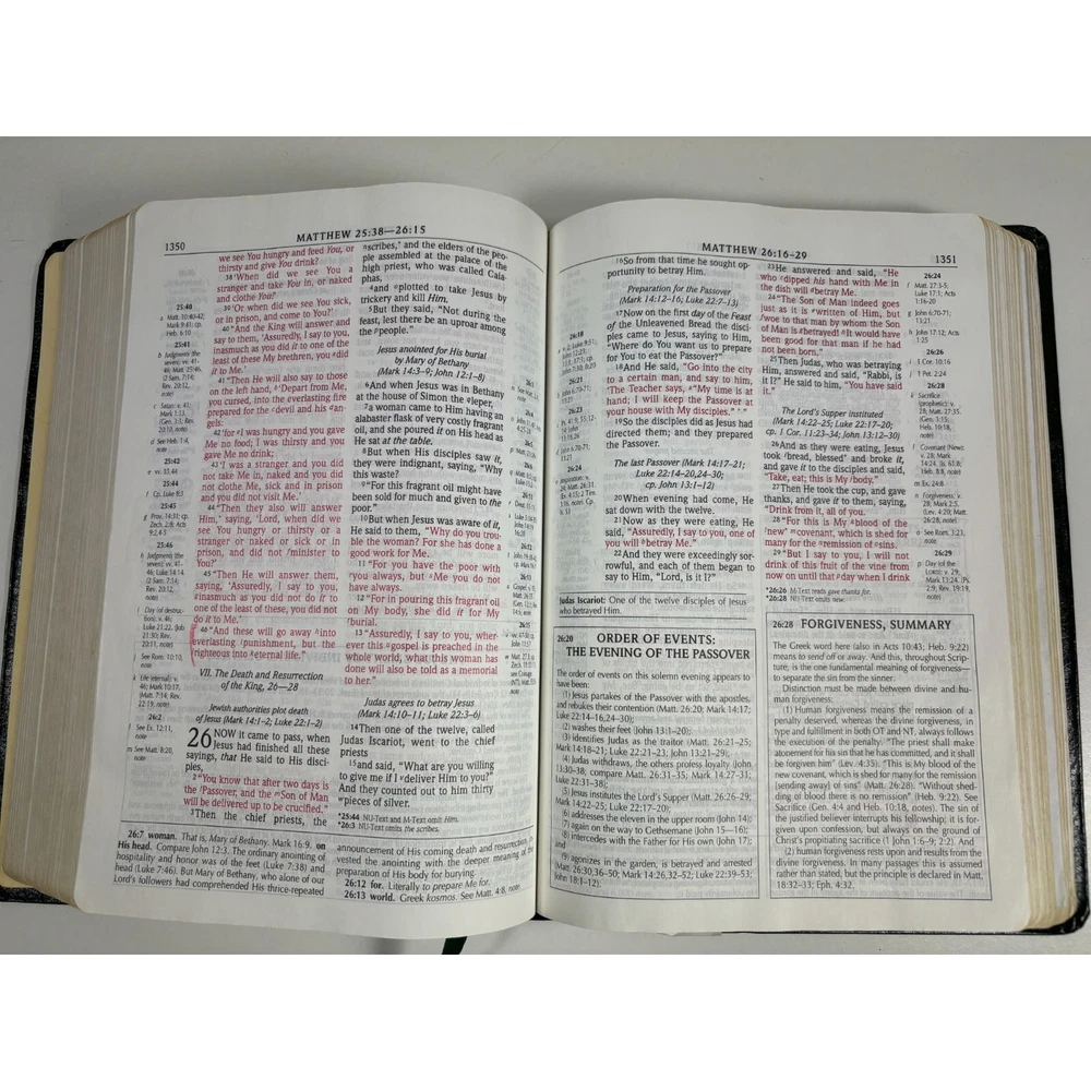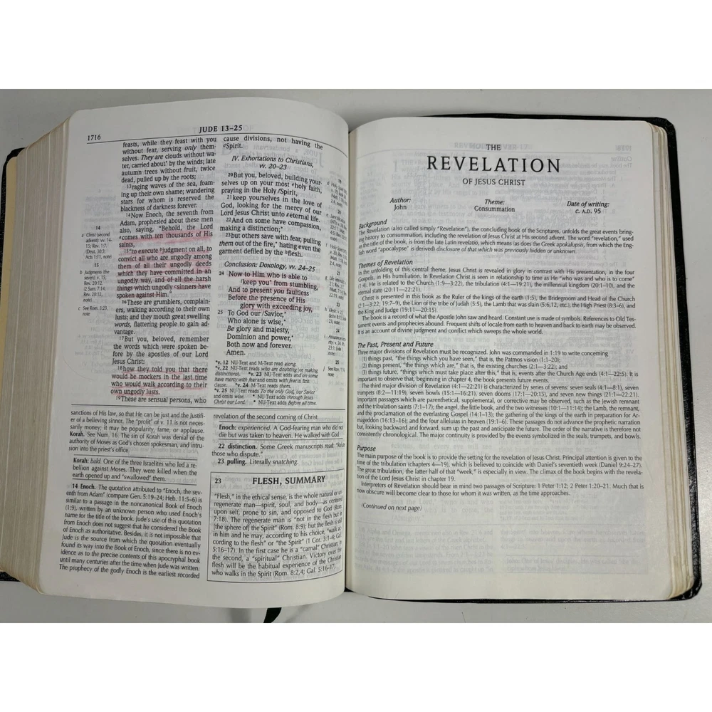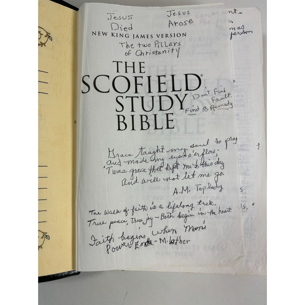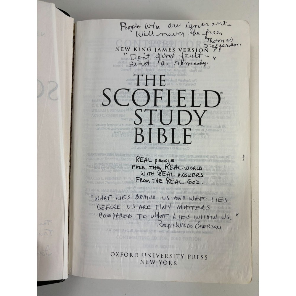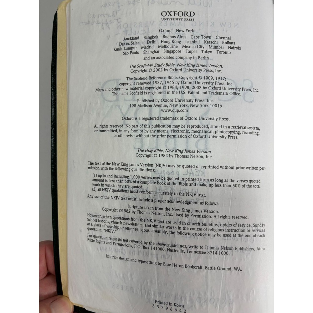 Enhance your spiritual journey with the Scofield Study Bible. This KJV edition features insightful commentary, maps, and a red letter format for key verses. • Leather Bound • Red Letter Edition • Comprehensive Study Notes • Maps and Diagrams • KJV Translation • Published by Oxford University Press • 2002 Edition Some handwritten notes on the first few pages.