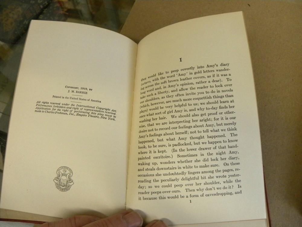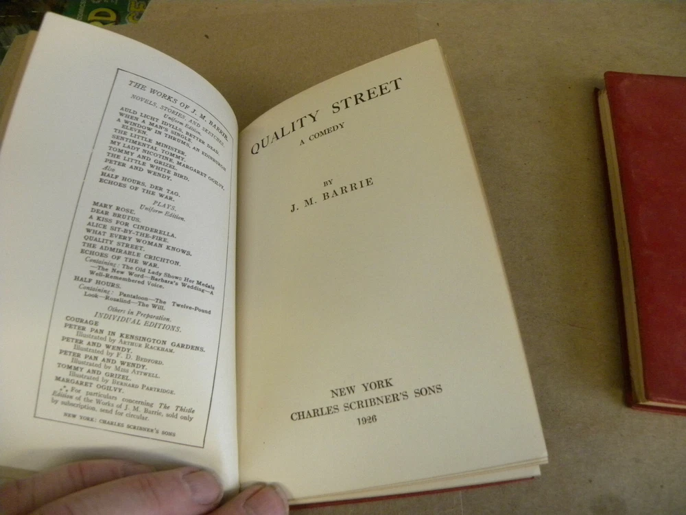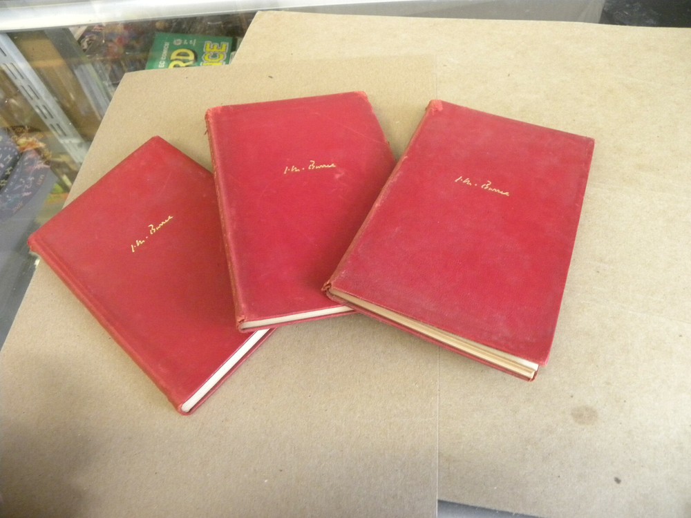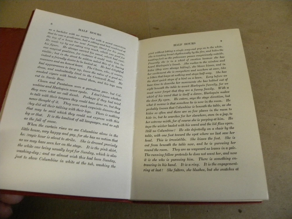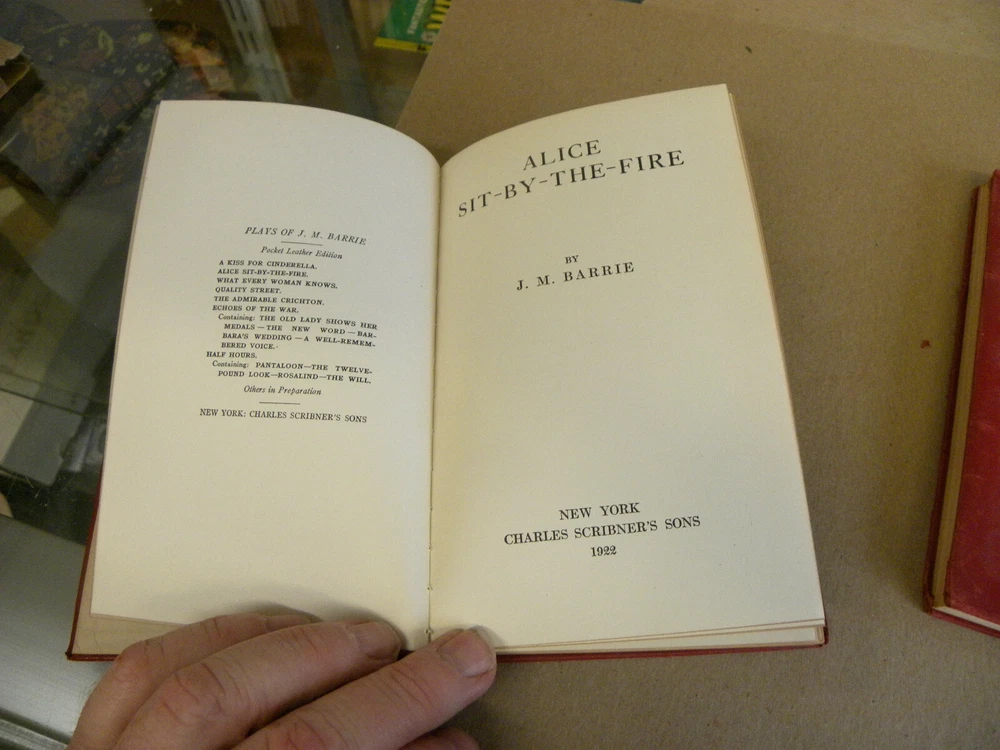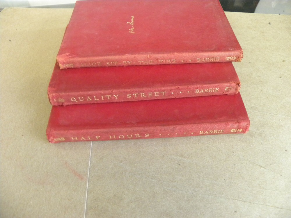From Charles Scribner & Sons, vintage 1922 to1926, red leather bound Three soft red leather flexible cover books. Each measures 4 1/3 x 6 1/2 Offered are ALICE SIT-By-THE-FIRE (1922)--has a short tear at the top of the spine on the front cover, HALF HOURS (1926) and QUALITY STREET (1926) Offered are 3 books from the series, covers have a hint of handling wear. Interior pages are clean and sturdy. Previous owner's Ex-Libris cards on each first leaf. Combined shipping discounts are available whenever possible. Winning Bidder to pay $4.99 towards Media Mail or $8.49 towards Priority Mail shipping. Thanks for bidding!