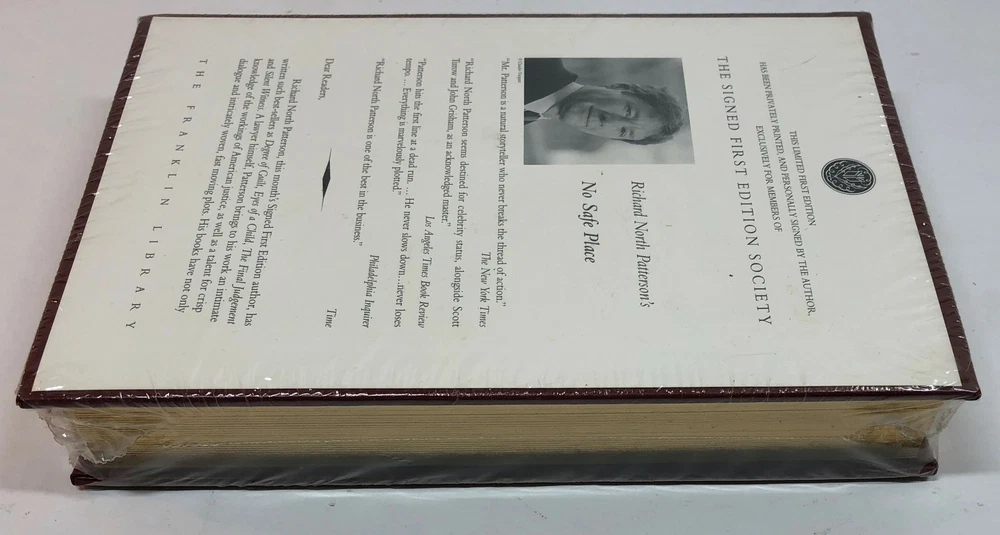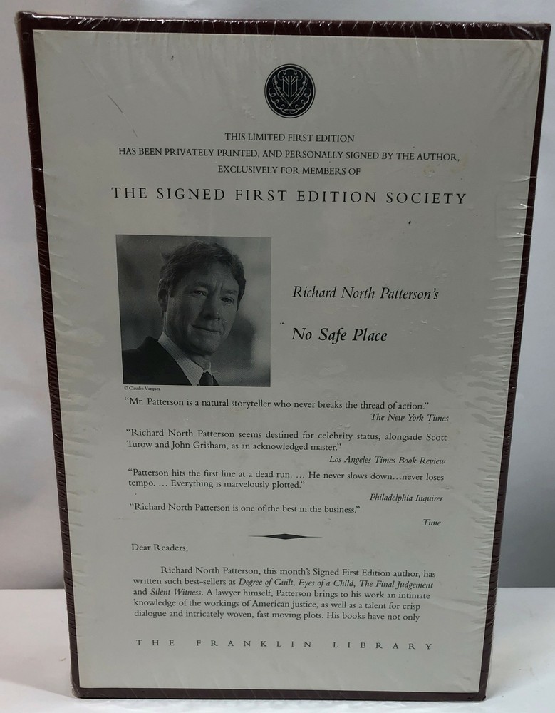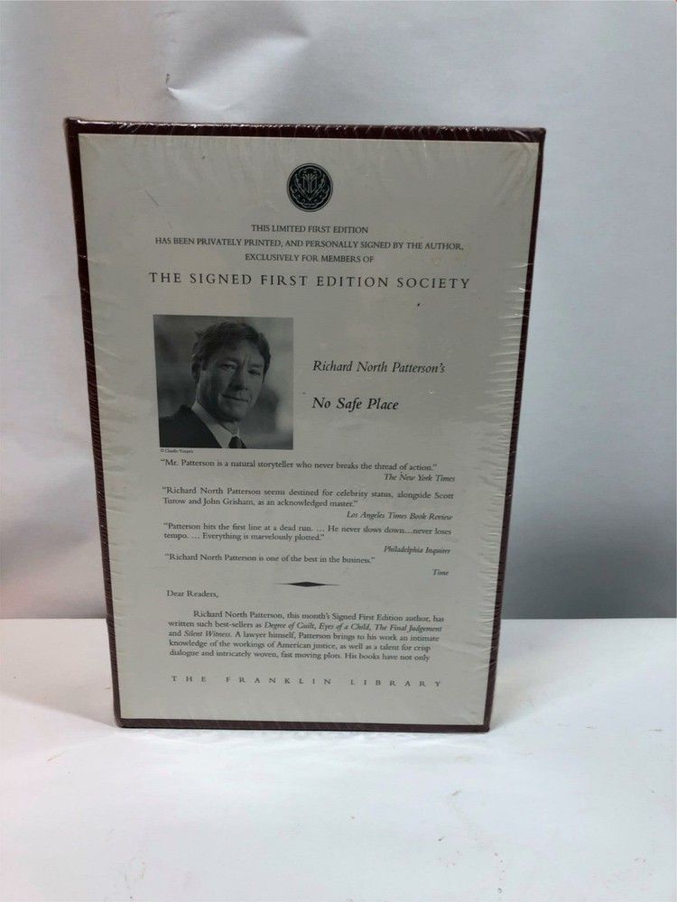 Sealed Richard North Patterson’s No Safe Place The Signed First Edition Society The Franklin Library This limited first edition has been privately printed and personally signed by the author exclusively for members of The Signed First Edition Society Sealed in original seal. Return Policy: Items marked "Free Returns" may be returned within 30 days of receipt. Returned items must be unused, unopened, returned in original packaging with all labels, parts and pieces as received. Please see eBay's policy on returns. Seller will provide a return label. Items marked "Buyer Pays Returns" may be returned within 30 days at buyer's expense. Returned items must be unused, unopened, returned in original packaging with all labels, parts and pieces as received.