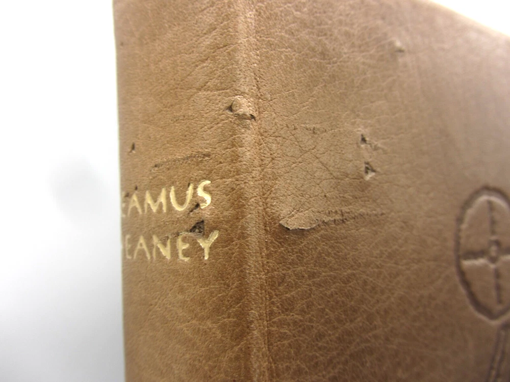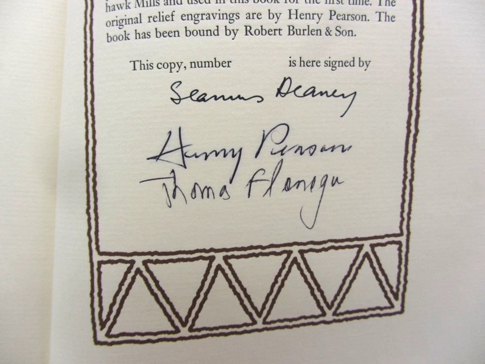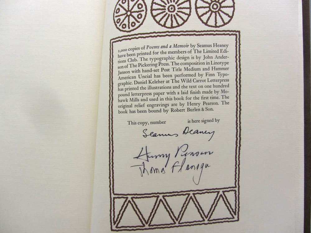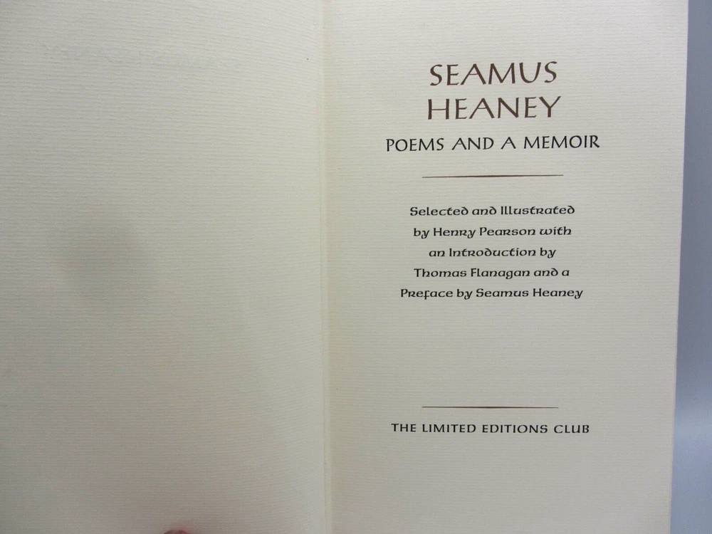 Delve into the rich tapestry of Seamus Heaney's work with this exquisite leather-bound collection featuring the signatures of Seamus Heaney, Henry Pearson, and Thomas Flanagan. This Leather bound book features both his poems and a memoir. The tome offers an intimate look into the life and art of one of Ireland's most celebrated poets, providing a perfect homage to his literary legacy. Crafted for both avid readers and collectors, this edition is a must-have, with its elegant format and high-quality binding designed to preserve the beauty of Heaney's words. It's an invitation to revisit his powerful verses and heartfelt memoir, now available in a format as enduring as his poetry.