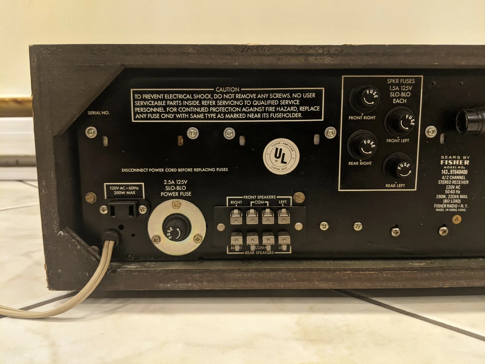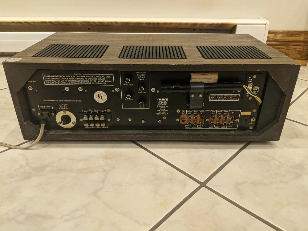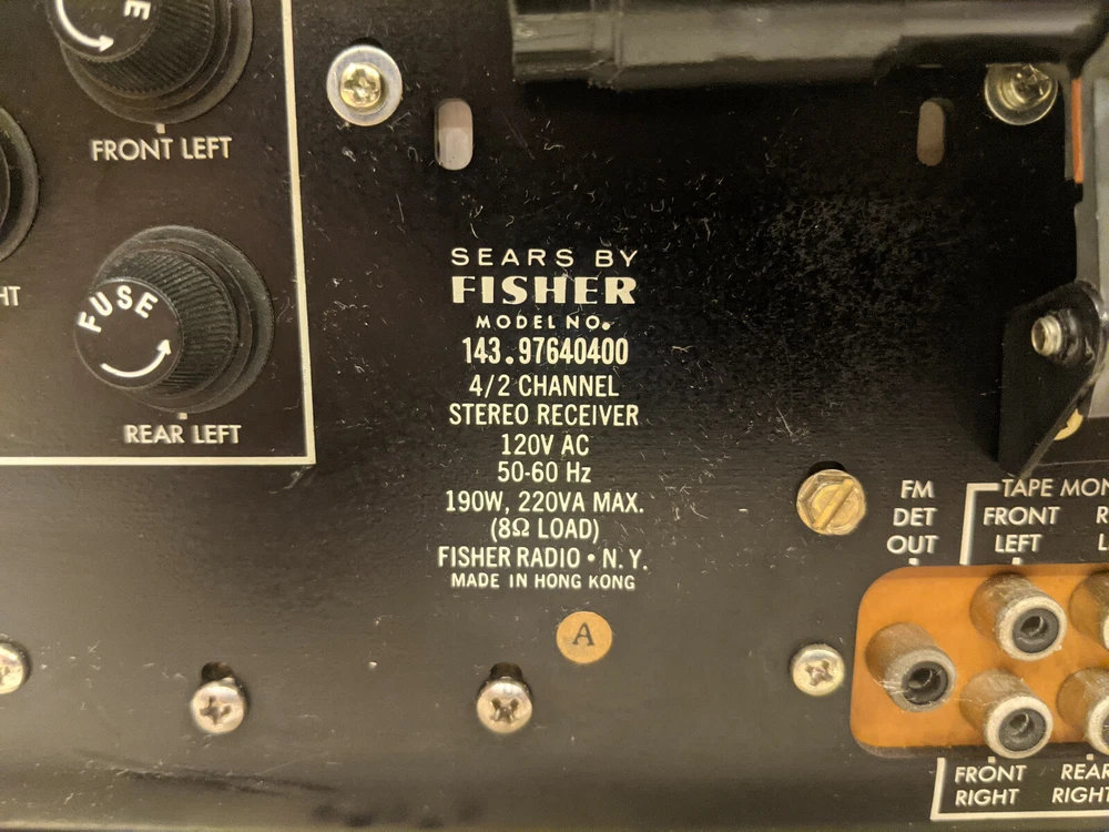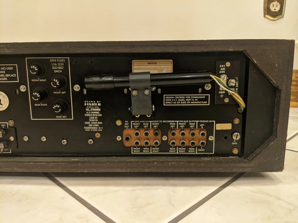 Description You are looking at a Sears Audio By Fisher 4 / 2 Channel Stereo Receiver Model 143.97640400. This receiver does 2 channel stereo as well as 4 channel quadraphonic sound. The receiver is in good overall cosmetic shape. The function, volume, and speaker knobs are missing but the actual controls still work. Some of the front panel writing is worn off as pictured. Backlighting for the tuner is working. This receiver was powered on and I connected 2 speakers to it. I tested it in 2 channel stereo mode using the FM tuner. It worked but the volume and balance knobs sounded scratchy, probably need a cleaning. This was all the testing that was done, I did not test the 4 channel quadraphonic mode as I do not have any devices to send a quadraphonic signal. This receiver is being sold as is due to its age. Policy I only accept PayPal. Item will not ship until payment is received. Payment must be received within 7 days after purchase. No returns or refunds. I only ship to The United States.