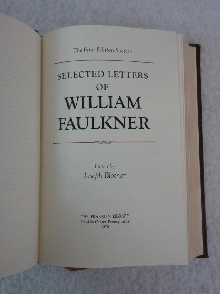 SELECTED LETTERS OF WILLIAM FAULKNER Edited by Joseph Blotner The First Edition Society Franklin Library Limited Edition, 1976 No guide or notes Condition: A Near Fine Leather Hardcover. Please examine photos for details. Condition: We strive to describe and photograph the condition of every item as accurately as possible. Photos are of the actual item that is being sold. Please examine the photos carefully for any condition details and possible flaws. Best Offers: Items are available for offers only after being listed for 30 days. We consider all offers in relation to current market values. We try to respond almost immediately to most offers. Most of our counteroffers are firm but we are open to bargaining. Shipping for US Customers: We combine shipping. When ordering multiple items from us please request a total before paying. We charge postage based on weight plus $1 for each eBay listing. All of our orders are packed carefully to prevent damage during shipment. We ship most of our items within 24 hours. Shipping for International Customers: All international orders are shipped via Ebay's Global Shipping Program. IF AN INTERNATIONAL CUSTOMER IS INTERESTED IN ORDERING MORE THAN ONE ITEM please do not Buy It Now or use the Make An Offer option on the listing. Rather message us first with a list of the items desired along with any offers. After we agree on prices we will combine all the orders into a single listing at the agreed upon total price. This will save you significantly on the cost of shipping. Contact Us: We are available 7 days a week and are happy to answer any questions you may have. The complete eBay Selling Solution.
