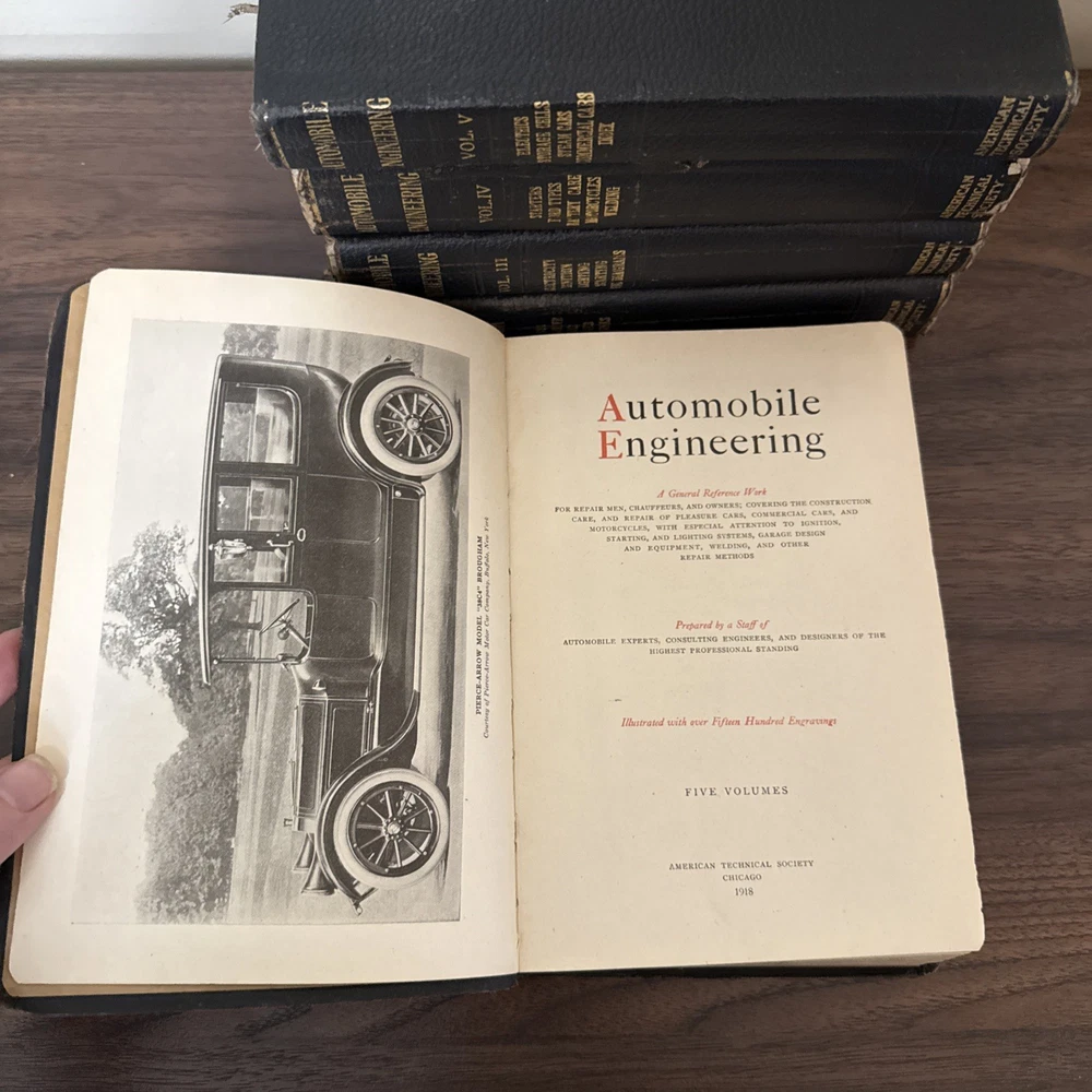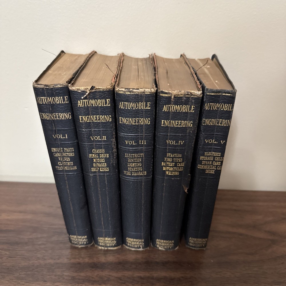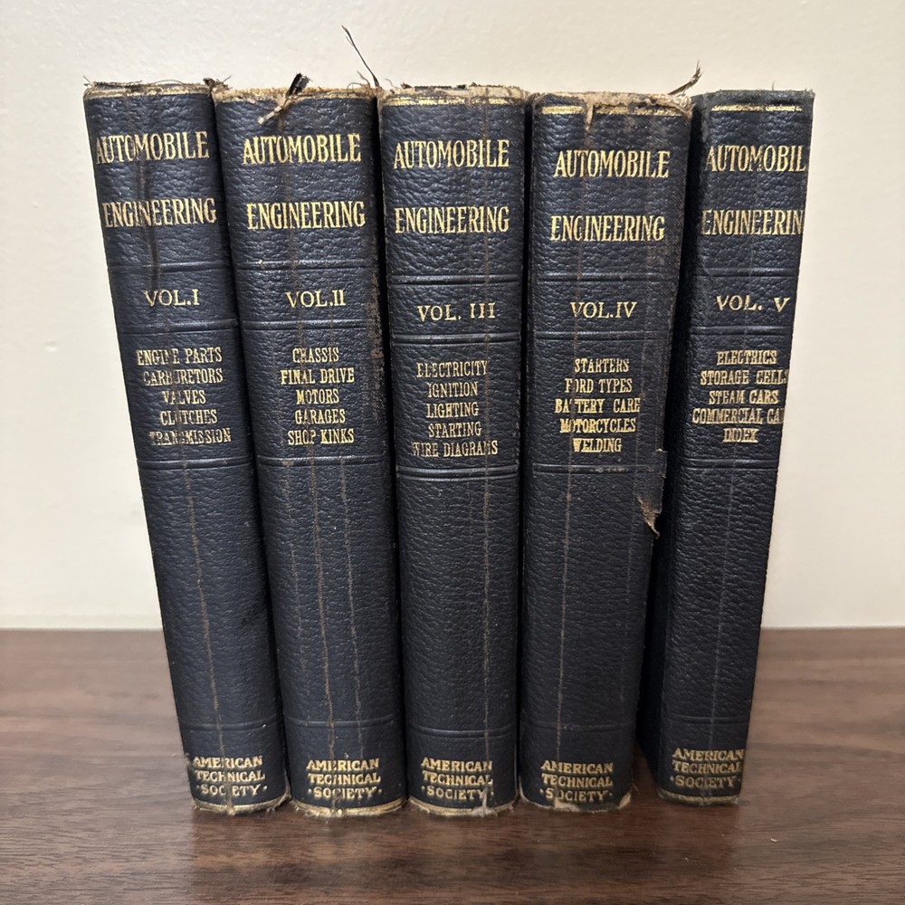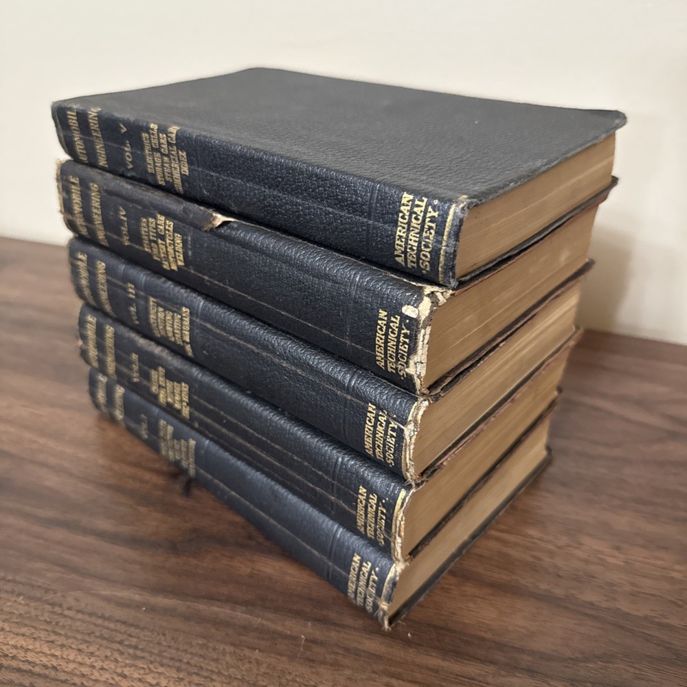 Automobile Engineering American Technical Society Book Set of 5 1918 As shown in photos. Antique books in used condition - covers are scuffed and have small tears at the edges as pictured.
