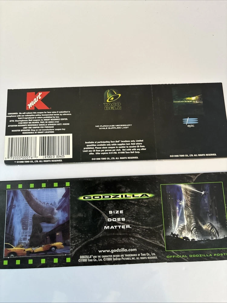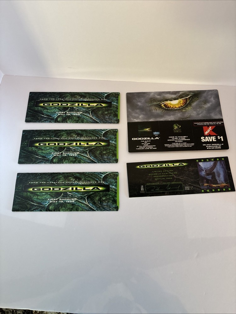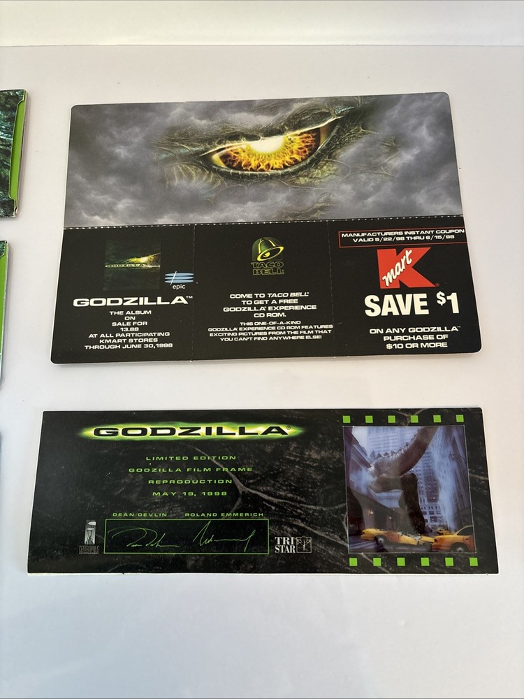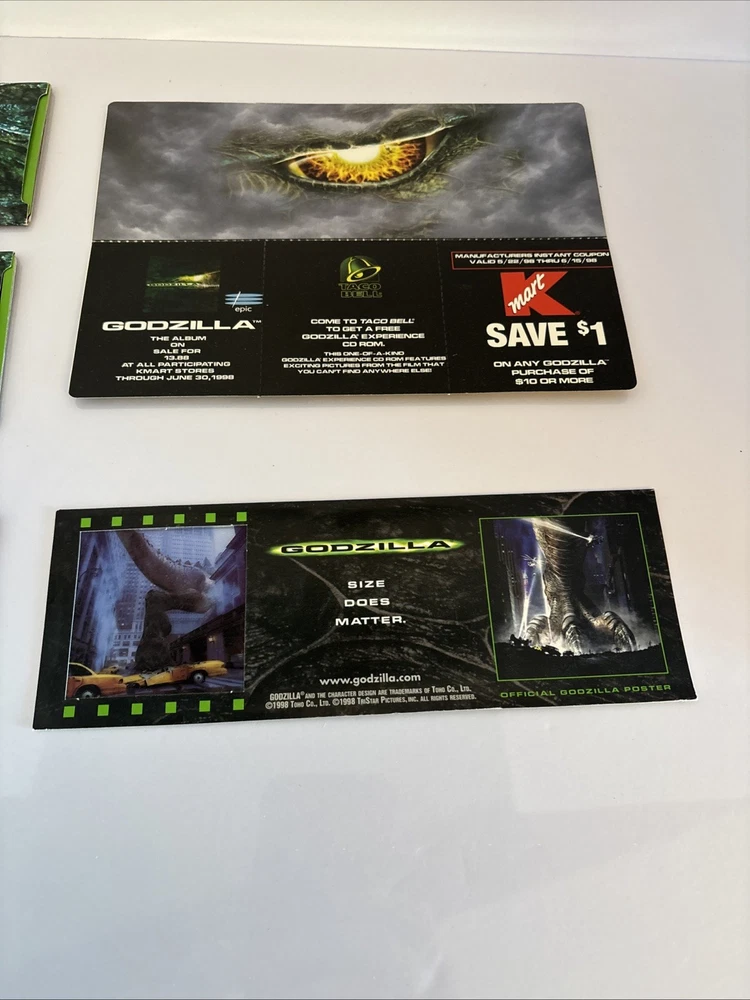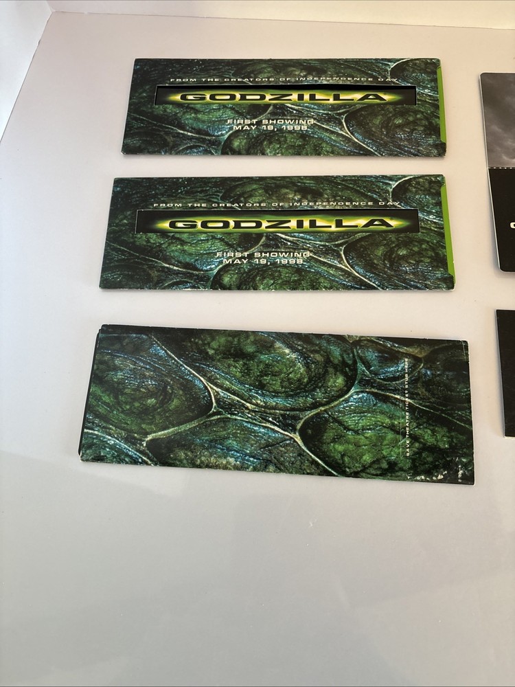 This set of 4 vintage Godzilla movie advertising first showing promo cards from 1998 is a must-have for any fan of the Science Fiction & Horror genre. The cards feature the iconic monster and are perfect for collectors of Godzilla memorabilia. The set is in excellent condition and has been well-preserved over the years. Each card features a unique design and showcases the franchise's distinct style. These promo cards are a rare find and would make a great addition to any collection. Don't miss out on the opportunity to own a piece of Godzilla history. 3 out of the 4 sets are complete 1 is missing the sleeve- Please view photos and reach out with any questions.
