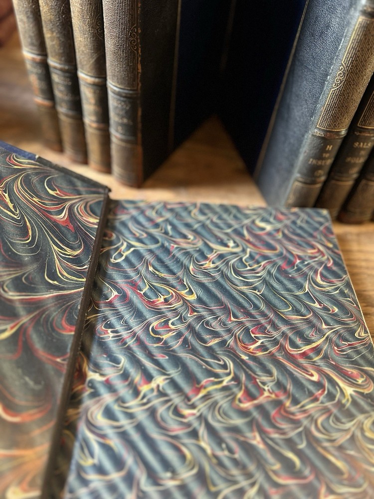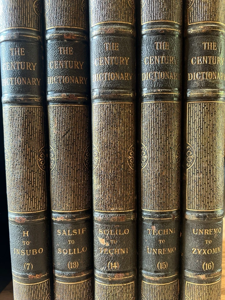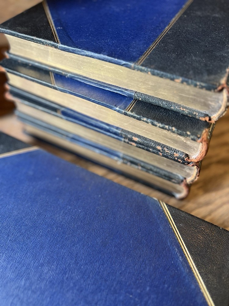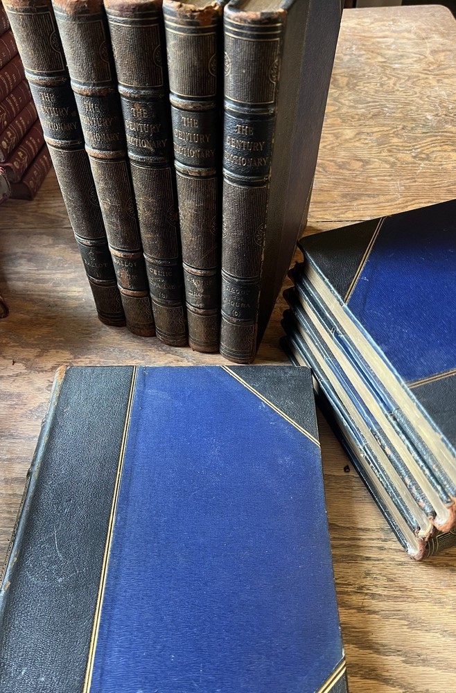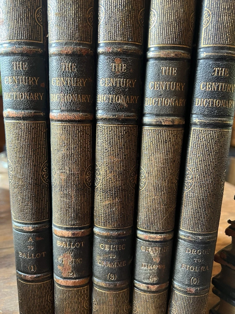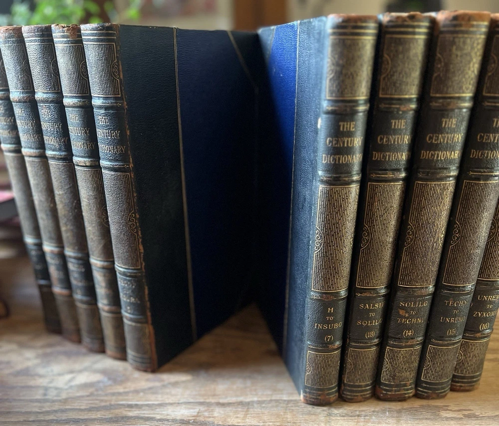 Dark Blue, Leather bounded (3/4) and cloth hardbacks. Immerse yourself in the rich tapestry of knowledge with this set of 5 randomly chosen gilt-edged hardback volumes of "The Century Dictionary." Each book is a testament to the grandeur of linguistic heritage, bound in luxurious 3/4 leather that exudes a classic charm. Published by Century in the year 1900, over a century ago, these books are not only a collector's delight but also a nod to the past era's craftsmanship. The dictionaries are presented in English, offering an extensive reference experience for enthusiasts and scholars alike. With origins in the United Kingdom, this original set is a celebration of literary history. Perfect for those who appreciate the art of print and the elegance of reference books, these volumes are sure to grace any library with their presence. I have 10 total out of the original 16. They are quite heavy, and I will send a random five with the purchase of one eBay lot. The books are in very good condition, with normal wear and tear, the bindings are secure, the pages are clean, only the first volume has a title page. There’s a faint musty box smell to the set. There’s no apparent damage other than wear and tear. Surprisingly strong and secure given its antique age. Since I don’t have the full 16 books in the original set, I won’t sell for the full prize, and will split into two random sets of five. The books are 12 inches tall and 9 1/4 inches deep; quite large, and would look good on top of your bookshelf or stacked showing the blue and leather covers. The top edges are gilt edged, and there is gold gilt tooling on the spine and covers. There is a set of raised bands on the spines.