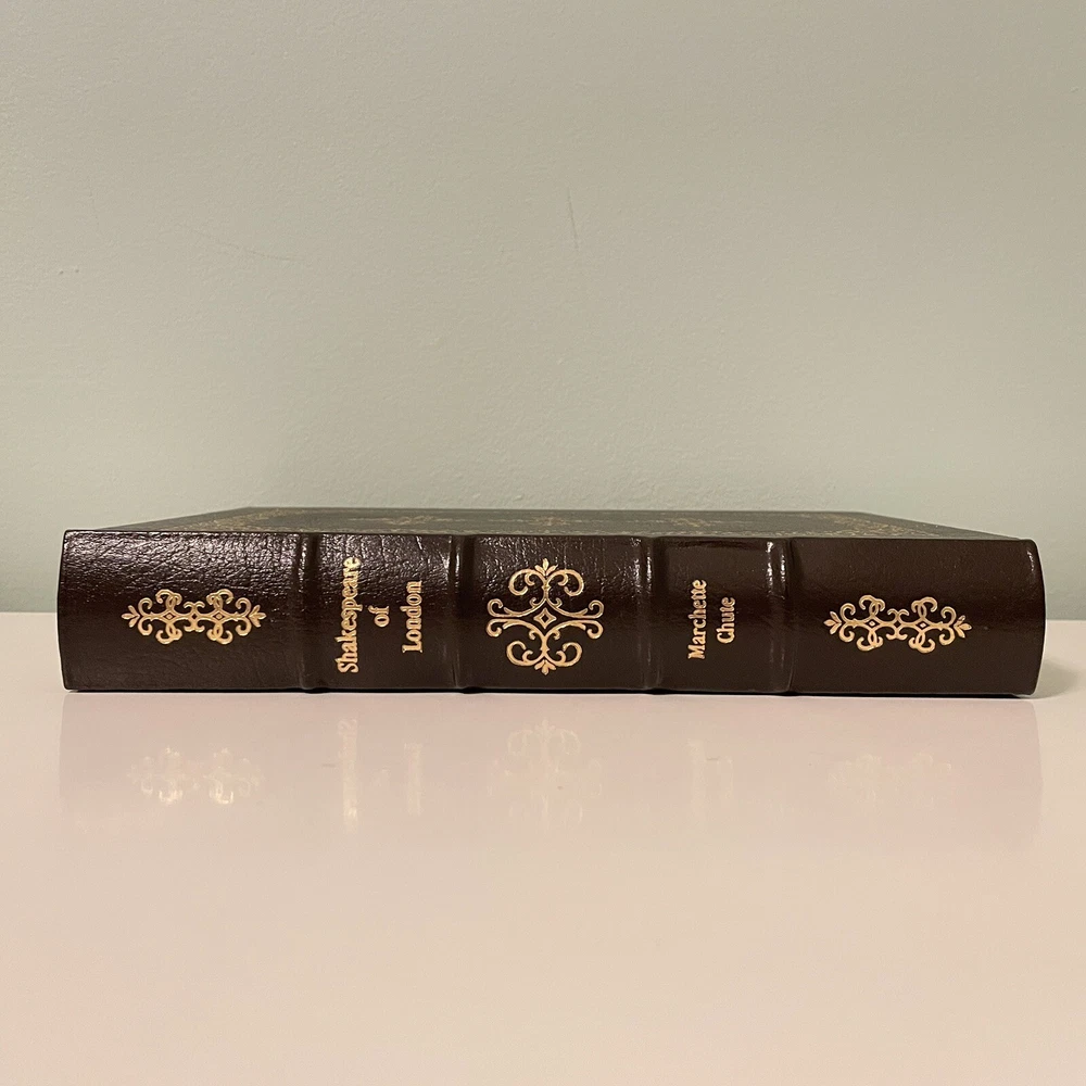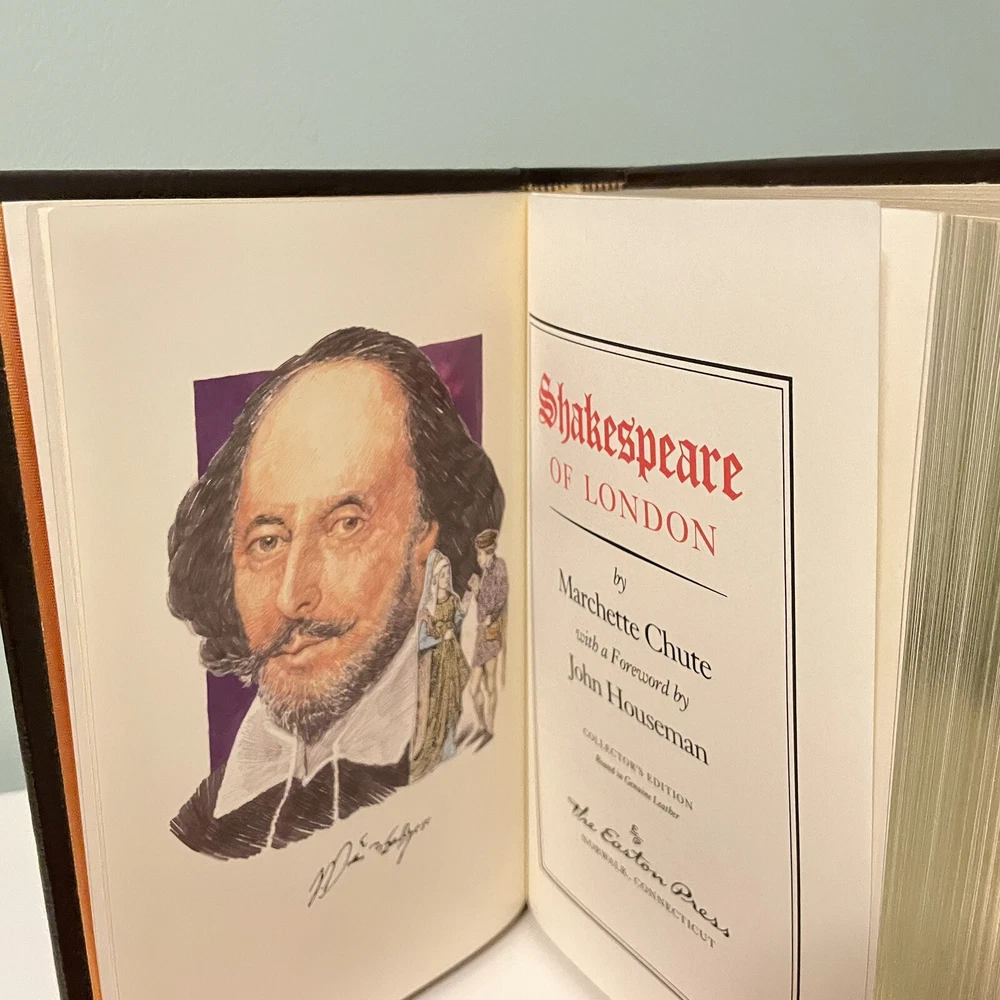 Bookseller Inventory #: 29122015 Description: Shakespeare of London by Marchette Chute (Easton Press, Connecticut, 1988). This is a Collector’s Edition leather-bound hardcover. Forward by John Houseman. Cover and spine are rich tooled leather with 22K gold gilt. Spine has 2 raised bars. Has 22k gold gilting on all three sides or page edges. The end pages have a Moire silk design. Has its satin ribbon. The gold gilting is intact on side and bottom edges. Condition: The book is in Like New condition.There are no marks, tears or folds on any pages. Binding is tight and clean. No writing or markings. This copy appears to have never been read.