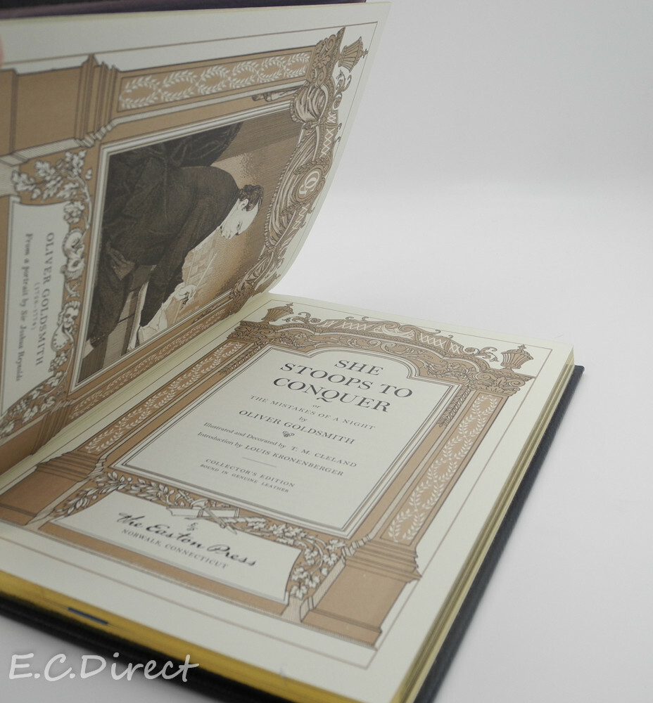 She Stoops To Conquer - Oliver Goldsmith Easton Press Published by Easton Press, it is a beautiful, leather bound hardcover edition produced as part of Easton Press' "100 Greatest Books Ever Written". The spine is ribbed and the page edges have a gold gilt. The spine, boards, and page edges are decorated with 22k gold gilt. The book is printed on archival quality paper, has Smyth-sewn pages (so the book will lay open on a table) and comes with a satin page ribbon/marker. See pictures to see actual condition. Most books in this collection of presidential books has a end plate owners sticker, they also mostly have the Collectors notes from Easton. Again, please reference the pictures for these details. Also check the link below for many more Franklin Library, Folio Society and Easton Press. View Other listings or eBay store Store home Leather Books Toys and Games Cast Iron Vintage Postcards Art Glass Other Thank you, E C Direct. Please ask questions before bidding.