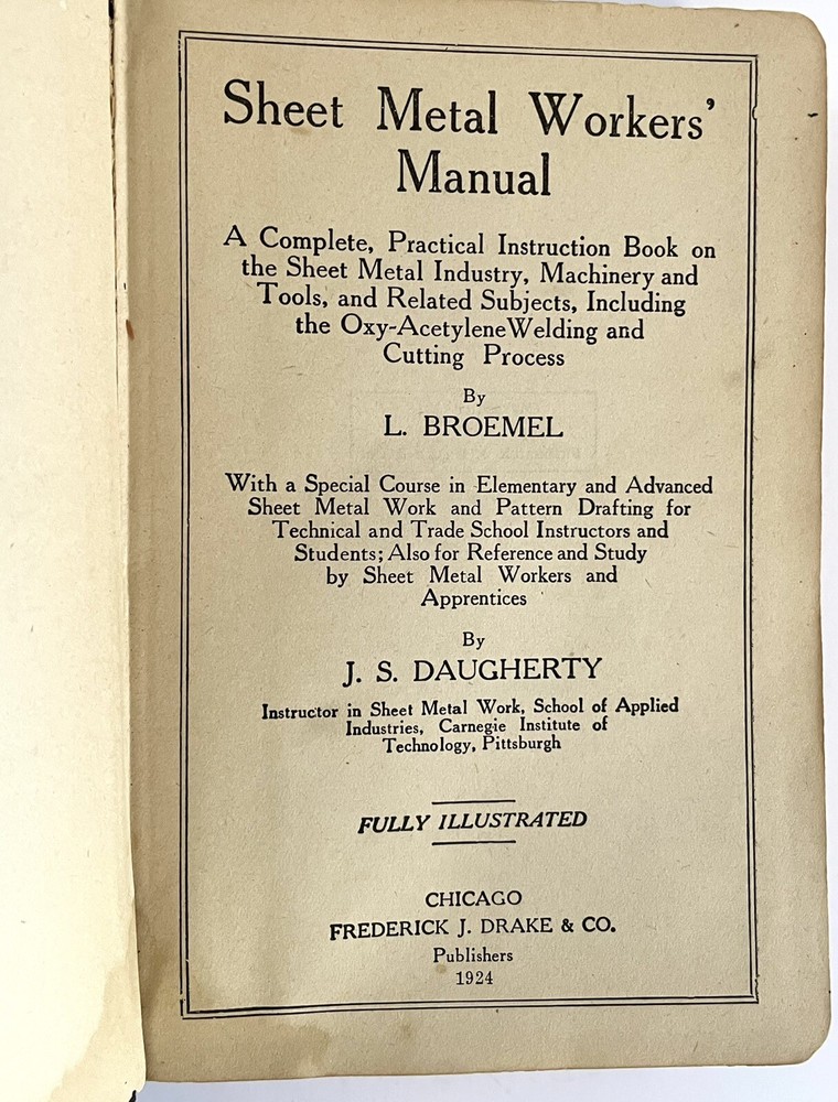 Sheet Metal Workers Manual 1924 by L Broemel Hardcover good condition - especially for a 100 year old book Please look at the photos and don't hesitate to contact me with any questions. This item is shipped via media mail. if you prefer a different shipping method, please let me know before payment. I do attempt to describe items to the best of my ability, as I wish to make my customers happy, and earn 5 star positive feedback, as I love to leave positive feedback to my buyers! If there is a problem with the item, please contact me asap so I can rectify the problem. In the event you are still not satisfied with your purchase, I will refund your money within 30 days of receipt. Thanks for looking!