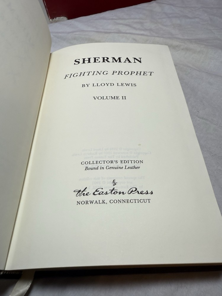 This is a first edition collector's edition book titled "Sherman, Fighting Prophet, Volume II" published by Easton Press in 1991 in Norwalk, Connecticut. The book is bound in leather and written in English, focusing on the historical topic of Biography & Autobiography. It is an original publication from the United States, specifically North America.