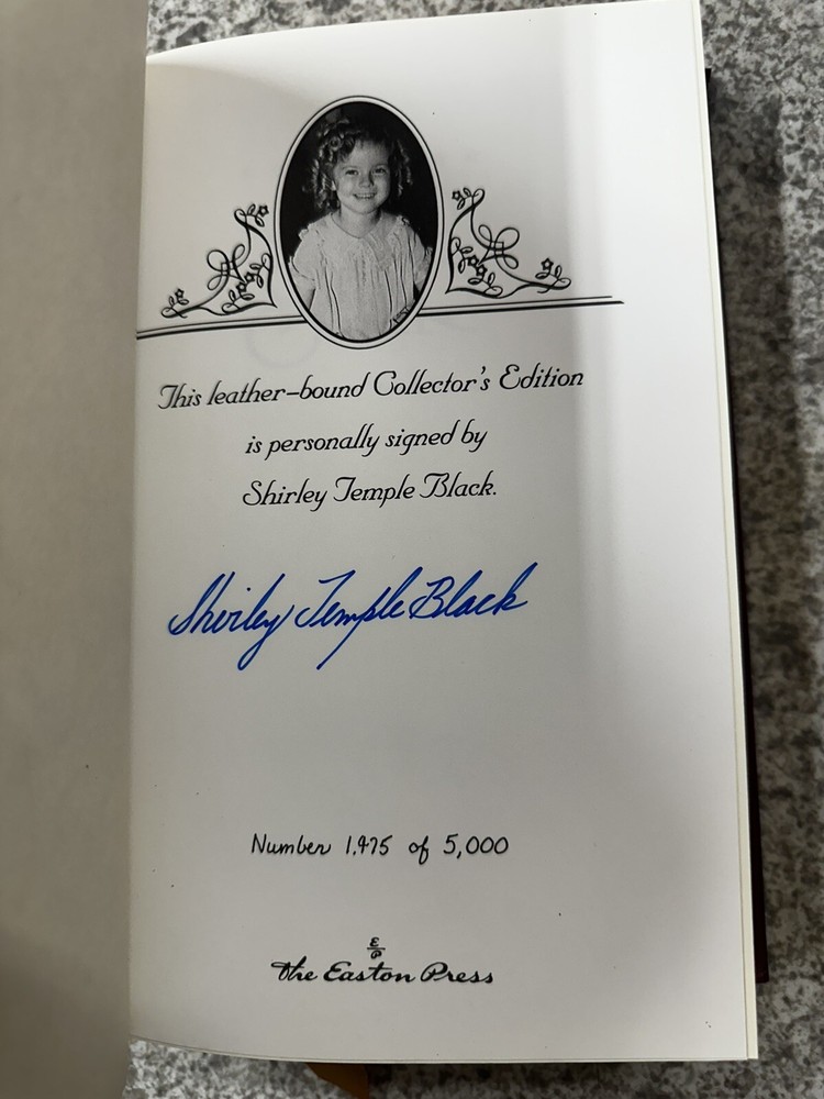 The "Shirley Temple Child Star - Autobiography Signed & Numbered Collectors Edition" is a novel written by Shirley Temple Black, signed by the author herself. Published by The Easton Press, this collector's edition book is part of a historical book series and is presented in a hardcover format. It features a leather bound cover and is a numbered copy, making it a special addition to any collection. This autobiography provides insight into the life of the famous child star, Shirley Temple.