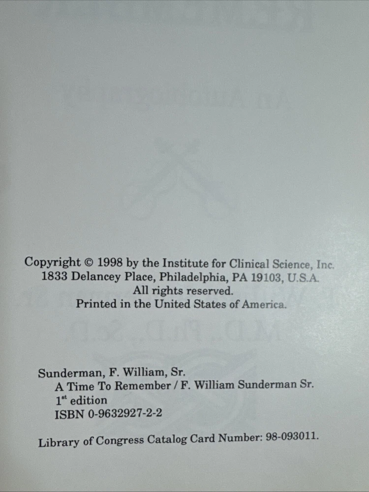 Explore the captivating journey of F. William Sunderman's life with "A Time to Remember: An Autobiography." This hardcover edition, published in 1998 by the Institute for Clinical Science, Inc, offers an insightful glimpse into the historical landscape of the 1900s as experienced by the author himself. The book spans 641 pages, allowing for a comprehensive look at Sunderman's experiences and accomplishments. This autobiography is a treasure for anyone interested in biographies and true stories, particularly those with an affinity for historical narratives. The book is elegantly leather-bound, adding a touch of luxury to your collection. With its focus on personal history and the legacy of one man's life, this edition promises to be a meaningful addition to any reader's library.