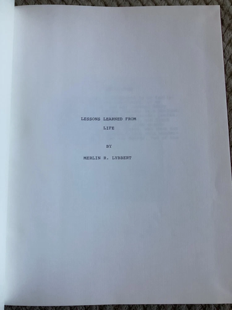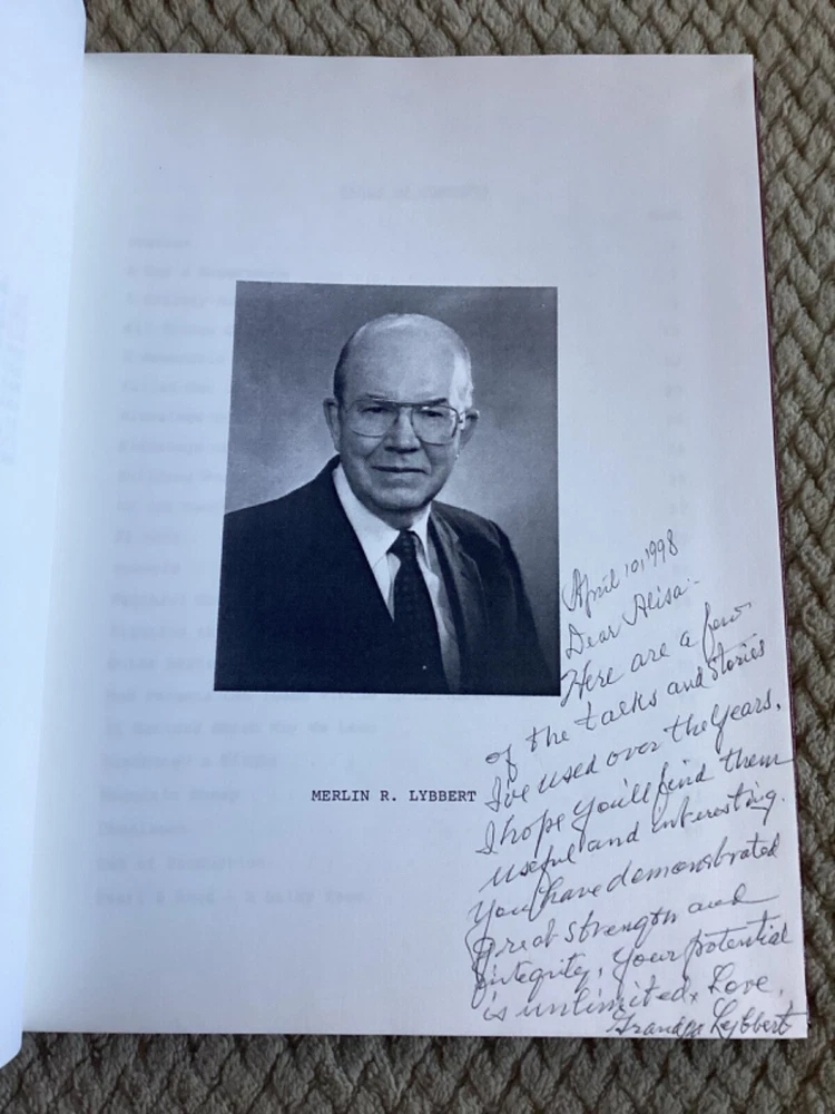 *Signed* Lessons Learned From Life by Merlin R. Lybbert (Leather Hardcover). Personalized, inscribed, and autographed by the author, to his granddaughter. Couple minor stains on side outer pages. See photos. The following is a compilation of church talks and lessons from the life of Merlin R. Lybbert. Merlin Rex Lybbert was a general authority of the Church of Jesus Christ of Latter-day Saints from 1989 to 1994. From 1992 to 1994, Lybbert was the thirteenth general president of the LDS Church's Sunday School. Lybbert was born in Cardston, Alberta, Canada