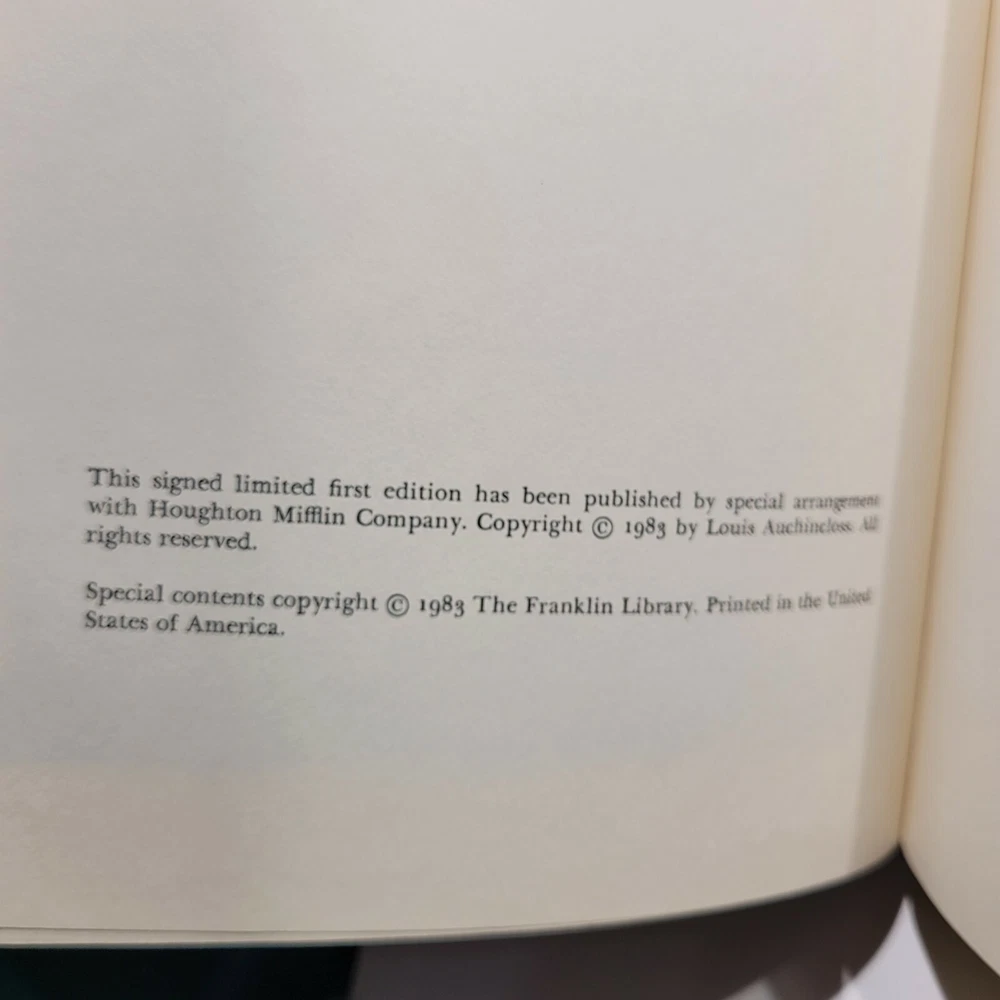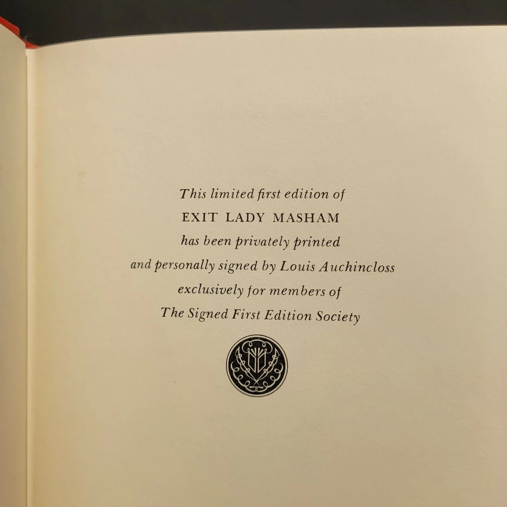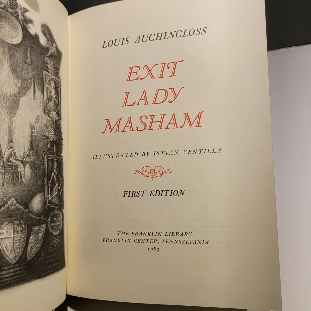 Signed Louis Auchincloss-Exit Lady Masham-Franklin Library 1983-1st Edition. This book is in near-mint condition. . Very very minor wear but you have to look to find it. Other than that this book is in mint condition. This is in rare condition. The illustrations in the book are fabulous. Oh, and again it is signed by Louis Auchincloss. See photos. 9" x 6".