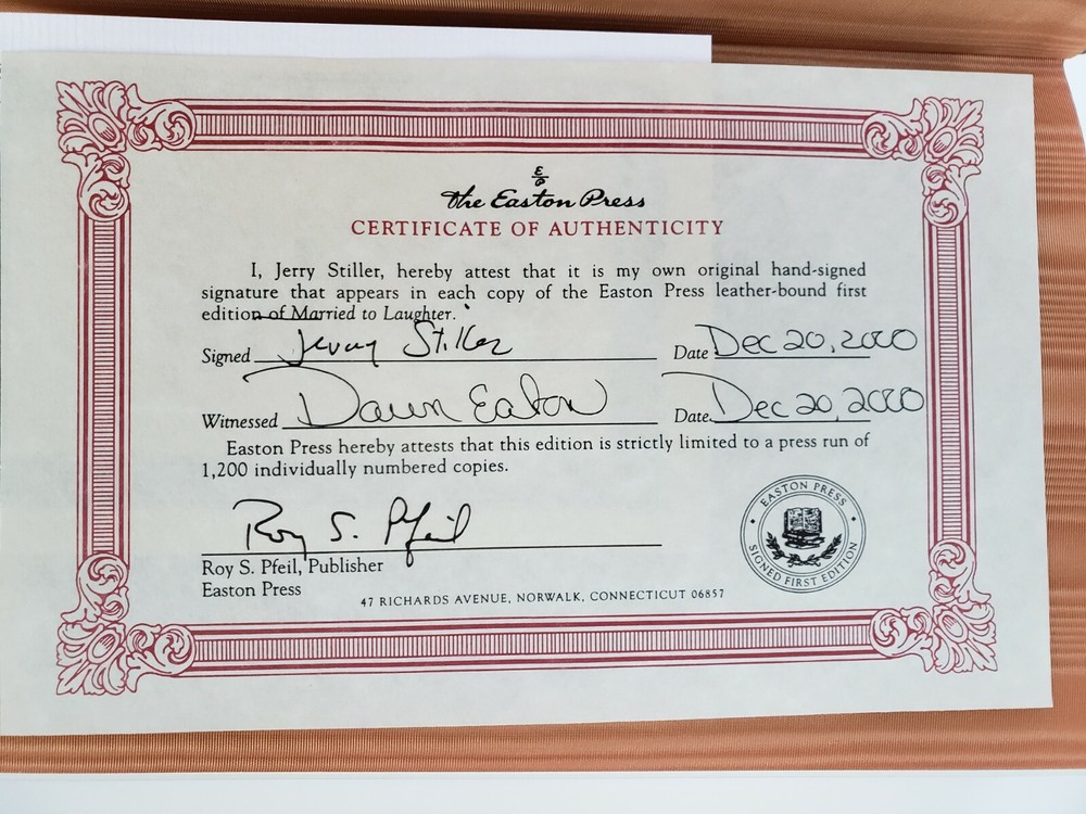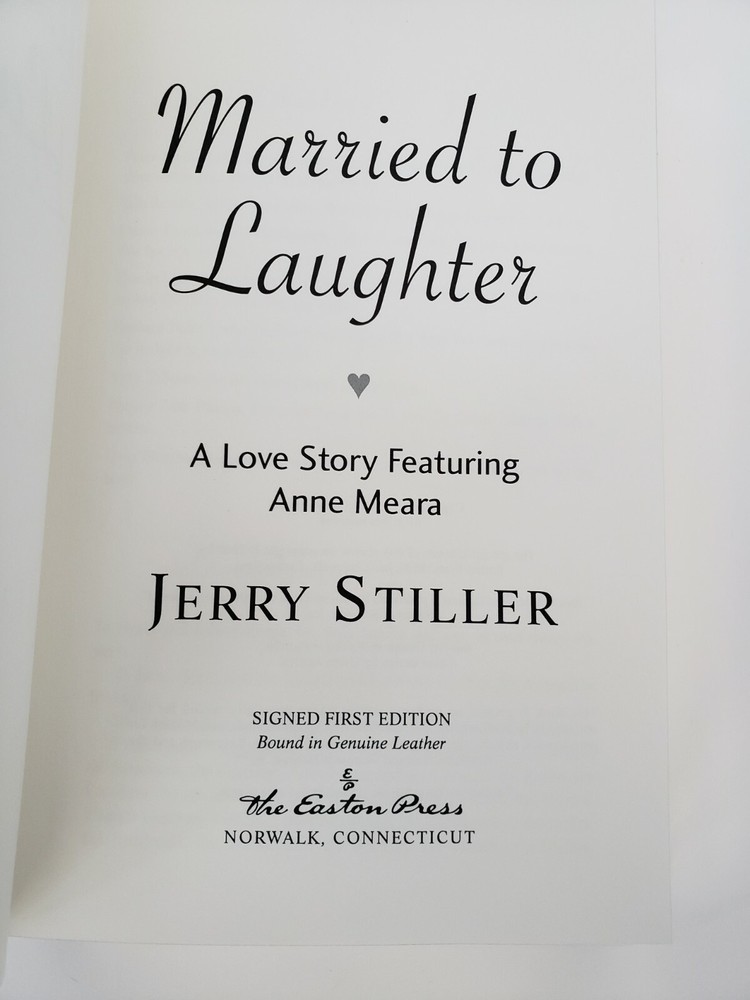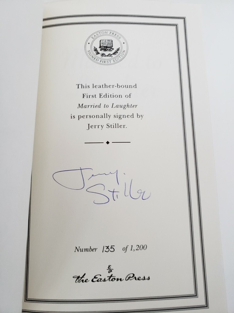 Married to Laughter By Jerry Stiller Signed by Jerry Stiller on the limitation page. Norwalk, Connecticut: The Easton Press, 2000. Limited edition of 1200 copies of which this is copy number 135. Bound in rich full leather - extensive gilt decoration on spine and both boards - raised bands on the spine - archival quality paper and satin ribbon bookmark. 8vo - 6 x 9”. 336 pp. Includes The Easton Press note and Certificate of Authenticity laid-in. Near fine. Minor rubbing to the exterior gilt edges. The interior is clean and solid. Please feel free to ask any questions. Sorry, "Best Offers" are not taken. Be sure to take a look at my store for similar items. Payment is requested as soon as possible. Shipment is made when payment has cleared. We will gladly combine shipping on multiple items to save on shipping costs. 100% Satisfaction Guaranteed - If you are not satisfied with your purchase, please contact us within 30 days of receiving the item. We consider a sale final after 30 days. All items must be returned with their original materials to receive a refund. Shipping is non-refundable.