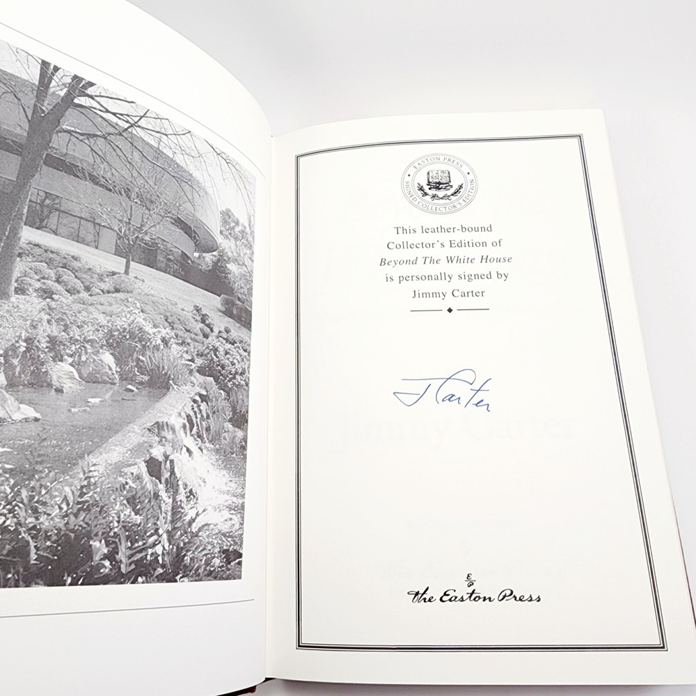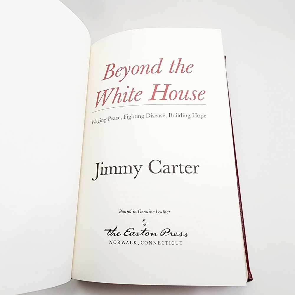 Beyond the White House Carter, Jimmy Signed by Jimmy Carter. Norwalk, Connecticut: The Easton Press, 2007. Bound in rich full leather with extensive gilt decoration on the spine and both boards, raised bands on the spine, archival-quality paper, and a satin ribbon bookmark. 8vo – 6" x 9 1/2". 272 pp. Very good. Minor to moderate rubbing to the exterior gilt edges. The interior is clean and solid. Be sure to take a look at my store for similar items. Please feel free to ask any questions. Payment is requested as soon as possible. Shipment is made when payment has cleared. We will gladly combine shipping on multiple items to save on shipping costs. 100% Satisfaction Guaranteed - If you are not satisfied with your purchase, please contact us within 30 days of receiving the item. We consider a sale final after 30 days. All items must be returned with their original materials to receive a refund. Shipping is non-refundable.