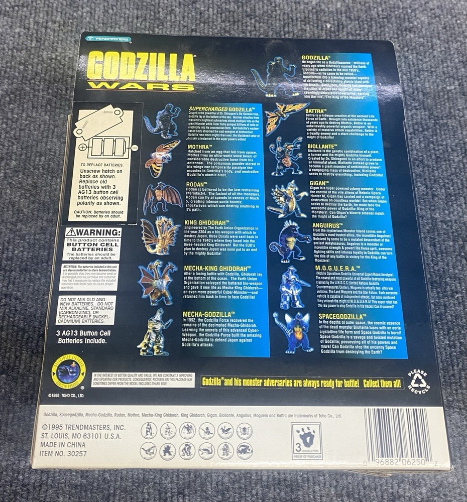 SPACEGODZILLA MONSTER ACTION FIGURE GODZILLA WARS 1995 TRENDMASTERS TOY ITEM HAS NEVER BEEN USED BUT THE SEAL HAS BEEN BROKEN PLEASE SEE PICTURES PROMPT AND SECURE SHIPPING If you have any questions, please contact me before bidding on the item. Pictures are of the actual Item. Any questions or concerns with the item you receive, please contact us first before opening a case. Shipping is usually handled in 1-2 business days. We ship items Monday-Saturday. With Free Shipping, we reserve the right to choose the shipping service. Thanks, and GOOD LUCK BIDDING!!