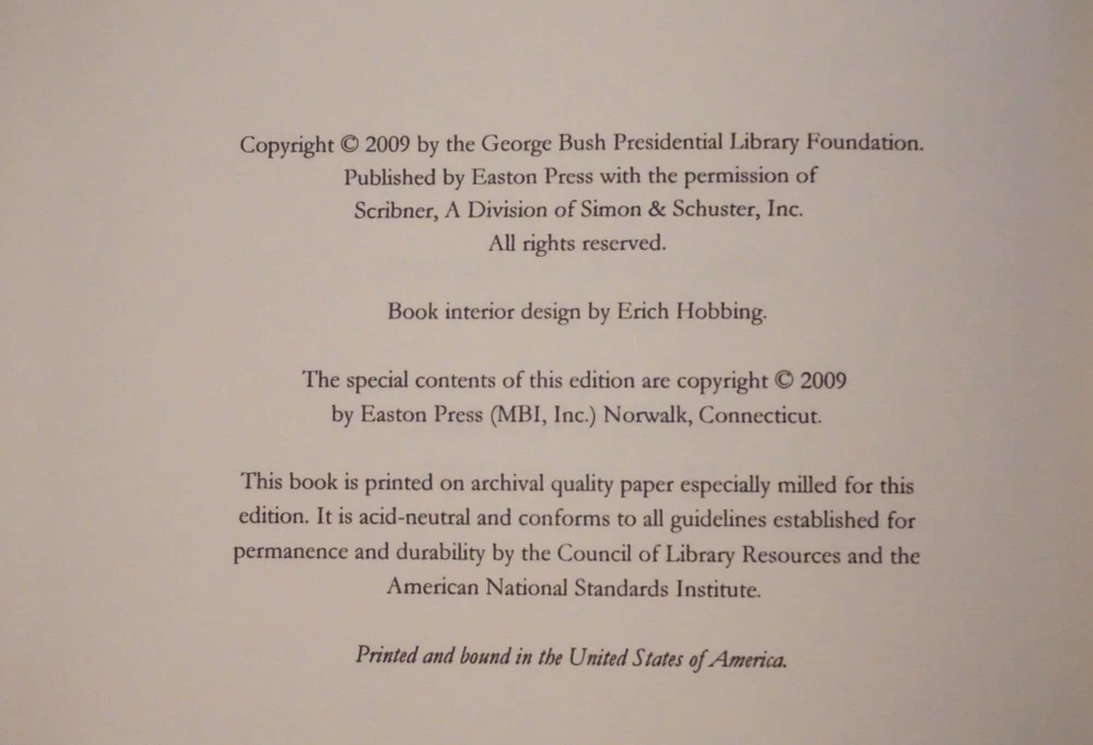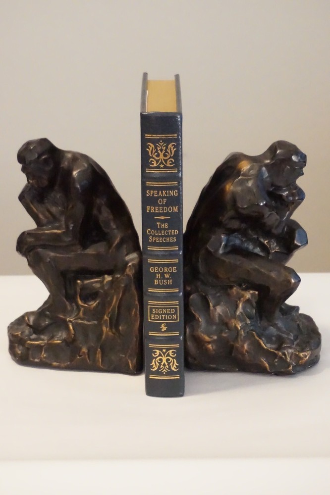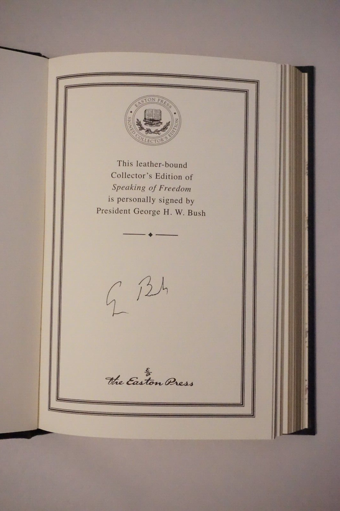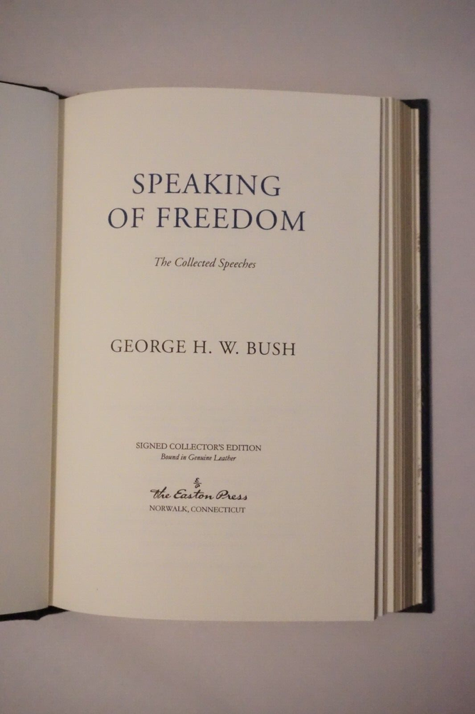 Wonderful signed copy of Speaking of Freedom: The Collected Speeches of George H. W. Bush. Published in 2009 by Easton Press of Norwalk, Connecticut. The leatherbound book is in very good condition for its age, with minor wear to the cover and edges. Great find at a great price! Please note the S&H charges, which include USPS postage, materials, and handling. Pictured bookends are not included in the sale. View our other eBay listings at Weiss Lane Books! https://www.ebay.com/str/Weiss-Lane-Books