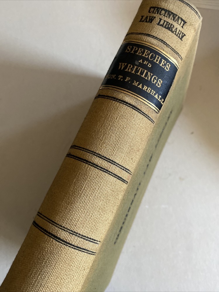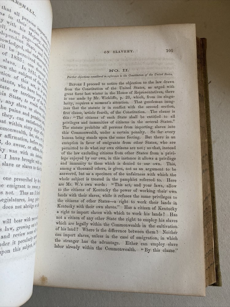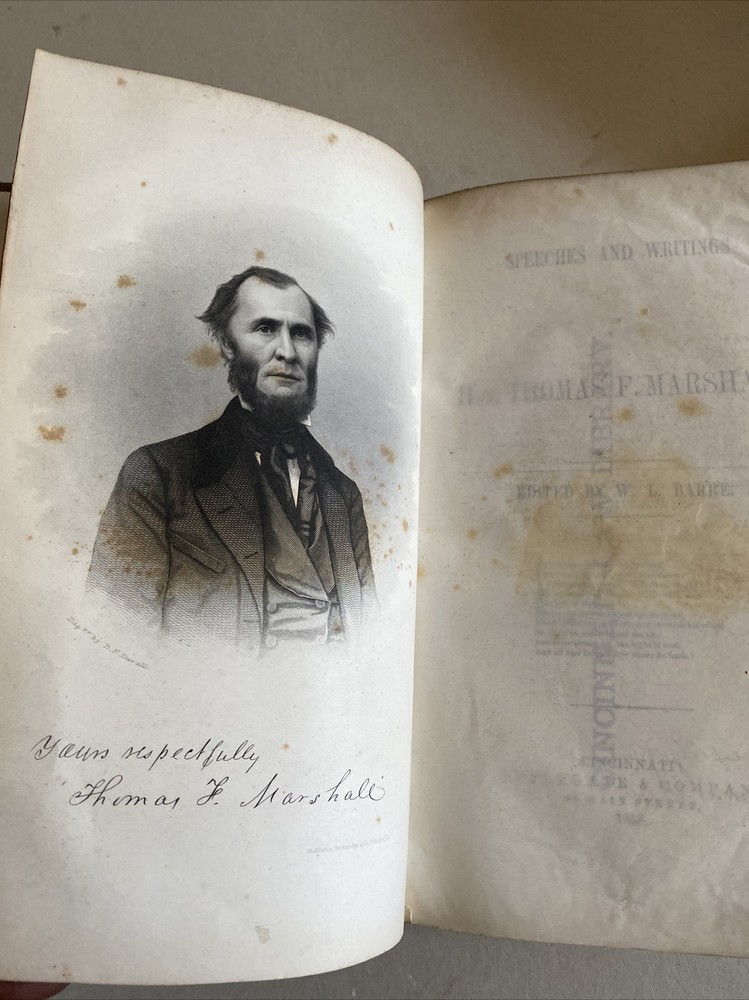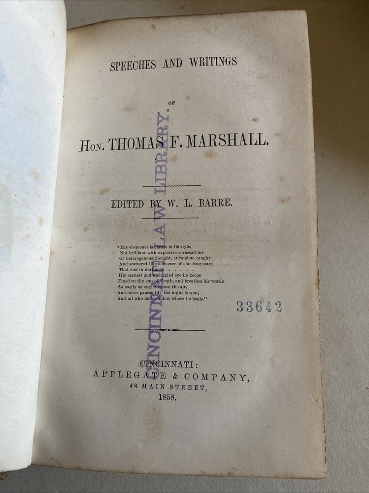 Title: Speeches and Writings of Hon. Thomas Marshall Editor: W.L. BarreYear: 1858Condition: Hardback with library stampings. Tight binding Thomas C. Marshall (July 21, 1784 – June 29, 1835) was a Virginia lawyer, planter and politician. He lived at Oak Hill plantation and represented Fauquier County in the Virginia House of Delegates from 1830 until his death in 1835. Mr. Marshall talks at length in this book about his pro-slavery political standings.