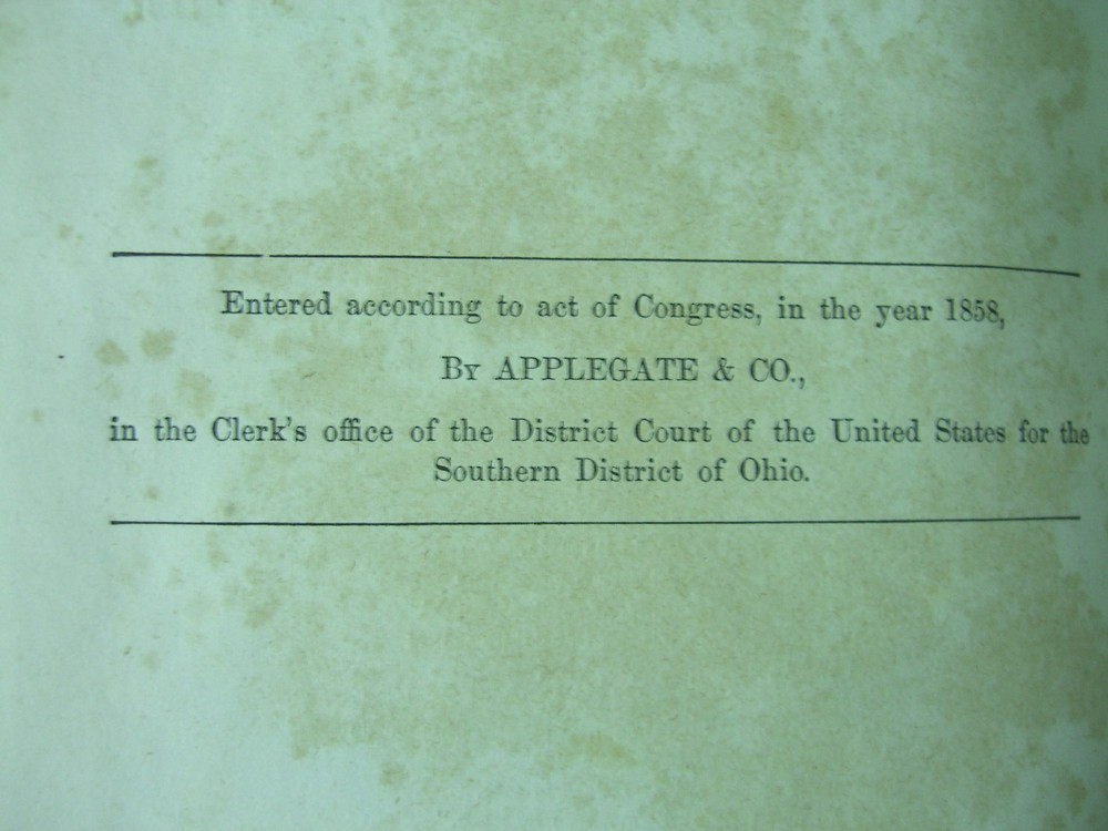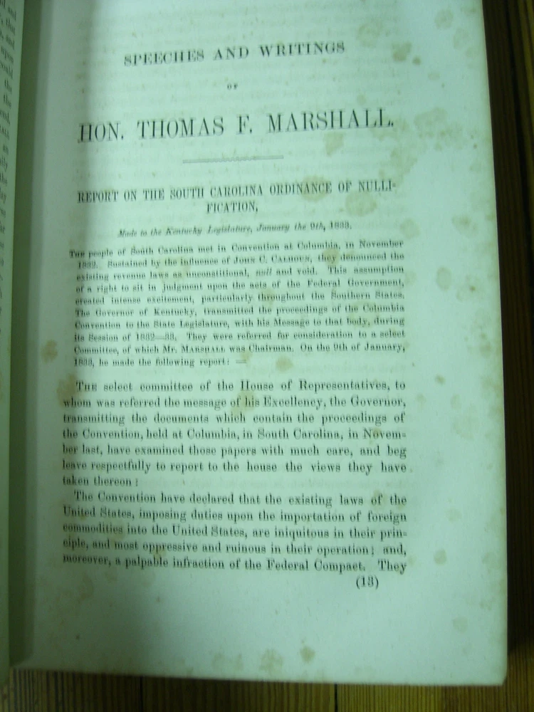 SPEECHES AND WRITINGS OF HON. THOMAS F. MARSHAL W. L. Barre Book Description: Applegate & Company 1858 Cincinnati the free press, nullification and politics, 1858. 462 Pages. Leather binding cracked on seem and starting to separate on both top and bottom. The tissue paper is removed from between the frontispiece and the title page. Foxing throughout, otherwise Very Good Condition. There is an inscription in fountain pen on the 1st end paper stating " Presented to J. W. Davis Esq. by S.J. Davis, Portsmouth, O(hio)."The frontispiece is the verso (left-hand page) opposite the recto title page Please ask for more pictures if necessary or visit my store for more unique items. Add me to your favorite sellers list too....Thanks for Looking!!!