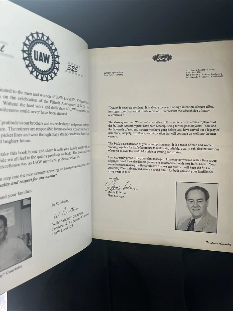 This book is in very good condition The spine is tight and sturdy. There are no missing pages. Any flaws are shown in the photos. The book being sold is the book in the photos. All books have been sanitized and there is no must or odor. Additional books can be purchased with combined shipping of an additional dollar. Ships fast- on the same or next day "The St. Louis Assembly 1948-1998 UAW Local 325 History Photos 50th Anniversary Ford" is a hardcover book published by UAW Local 325 in 1998 to commemorate the 50th anniversary of the Ford Motor Company in St. Louis, Missouri. This nonfiction book, written in English, features leather binding and illustrations, making it a valuable reference for adult readers interested in the history of UAW Local 325 and the Ford Motor Company in St. Louis."