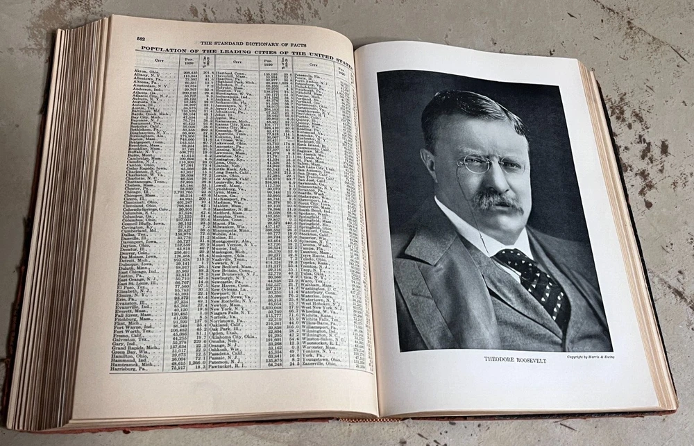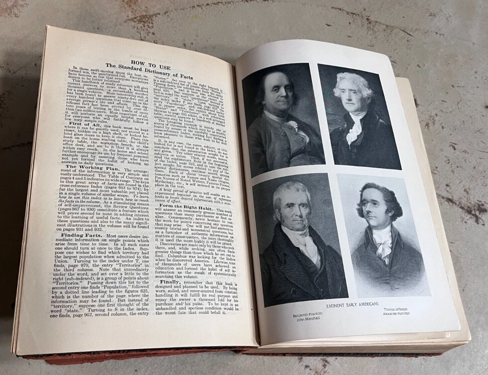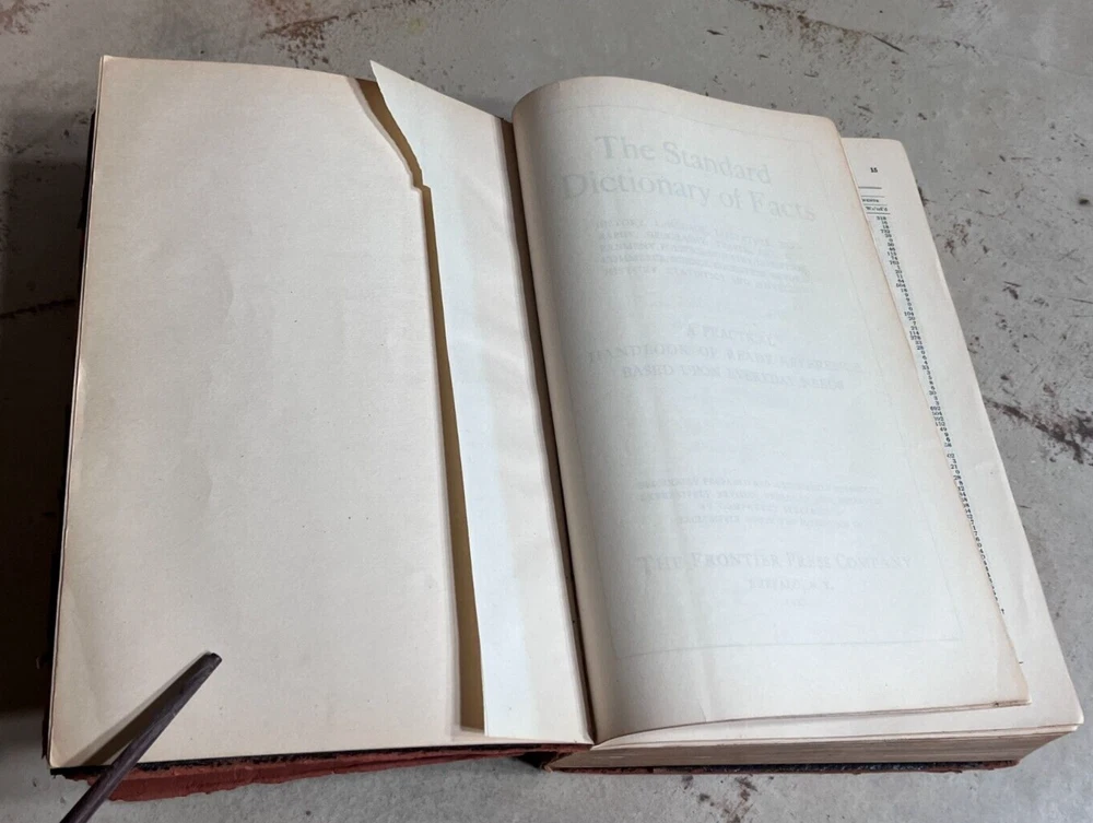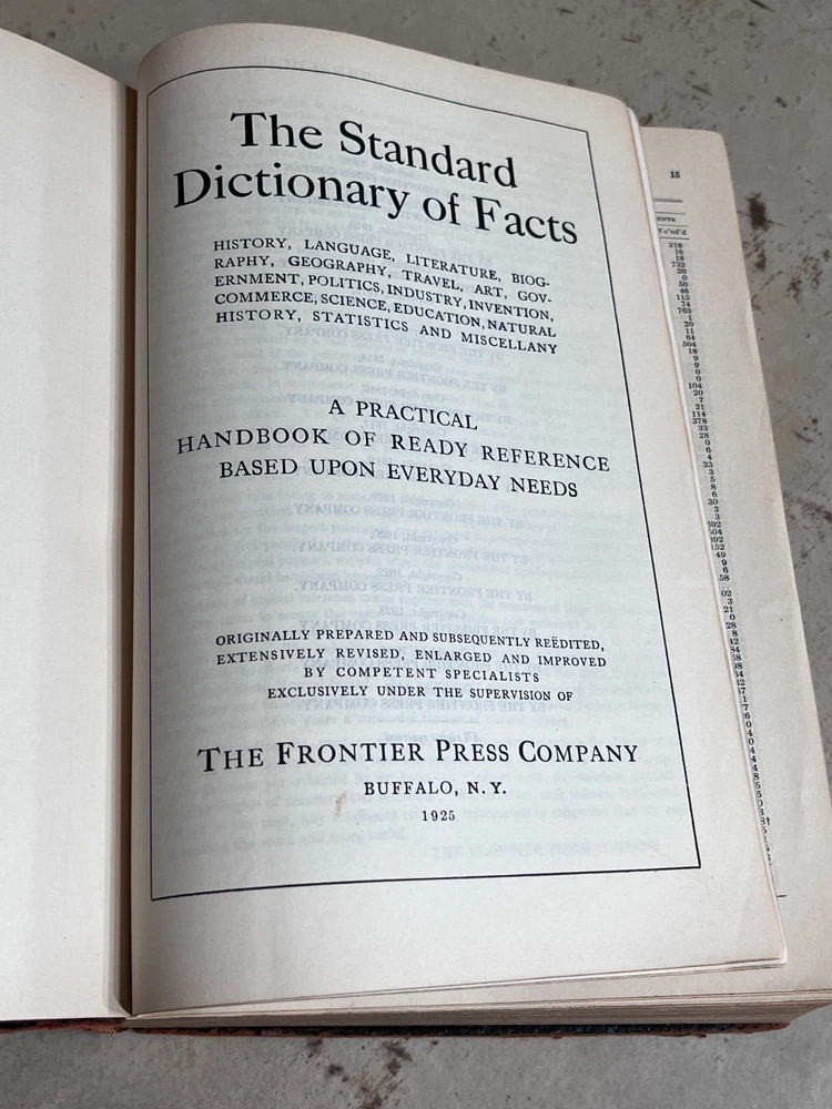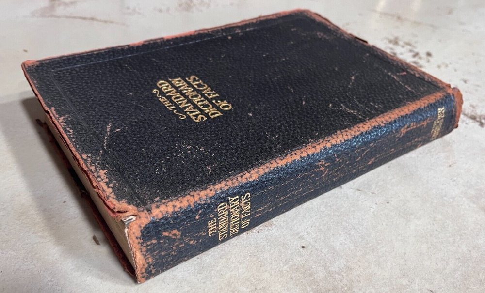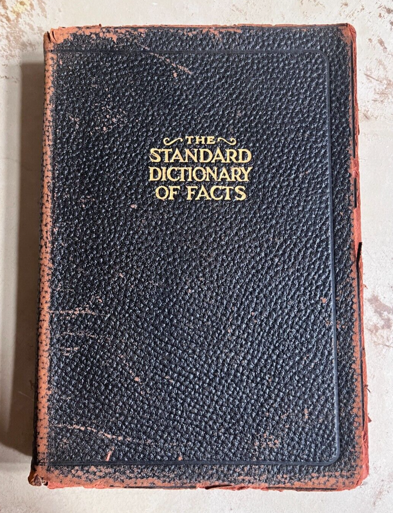 Antique THE STANDARD DICTIONARY OF FACTS c.1925 9.5” X 7” 974 pages History, language, literature, biography, geography, travel, art, government, politics, industry, invention, commerce, science, education, natural history, statistics, and miscellany; a practical handbook of ready reference based upon everyday needs, originally prepared and subsequently reëdited, extensively revised, enlarged and improved by competent specialists exclusively under the supervision of the Frontier Press Company. ~ Black Leather Cover with Gold Lettering on Cover and Spine Gilded Edges Black Satin Baroque Endpapers Black & White Portrait Illustrations PLEASE ASK ANY QUESTIONS YOU MIGHT HAVE. (see all photos)