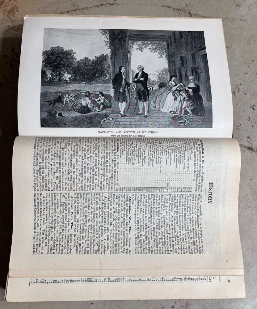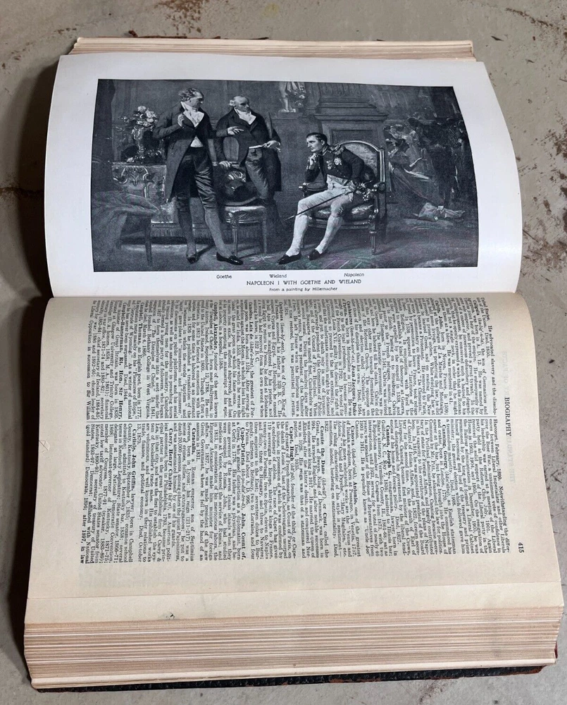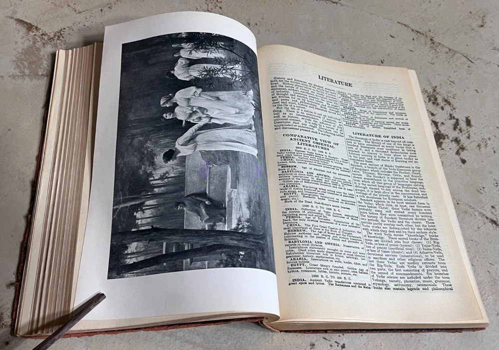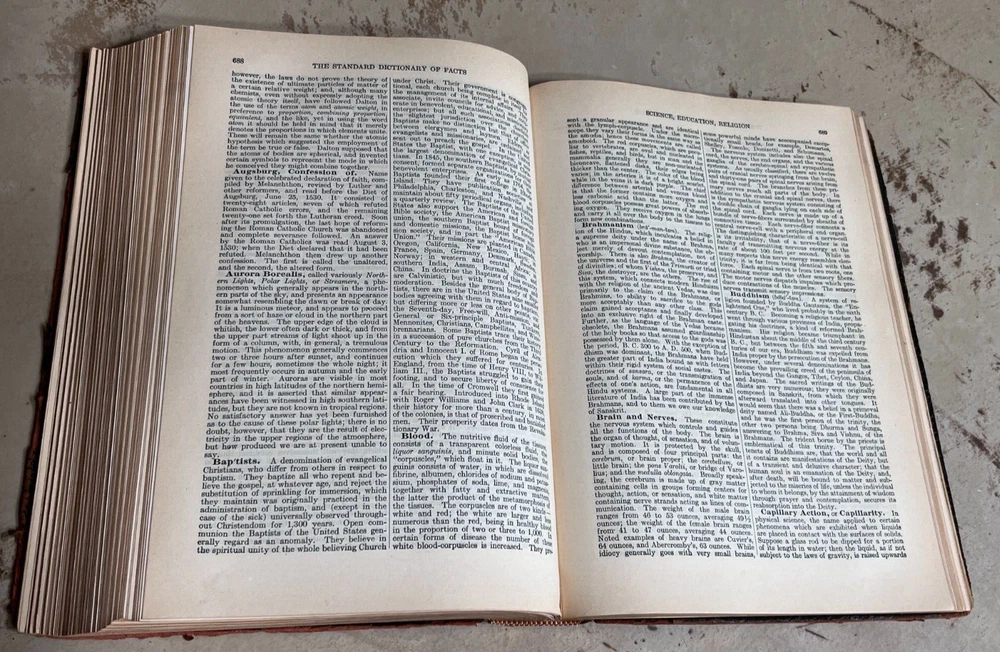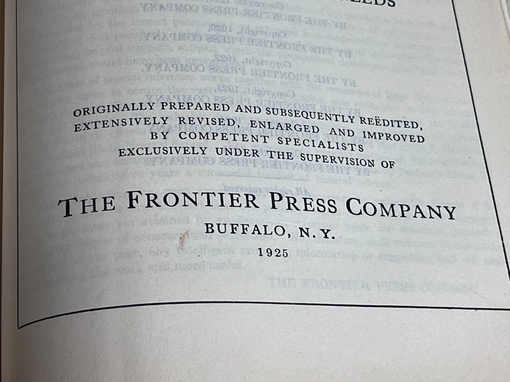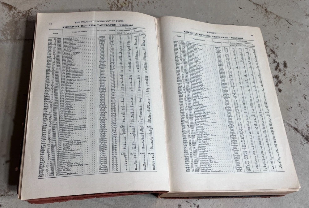 Antique THE STANDARD DICTIONARY OF FACTS c.1925 9.5” X 7” 974 pages History, language, literature, biography, geography, travel, art, government, politics, industry, invention, commerce, science, education, natural history, statistics, and miscellany; a practical handbook of ready reference based upon everyday needs, originally prepared and subsequently reëdited, extensively revised, enlarged and improved by competent specialists exclusively under the supervision of the Frontier Press Company. ~ Black Leather Cover with Gold Lettering on Cover and Spine Gilded Edges Black Satin Baroque Endpapers Black & White Portrait Illustrations PLEASE ASK ANY QUESTIONS YOU MIGHT HAVE. (see all photos)