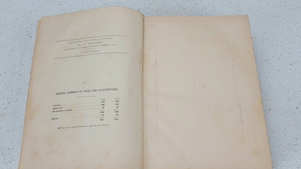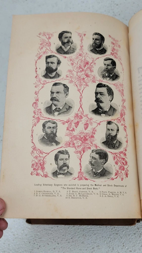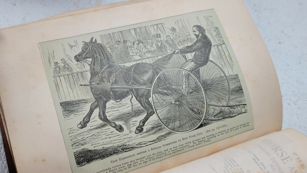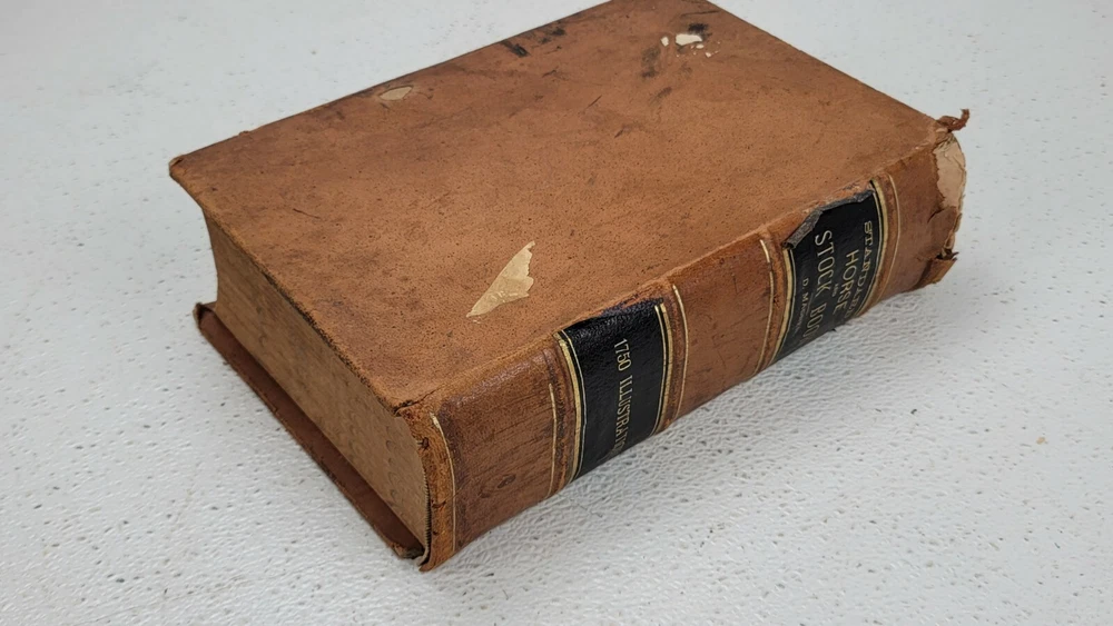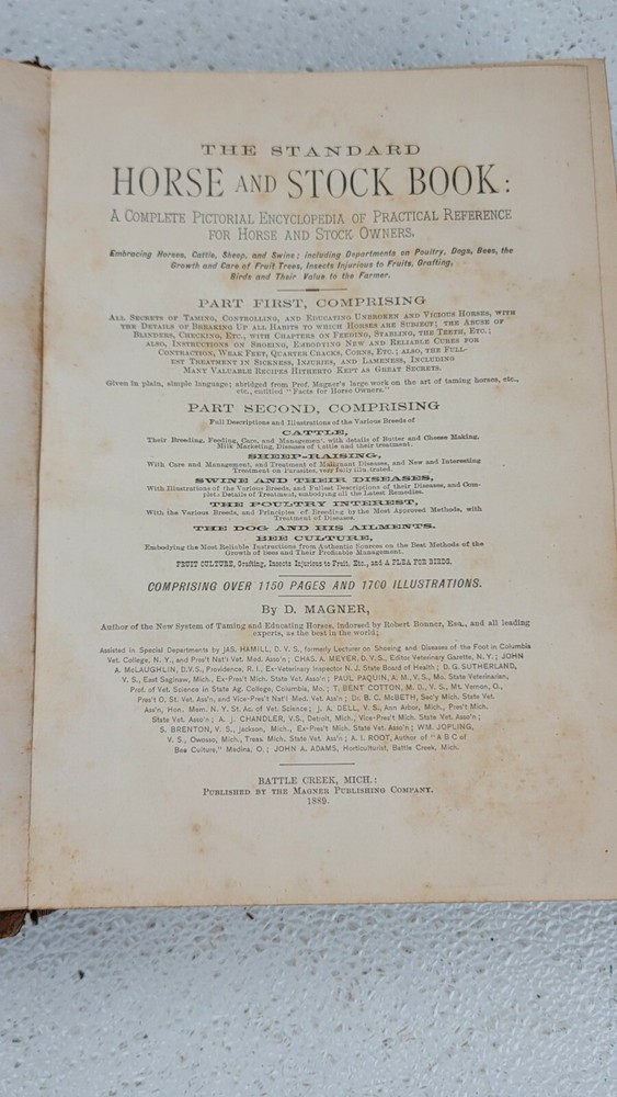 Book entitled: The Standard Horse & Stock Book Pictorial Encyclopedia Practical Reference for Horse & Stock Owners written by D. Magner dated 1889. Book was published by Battle Creek Magner Pub. Co with 1750 illustrations and is leatherbound.