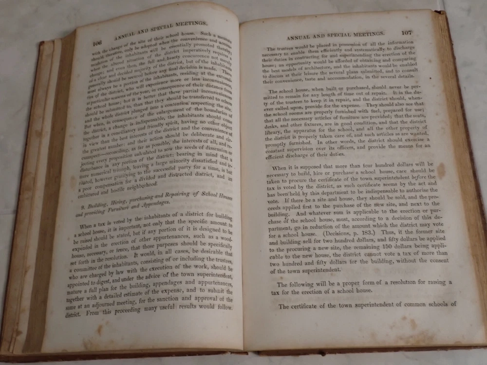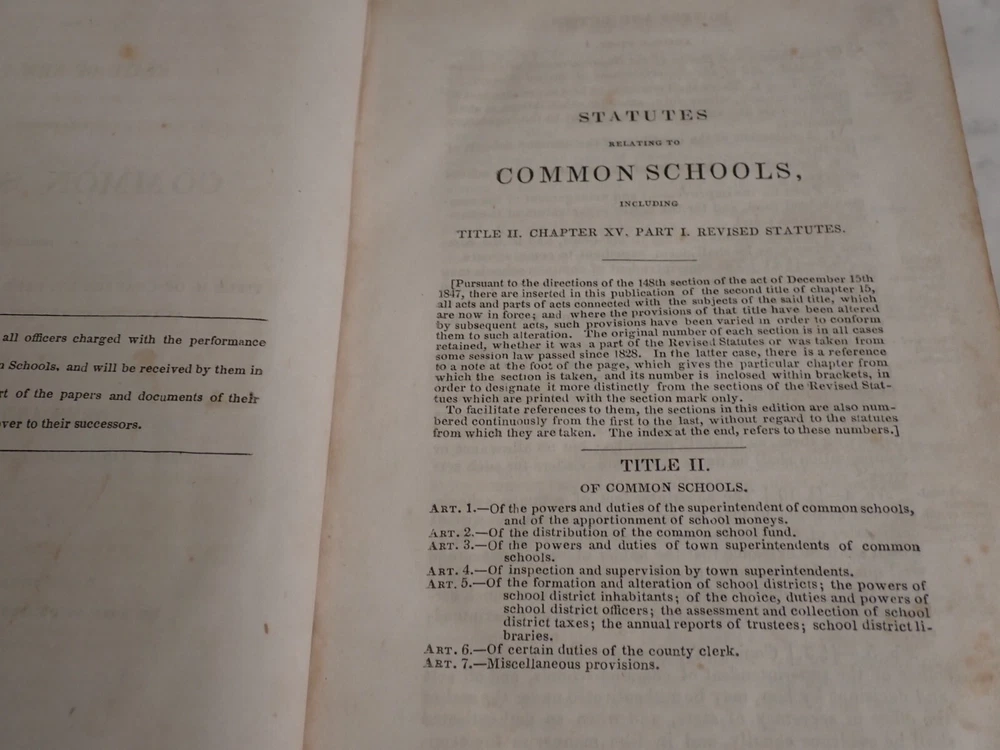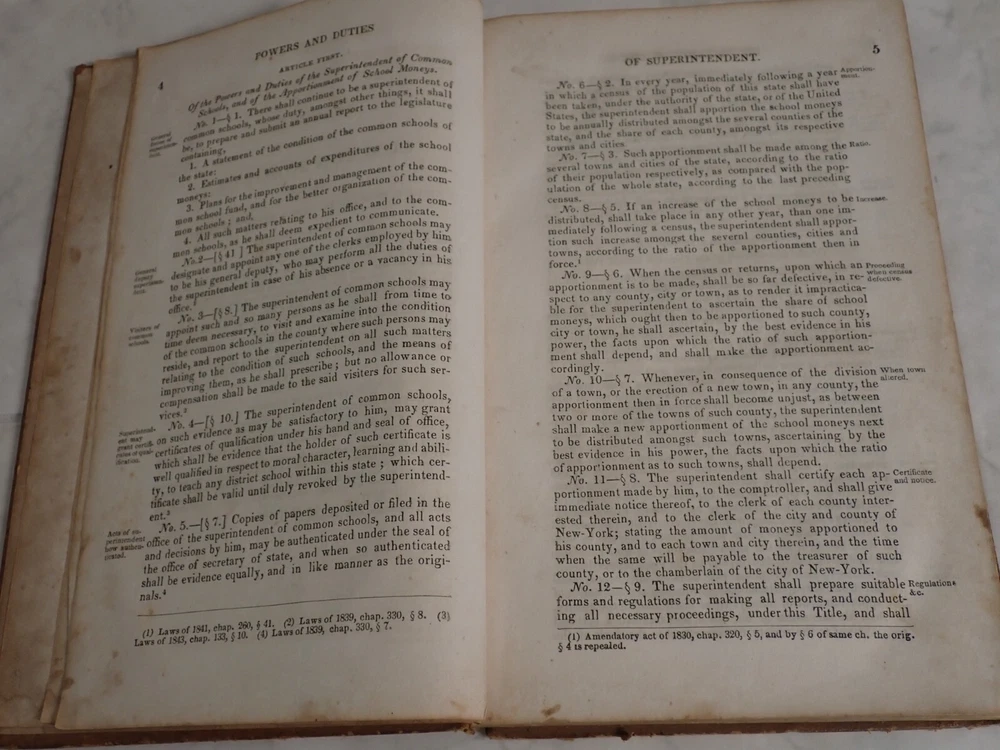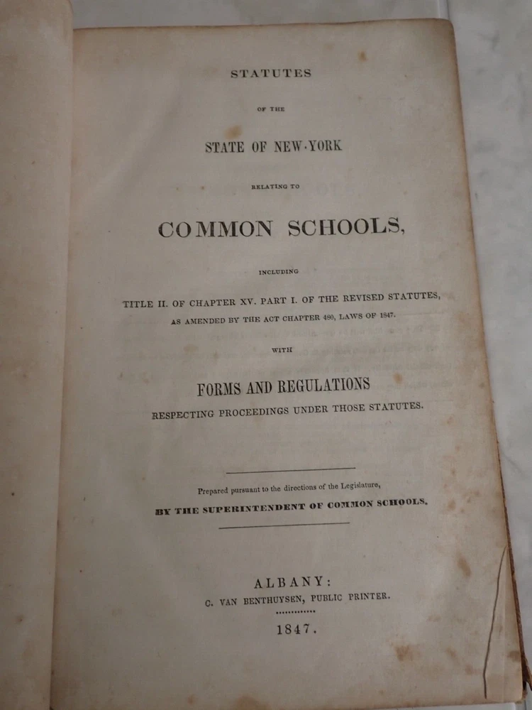 Statutes Of The State of New York Relating to Common (Public) Schools 1847 This book is in fair/good condition. Moderate wear around edges. Hinges splitting but holding. Rare book and shows why NY has been referred to as the Empire State from an early date! 215 pages. Dimensions approx. 5 5/8" x 8 7/8" Any questions, feel free to ask. SHIPPING FREE VIA LOWEST COST OPTION. Expedited can be had for additional cost. Just contact me before buying if you wish to pay for expedited shipping.