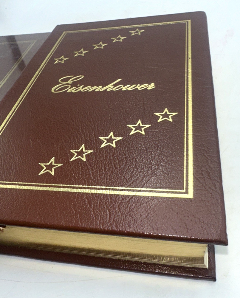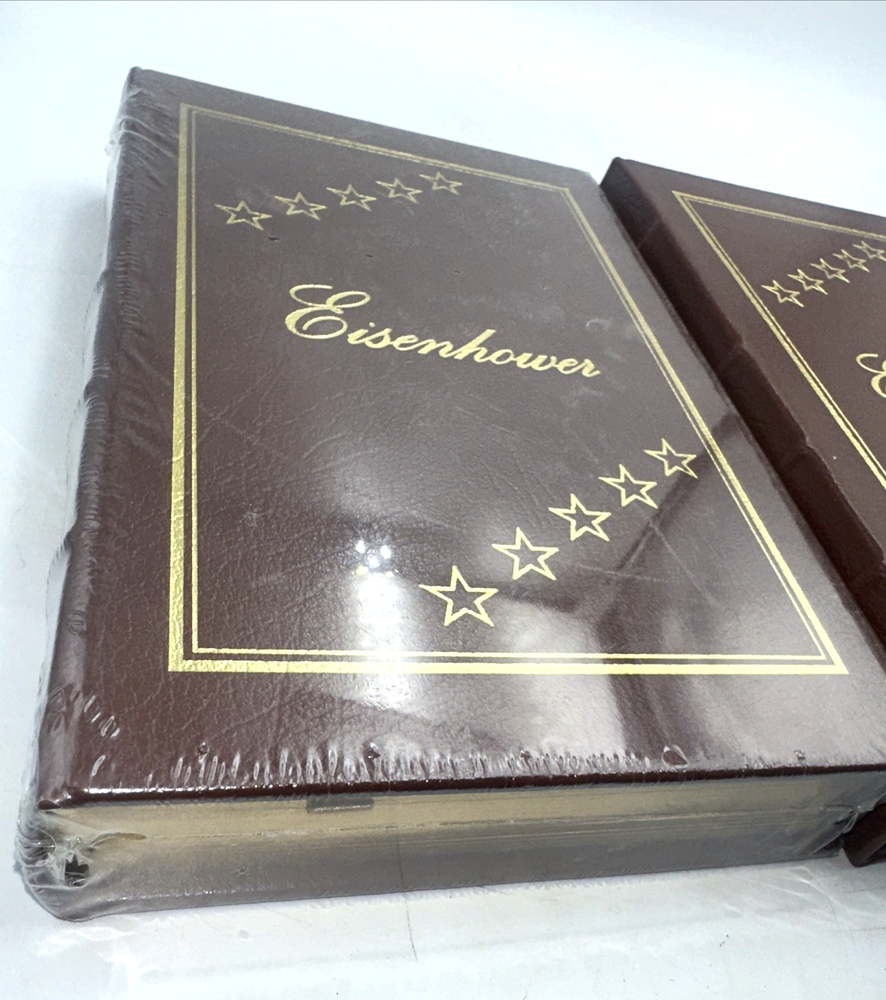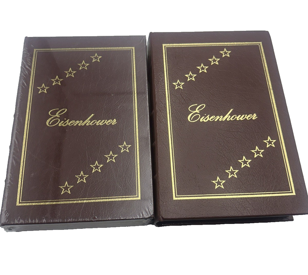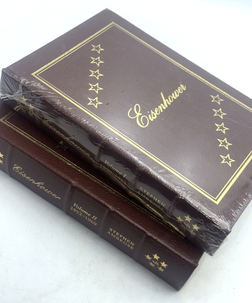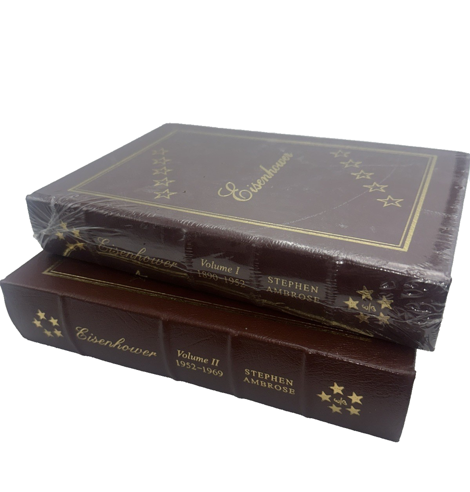 Eisenhower biography by Stephen Ambrose Documenting the life and achievements of the 34th President of the United States Two volume set published by Easton Press in 1987 Genuine leather binding, titled with 22kt gold Pages have gilt-tipped edges Both volumes are new / unused, volume 1 is sealed, cellophane wrapper was removed from Volume 2 but the book has not been opened/paged through Great gift set for an American history buff Sold as shown, see photos Estate sale find Visit our Cool Vintage Finds Store on eBay for other desirable collectibles