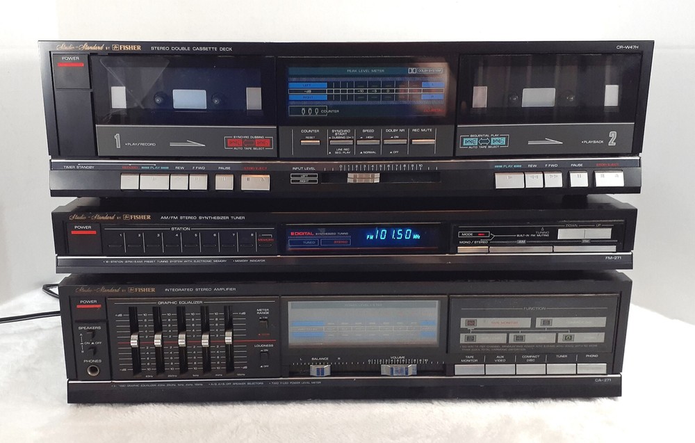 Studio Standard by Fisher 3-Piece Stereo Set. Finding all three of these components together is a rare feat! The tuner and cassette deck can only be powered by the amplifier. See item specifics for weights and dimensions. Integrated Stereo Amplifier (CA-271): Fully tested, fully functional. Volume & Balance Sliders have some tension and cause crackling. In excellent cosmetic condition. AM/FM Stereo Synthesizer Tuner (FM-271): Fully tested, fully functional. In excellent cosmetic condition. Stereo Double Cassette Deck (CR-W47H): Tested. Failure analysis found both belts need to be replaced. In excellent cosmetic condition. Selling As-Is due to cassette deck. See more vintage electronics in my store! Visit my store!