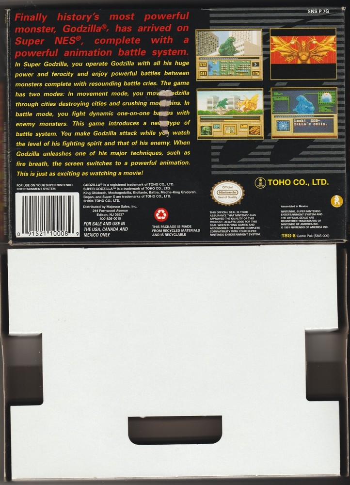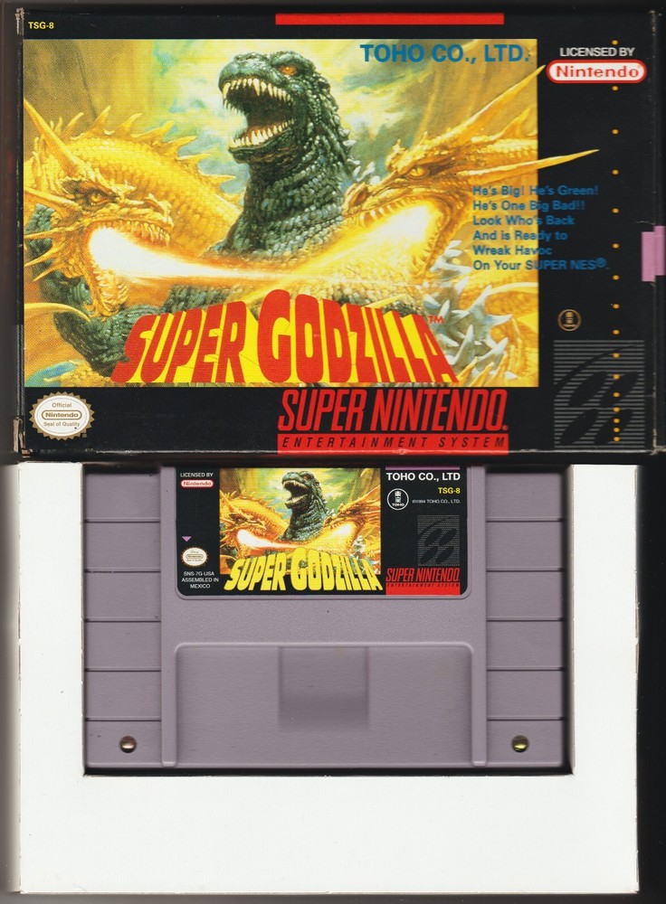 "Super Godzilla (1994) Super Nintendo Entertainment System, SNES". The Box is in Excellent Condition. In Like New Overall. This is the best one of these I have ever seen. See all pictures. You get: The Box, Box Insert, Original Bag, Registration Card, Game Cartridge, Instruction Booklet, "Consumer Information Booklet". I am the original purchaser of this item and has been in my non-smoking household collection all these years. Shipped via USPS Ground Advantage. Thanks for Looking!