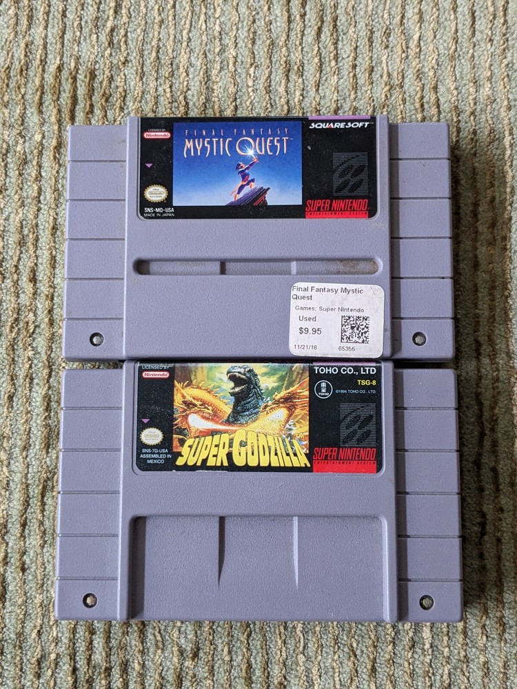 Please read the full description before purchasing. Hello, I am selling Super Godzilla & Final Fantasy Mystic Quest. They are the cartridges only in very good condition with minor wear. Games have been tested and work. Will be shipped in a cardboard box, well protected.