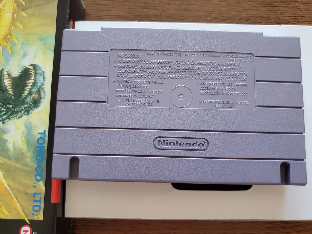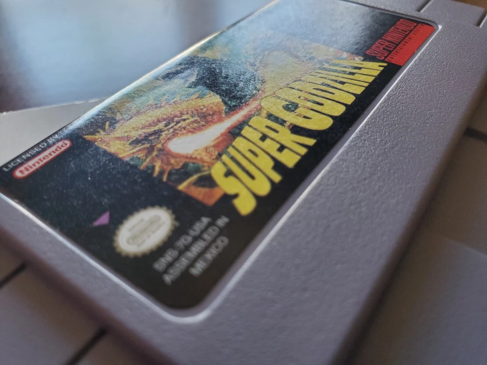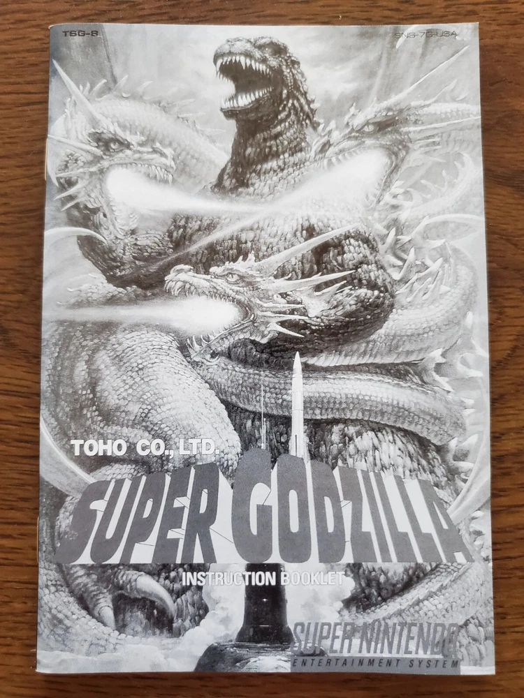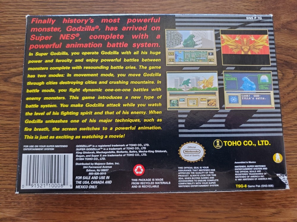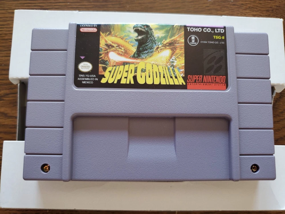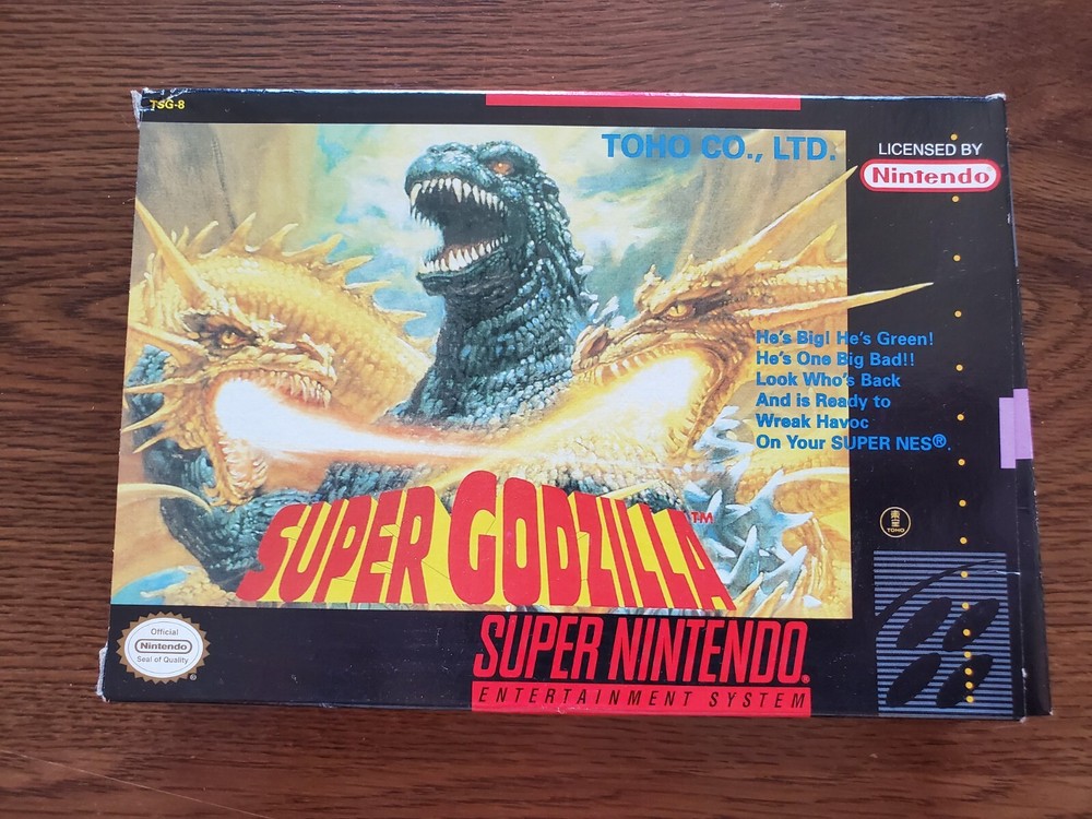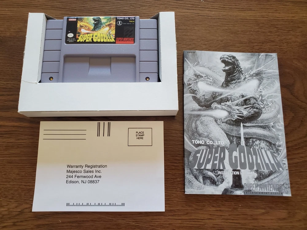Super Godzilla SNES Complete. There is some writing on the inside box case, otherwise everything is in great condition and it even comes with the registration card. I have many other rare games for offer so feel free to check my other sales and save on shipping! Thanks for looking!