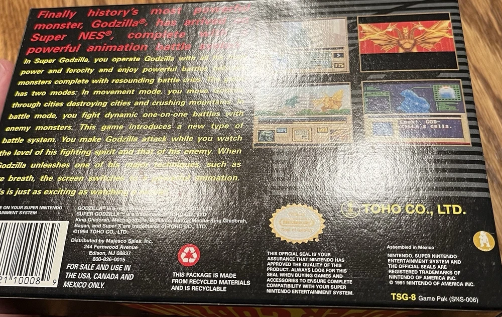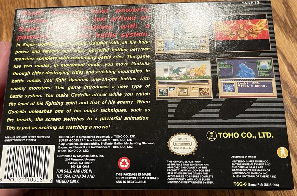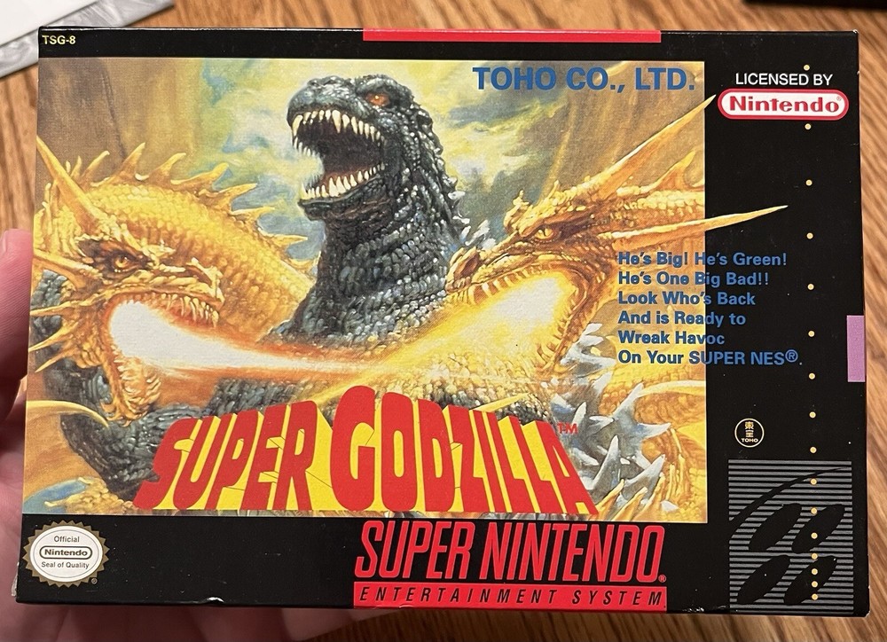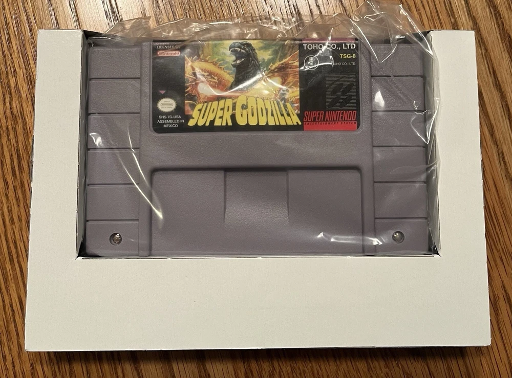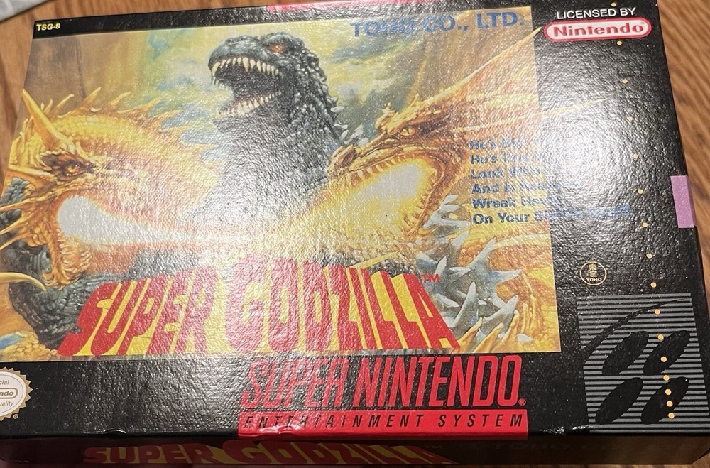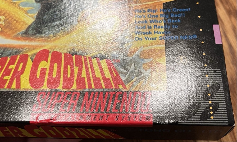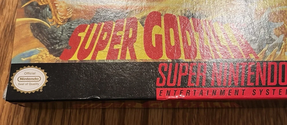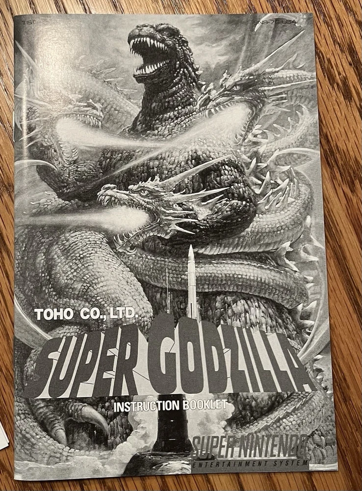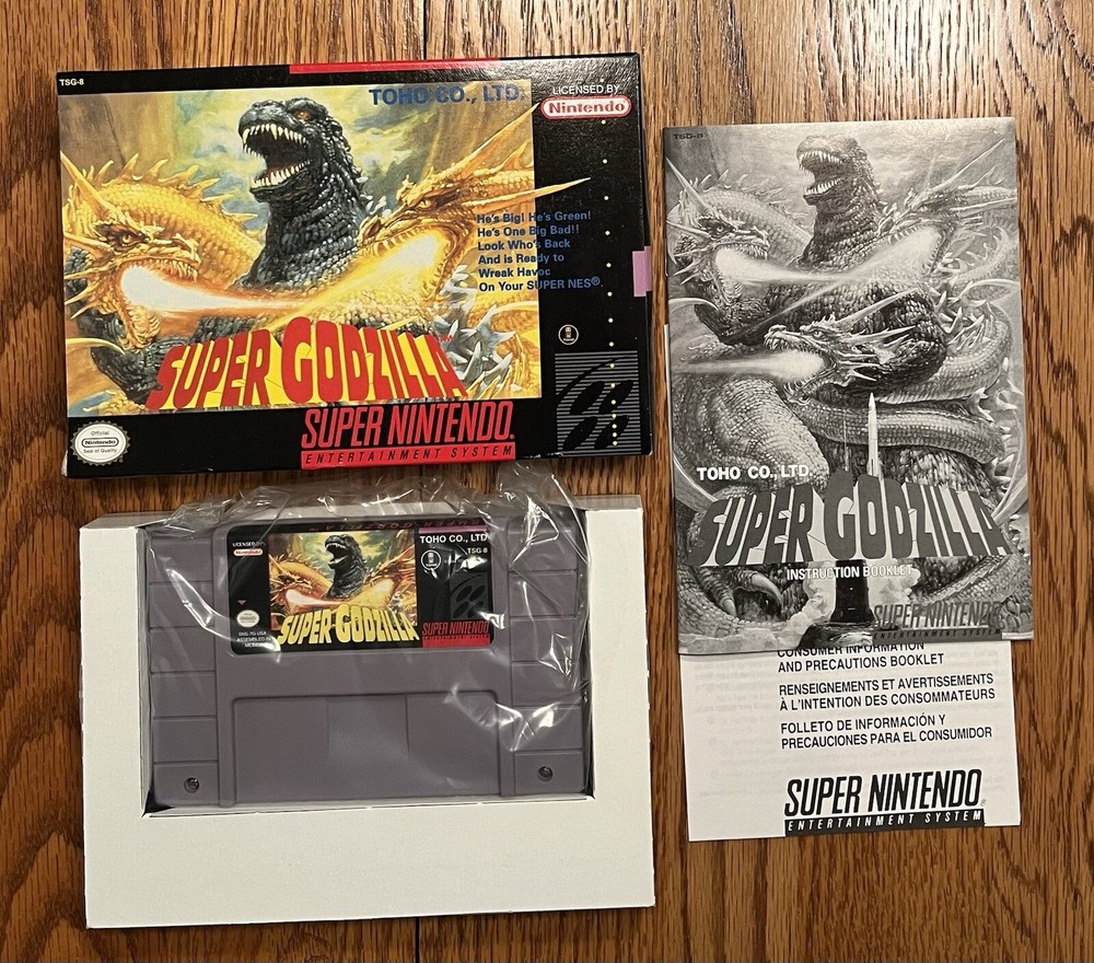 Super Nintendo SNES Super Godzilla With Box And Manual Tested Working. Includes box, manual and game. Cartridge and manual are in very nice shape. Box is in good shape with some minor imperfections along edges and a few corners. See pics.