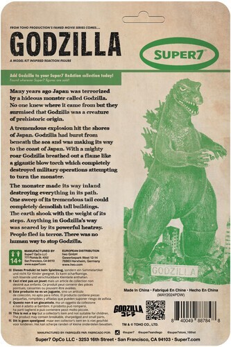 Rest easy, Godzilla fans- the new Model Kit Godzilla comes fully assembled and ready to display in your collection! The new 3.75” scale articulated Toho ReAction Figure of Model Kit Godzilla is inspired by the Canadian variant of the original model kit developed under the Toho license in the 1960s and features the mighty prehistoric monster posed among a removable, soon-to-be-destroyed cityscape. The only assembling you’ll have to do is adding one of these Model Kit Godzilla ReAction Figures to your collection of Kaiju creations! Materials: Injected Plastic & Paint Ages 14+ Country of origin: China