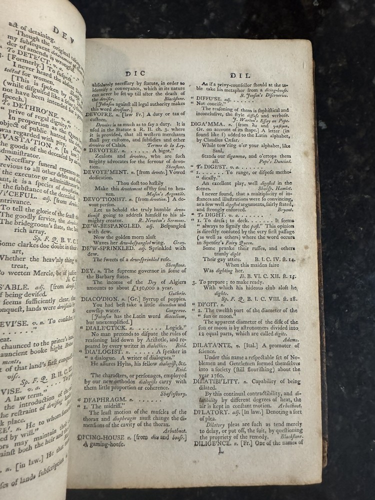 This rare first American edition of Mason's supplement to Johnson's Dictionary is a fascinating piece of lexicographical history. Though the front board is loose, the text remains intact with clean pages showing only minor spotting—a remarkable survivor from 1803 that offers valuable insights into early attempts to refine English language definitions. A must-have for collectors of antique dictionaries!