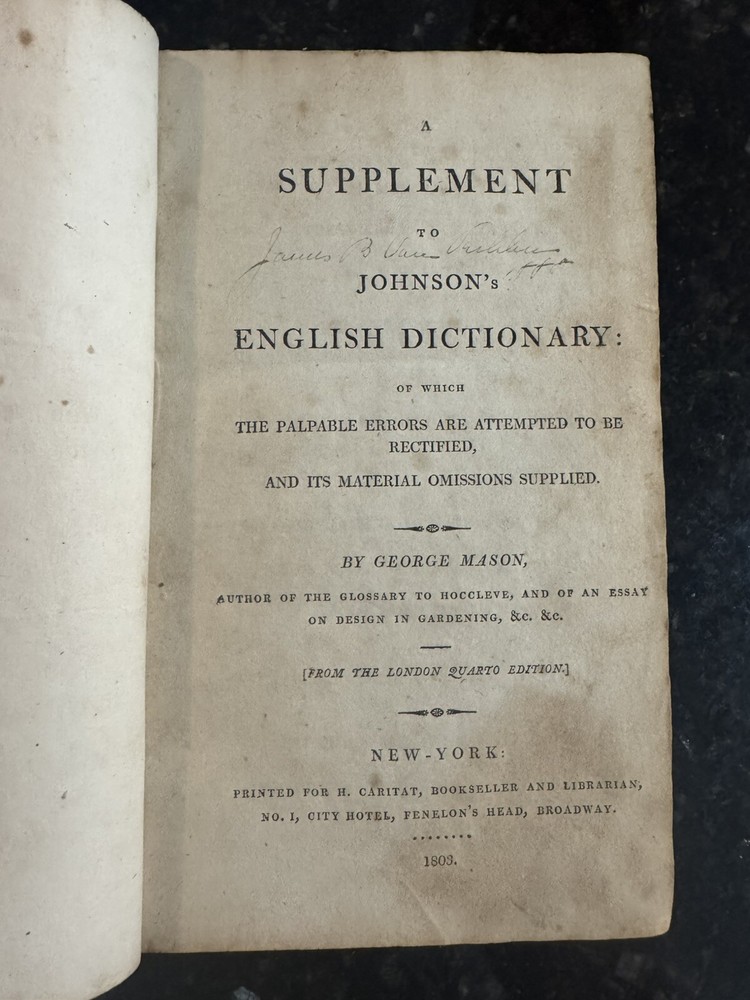 A supplement to Johnson's English Dictionary: of which the palpable errors are attempted to be rectified, and its material omissions supplied Mason, George Published by printed for H. Caritat, bookseller and librarian, New York, 1803 Front board nearly separated, the rest of the book is in good condition, fly pages present, some light spotting.
