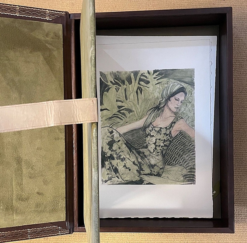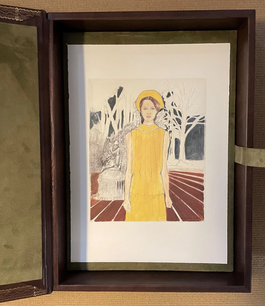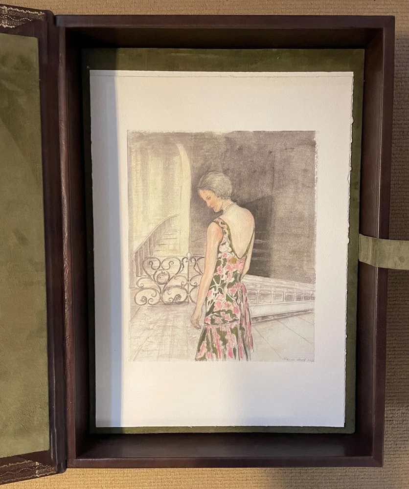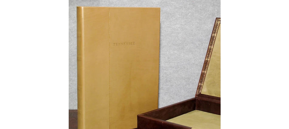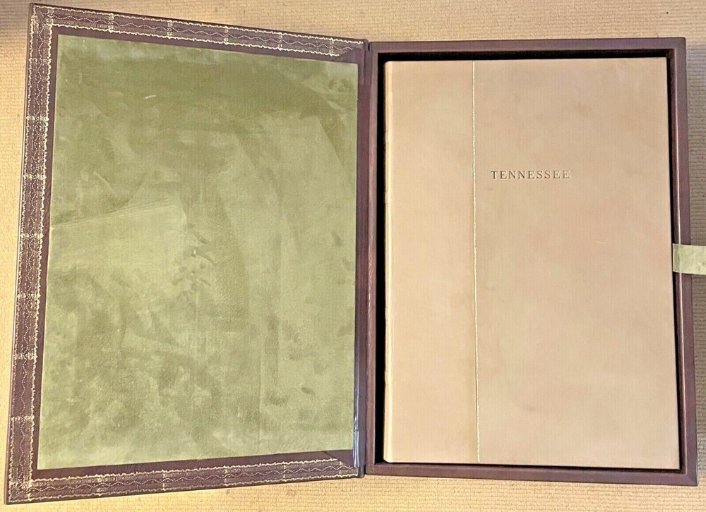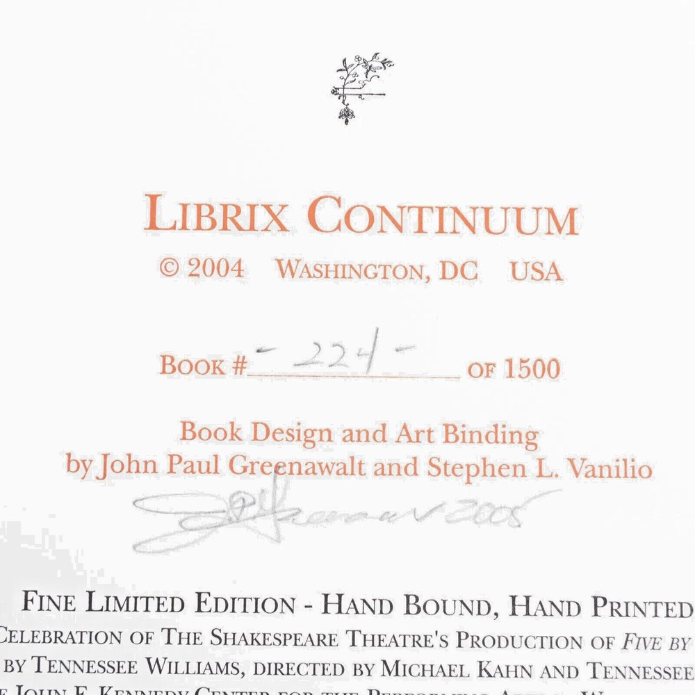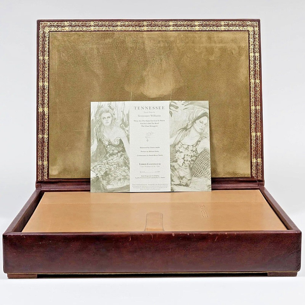TENNESSEE. THREE PLAYS by TENNESSEE WILLIAMS: THESE ARE THE STAIRS YOU GOT TO WATCH. CAT ON A HOT TIN ROOF. THE GLASS MENAGERIE. WASHINGTON, D.C.: LIBRIX CONTINUUM, 2004. PRICED AT $3500 ON ABEBOOKS. Elephant folio, elaborately produced, bound in full Italian leather and housed in full leather box, all contained within green publisher's box. Included are 6 full page illustrations by artist Clarice Smith. Three are loose and PENCIL SIGNED illustrations relating to Glass Menagerie , the other 3 bound in ( one of Maggie the cat). Limited edition, this 224 of 1500 copies, numbered and signed on the title page by one of the book designers and binders John Paul Greenawalt, the other Stephen L. Vanilio. ELEPHANT FOLIO LETTERPRESS IN FOUR COLORS OF INK BASKERVILLE OLD FACE ON RABRIANO RUSTICUS HAND SEWN SIX FULL PAGE ART PLATES IN COLOR: 3 HAND-SIGNED LOOSE; 3 BOUND IN VEGETABLE TANNED TUSCAN CALF FULL LEATHER BINDING HAND PAINTED ENDLEAVES IN MID-CENTURY PATTREN VEGETABLE TANNED TUSCAN CALF LOW CHEST CONTAINS BOOK AND PRINT SET, HAND TOOLED IN GOLD, AND FULLY LINED GENUINE SUEDE The book was produced in celebration of The Shakespeare Theatre's Production of "Five by Ten", five one-act plays by Tennessee Williams directed by Michael Kahn and Tennessee Williams Explored at the John F. Kennedy Center for the Performing Arts in Washington DC. in 2004. Folio, unpaginated, text double column. Dark brown leather case has corner devices, elaborate inner dentelles and interior olive suede lining. A sumptuous production. CONDITION: unobtrusive handling covers; inside as new.