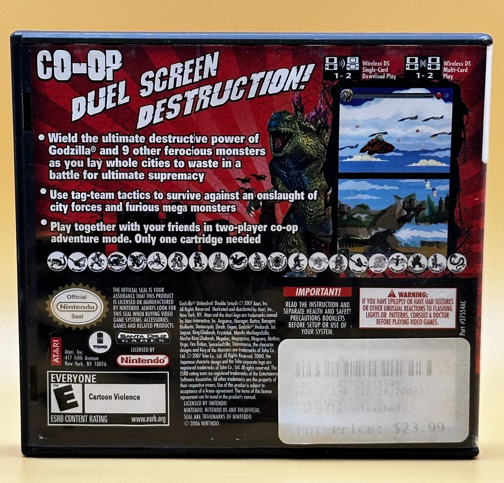 This Godzilla Atari game comes with the case, the manual is not included. The game is tested and working. Pre-owned. The case has some visible wear from handling and time. Please review all photos for condition and ask any questions as this is sold as is. Your item will be packaged with care. I use recycled material whenever possible. To ensure satisfaction with your items, I photograph and record the entire packing process. Returns will only be accepted if the item is returned in the same condition it was sold. Thank you for your time! :)