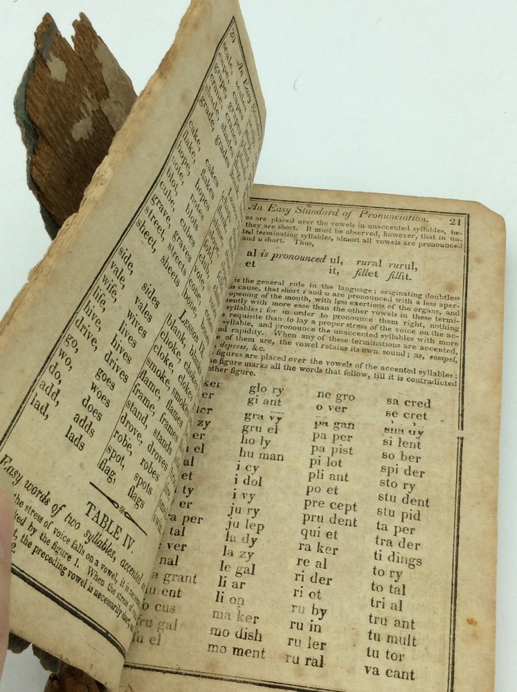 Noah Webster THE AMERICAN SPELLING BOOK; Containing the Rudiments of the English Language, for the Use of Schools in the United States. Brattleboro, VT: Holbrook and Fessenden, 1823. Leather. 158p. A leatherbound book in POOR CONDITION. The front cover is badly torn and weakly held together with clear tape. The spine and back cover are heavily chafed as well. Pages edges worn and last page of text torn. Foxing and toning throughout. Pages remain tightly bound despite external damage. OFFERED AS-IS. Item #195022 After Webster's copyright expired in 1818, there were numerous pirated editions of his spelling book. This is an edition from Vermont printed in 1823.